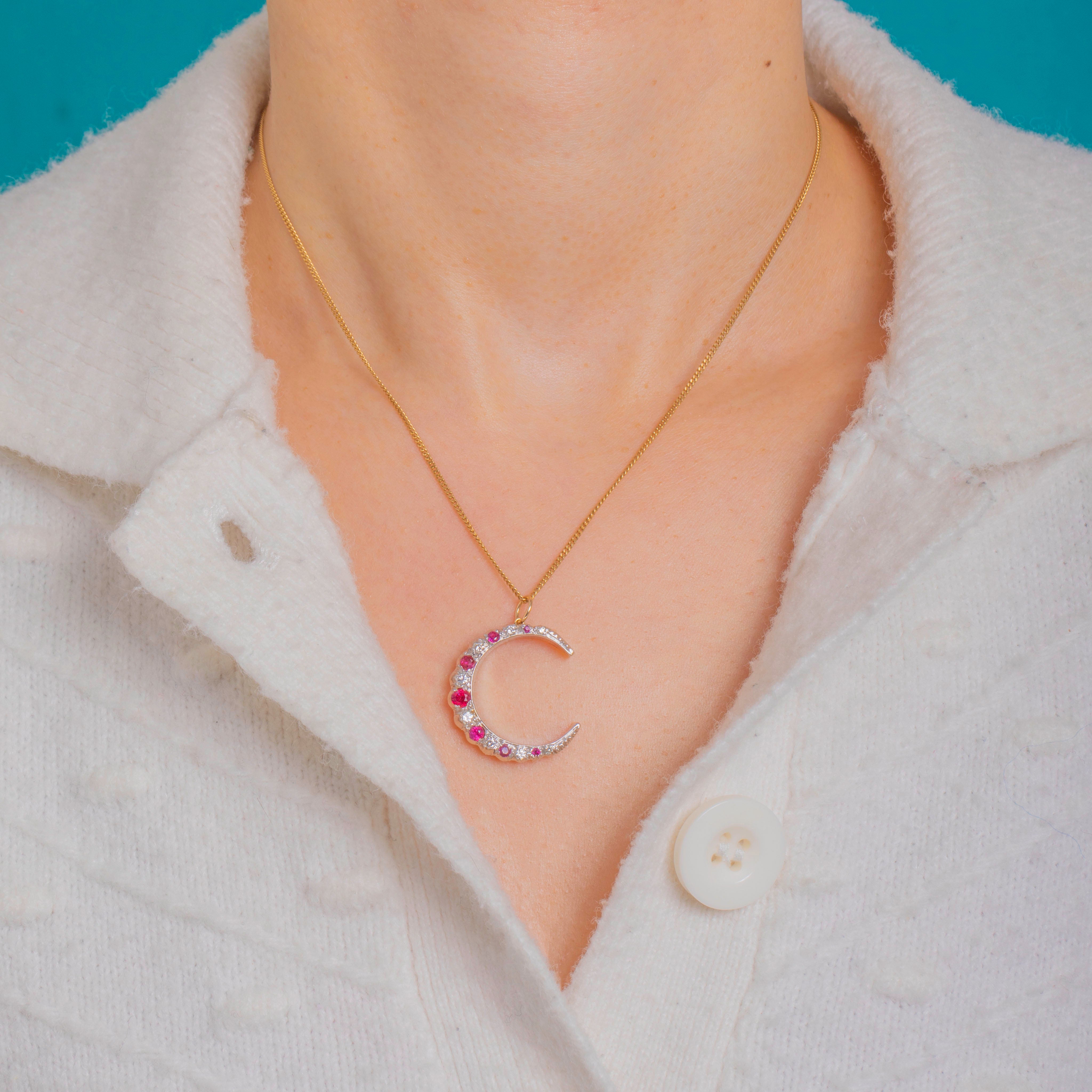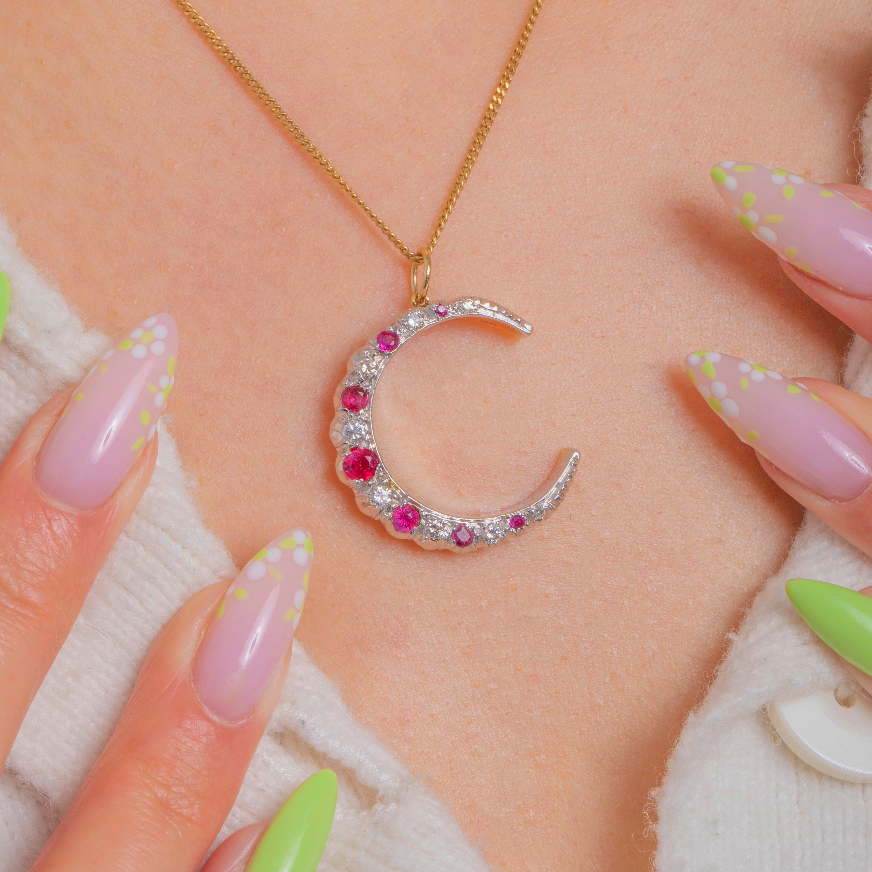 A luminous celestial treasure, this Vintage crescent moon pendant is crafted in two-tone 9ct Gold with a white Gold crescent and yellow Gold accents. The arc is set with a graceful graduation of bright Rubies and sparkling Diamonds in scalloped collet-style settings, lending a romantic Victorian-revival feel with crisp milgrain detail. Vivid reds play beautifully against icy white brilliance, creating an elegant, timeless glow.