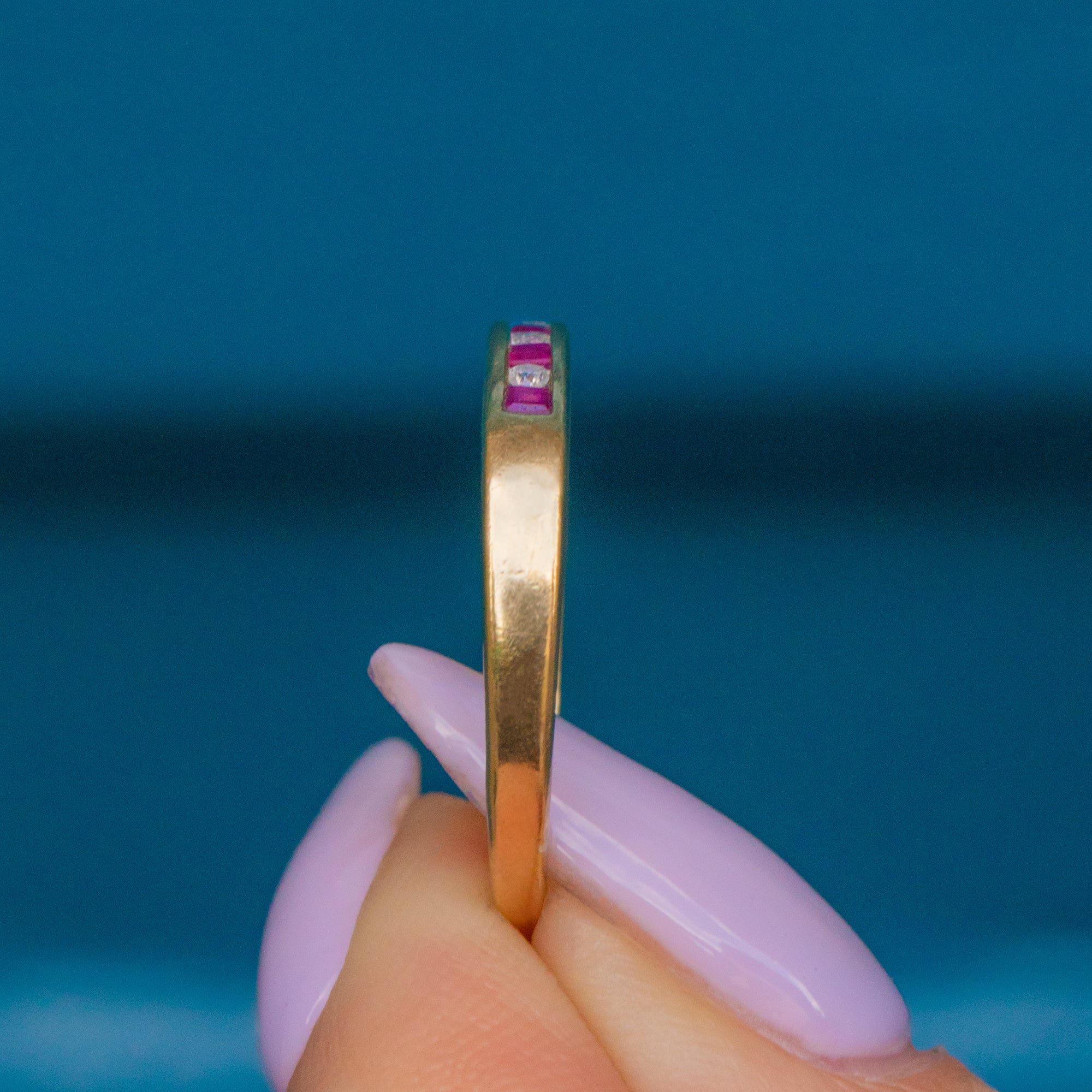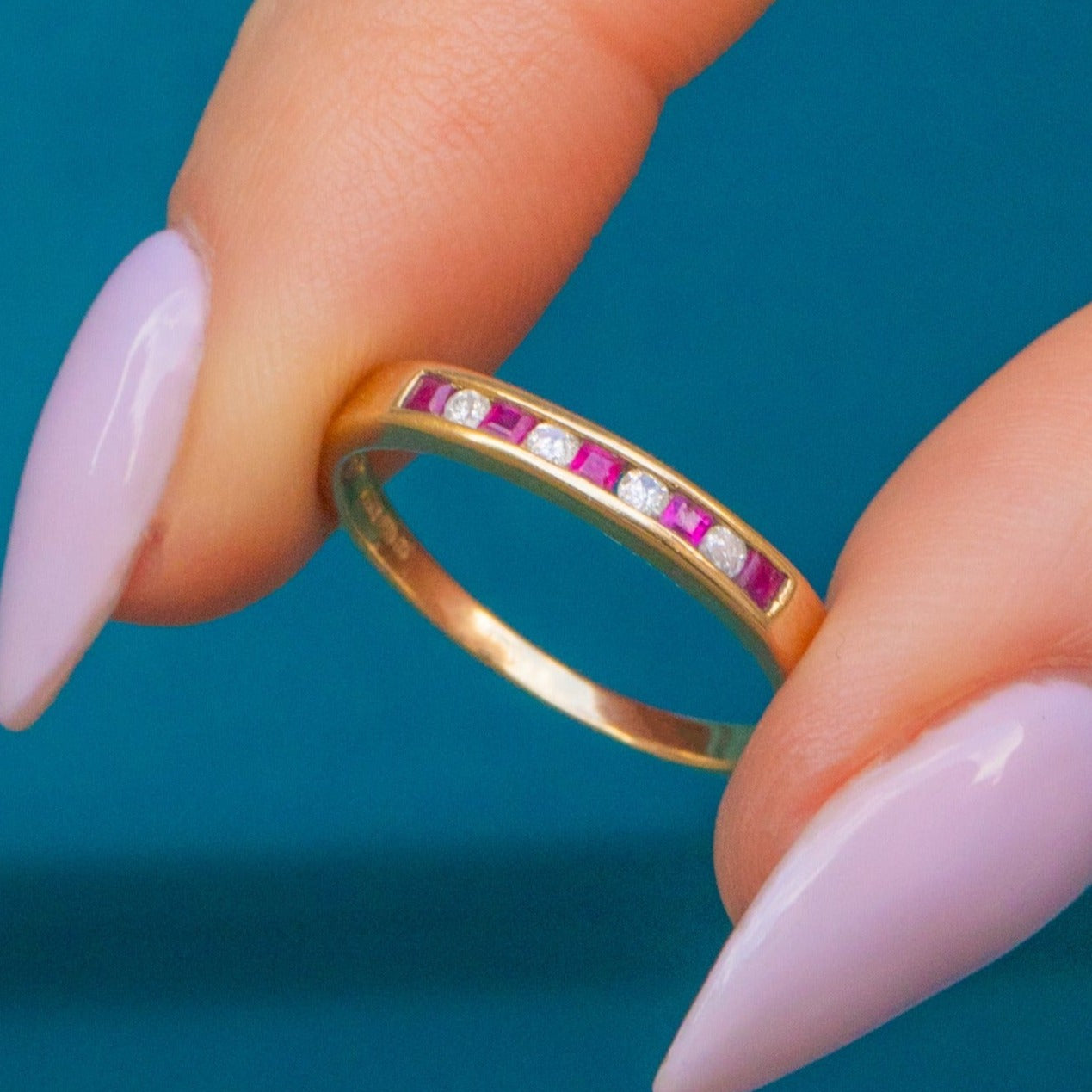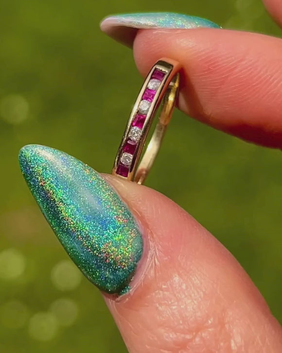 The front of this vintage Gold ring has a half-hoop design is inlaid with raspberry red Rubies and crisp Diamonds, enveloped by buttery 9ct Gold.