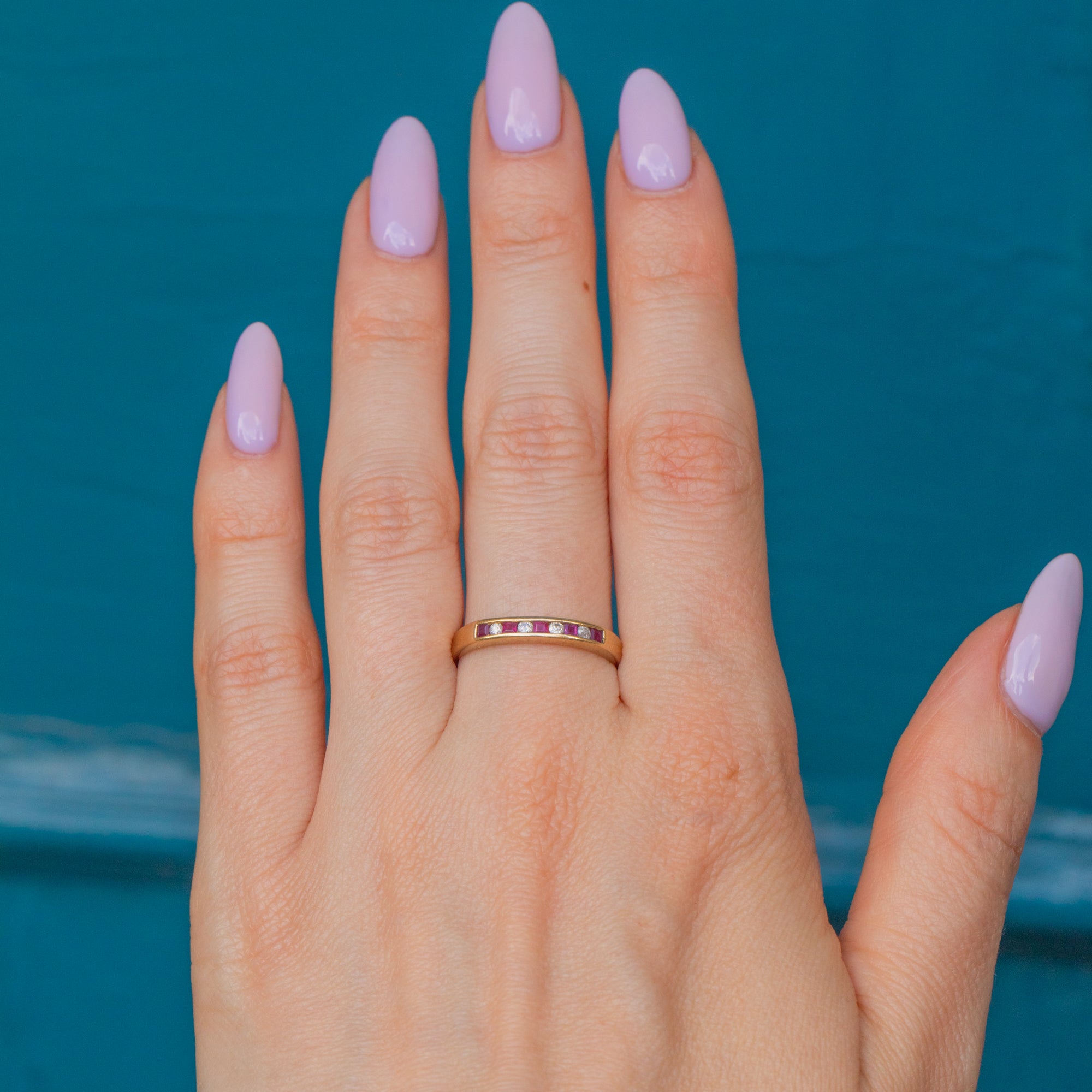 EXCELLENT. This 9ct Gold Ruby stacking ring is in excellent condition. This ring has been made from 9ct Gold, and has a secure array of gemstones visible. This ring has only very subtle surface wear to note, but it remains uber comfortable and wears like a dream.