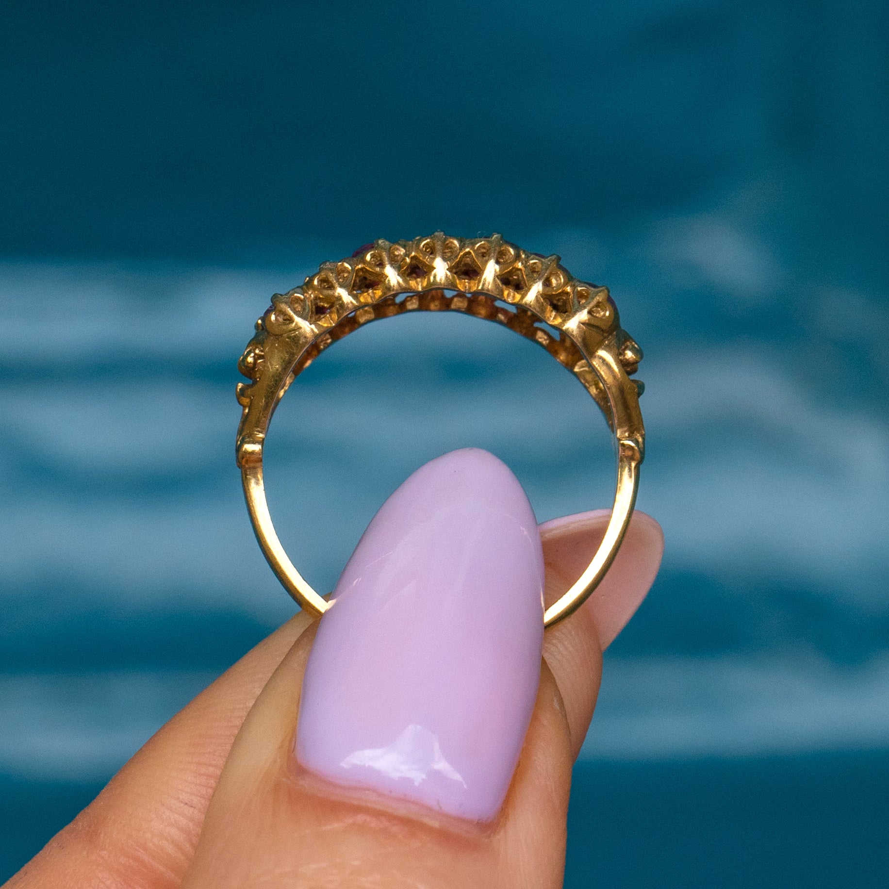 Make a statement with this Victorian 18ct Gold Etruscan Sapphire Diamond bar brooch. With Etruscan energy pouring from every crevice of this Victorian brooch, her Diamonds and Sapphire are set within star settings, bordered by beaded detailing and connected by geometric engravings.