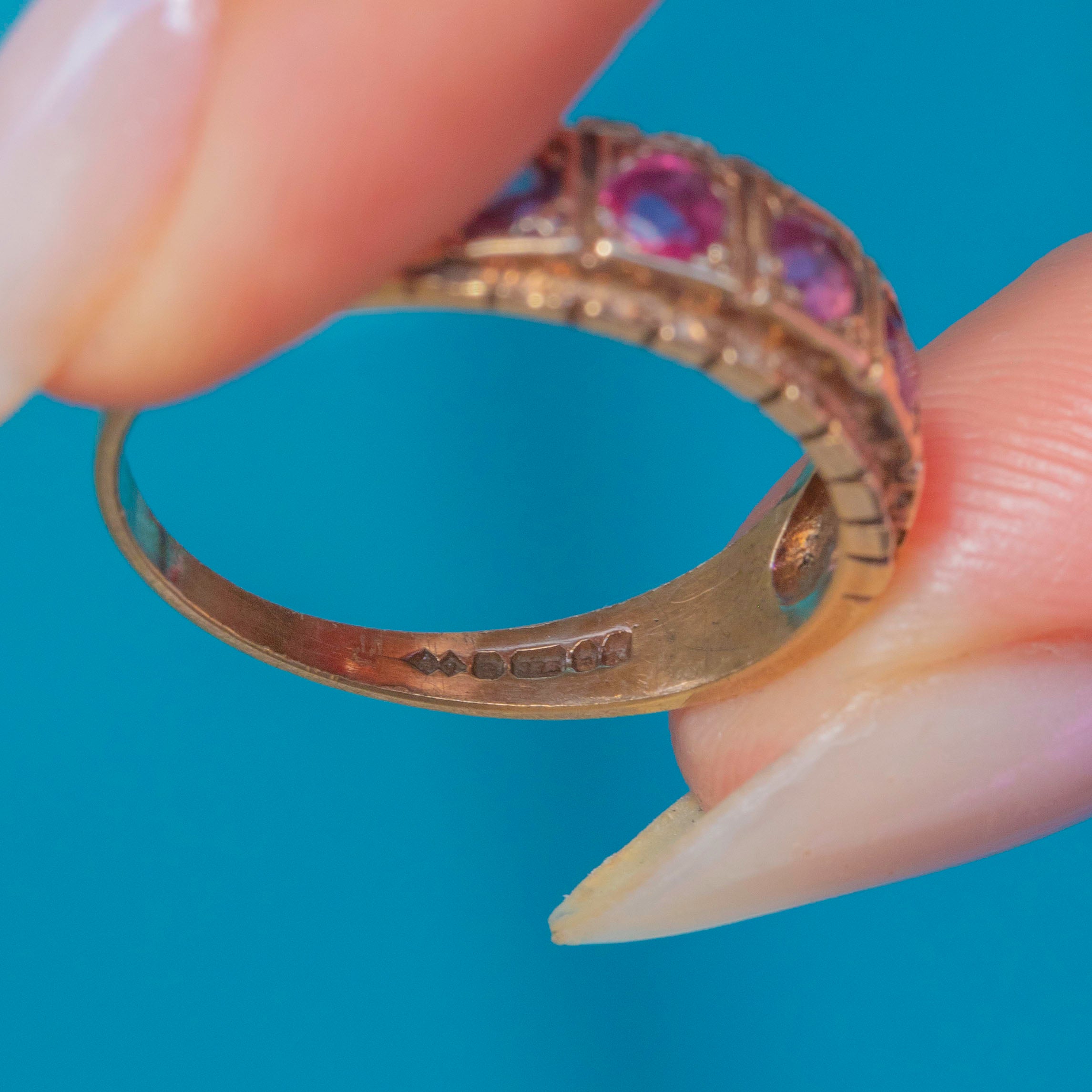 This gorgeous vintage gypsy ring has been ornately formed from solid 9ct Gold and displays five natural pink Rubies, with pretty soft raspberry undertones, that spread the width of the finger, and a flat profile that makes it perfect for everyday wear.