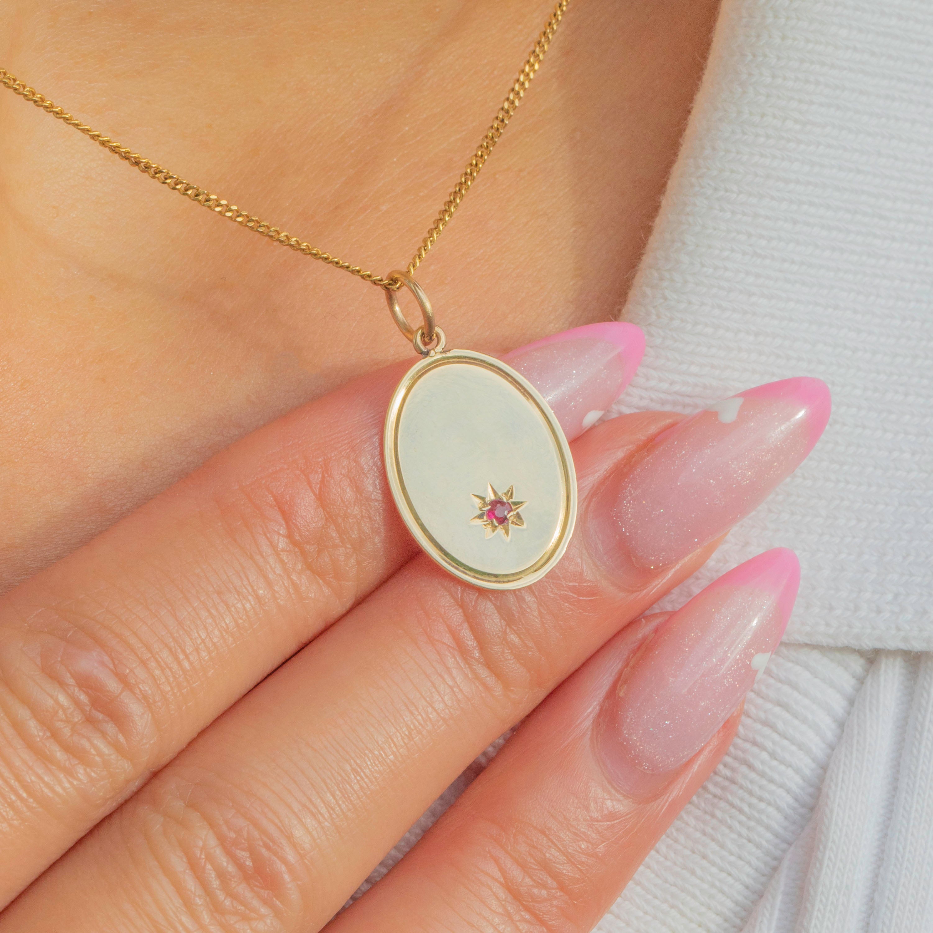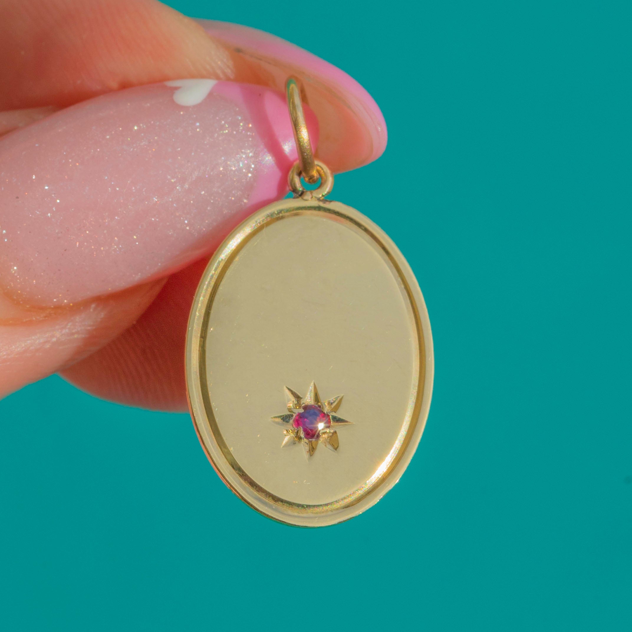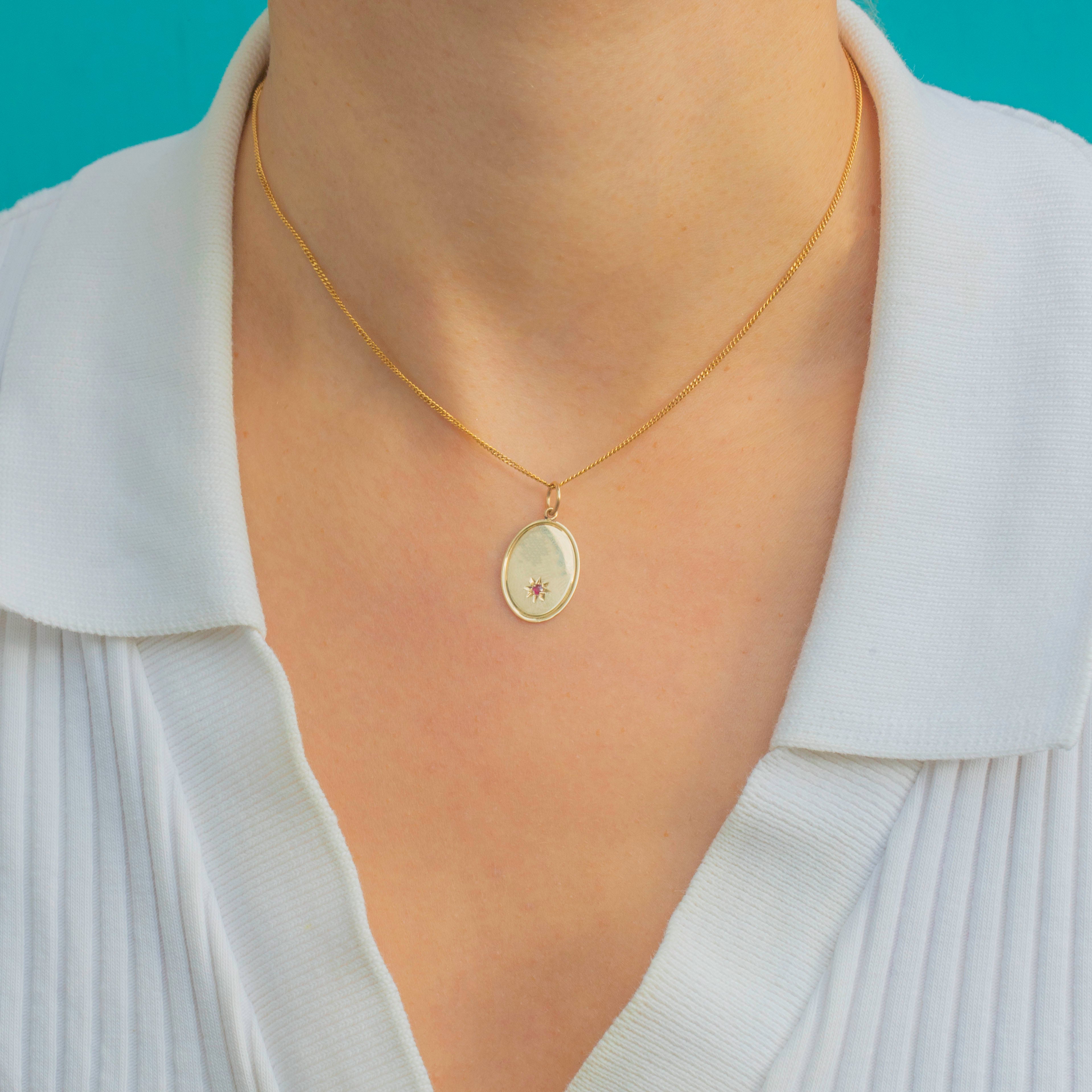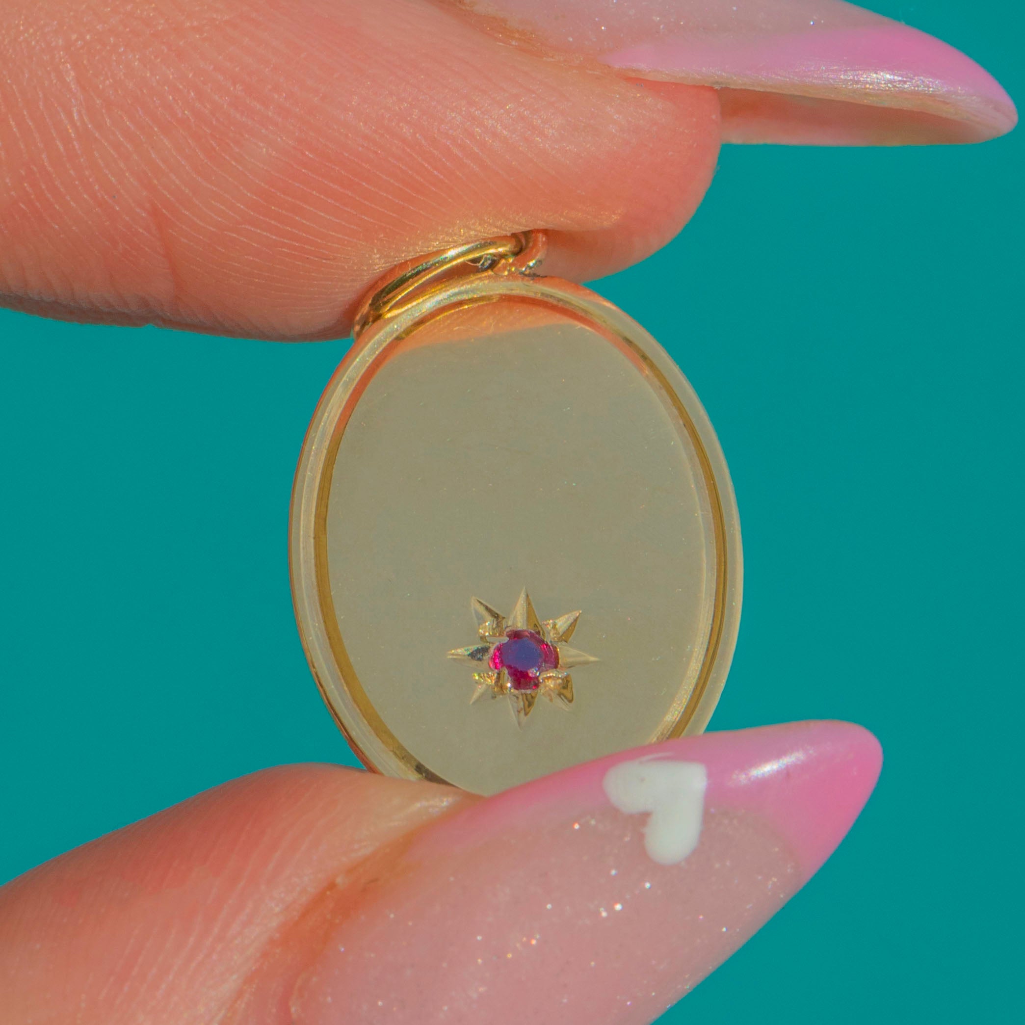 This charming Art Deco 9ct Gold disc pendant features a single Ruby nestled at its centre, star-set in classic early 20th-century style. The warm Gold glow contrasts beautifully with the vivid pink gemstone, creating a timeless little treasure that captures the clean geometry and understated glamour of the 1920s.