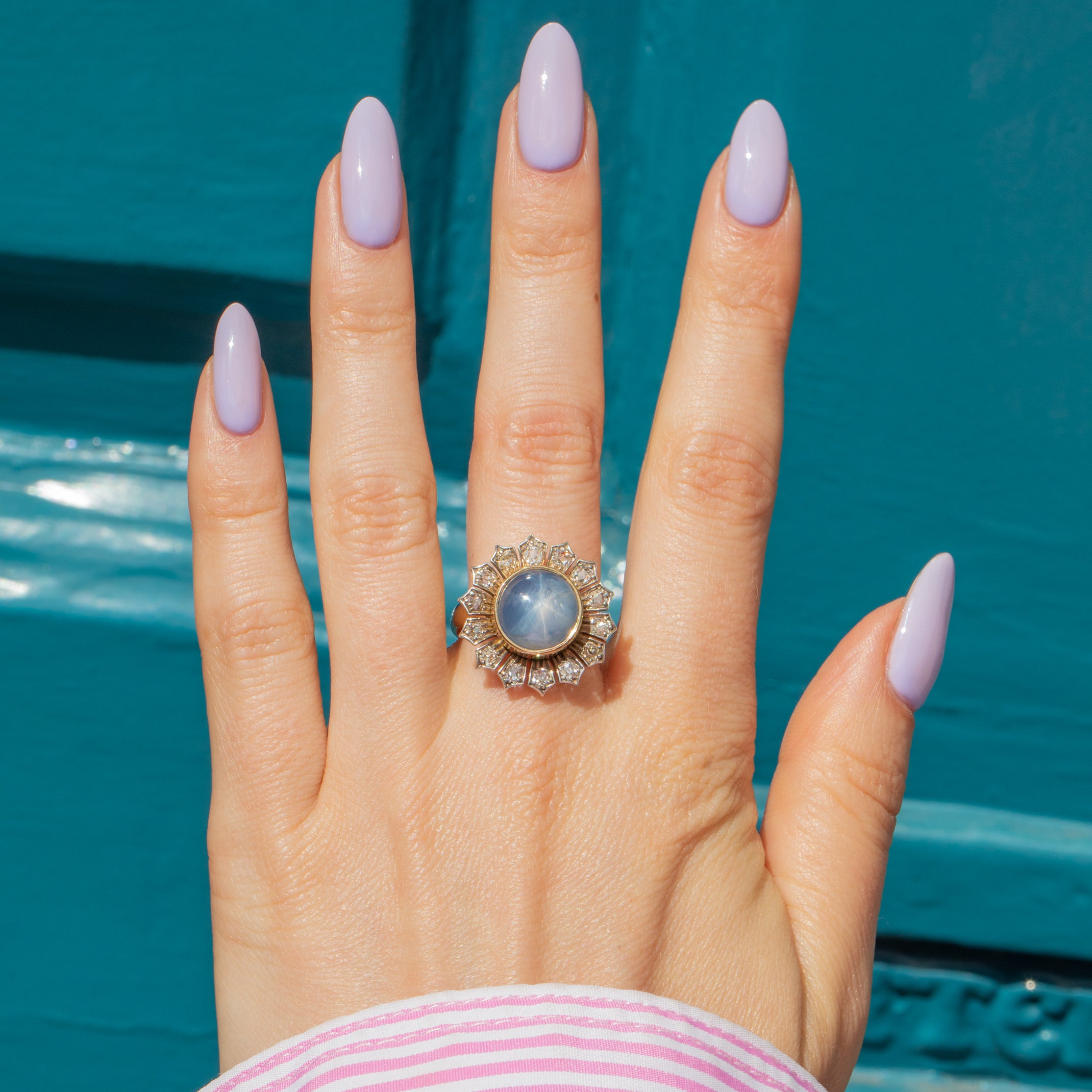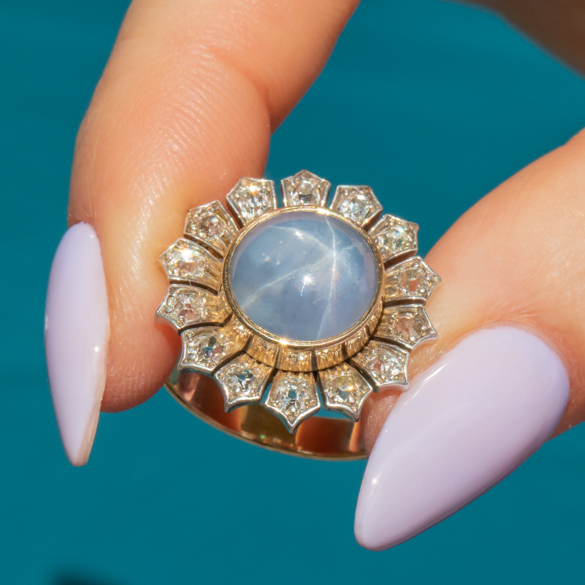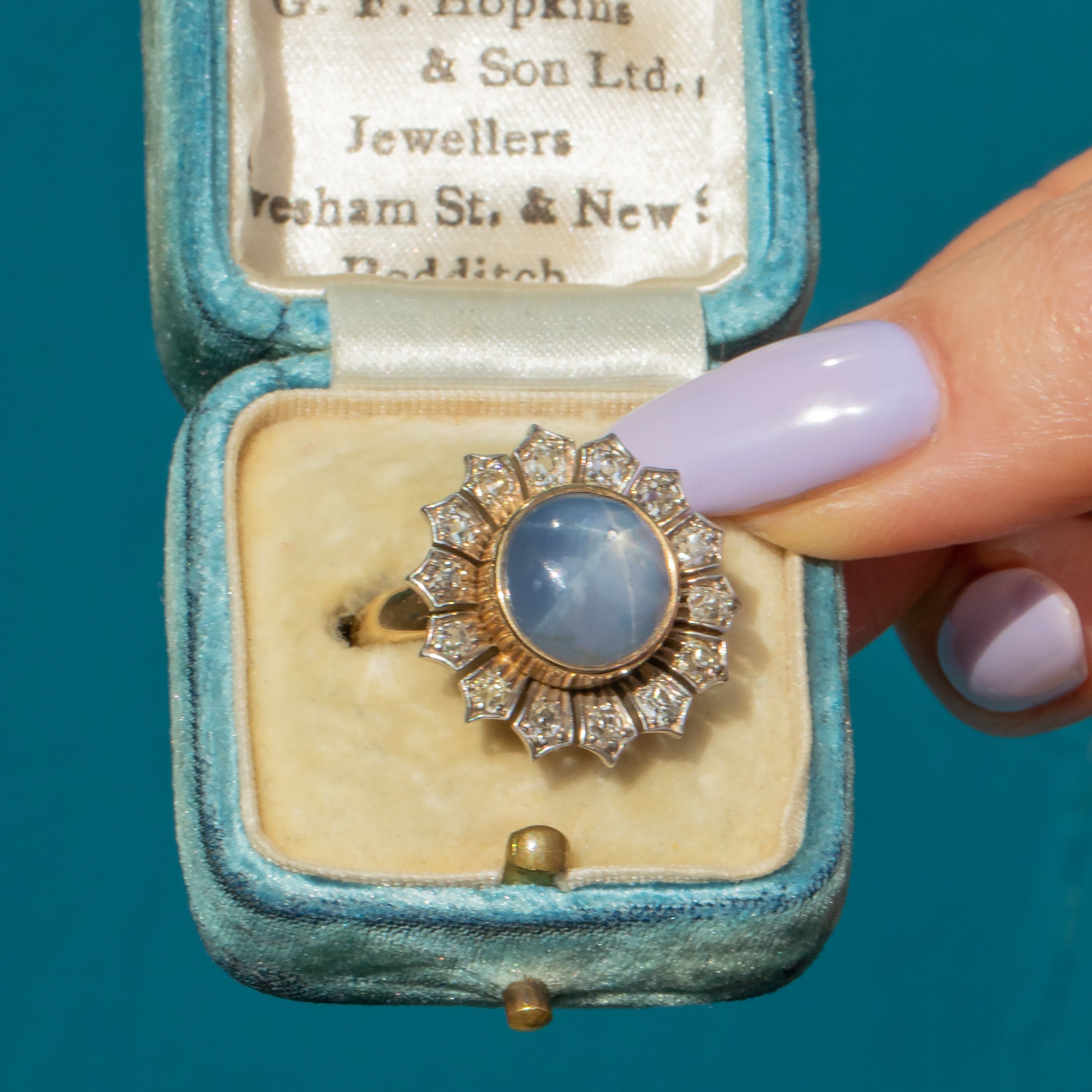 Summer just got a whole lot more glam thanks to this 9ct Gold Sapphire cabochon Diamond flower ring! The most splendorous flower you will ever lay eyes on, her core is formed of a mystical 5.35ct Star Sapphire haloed by Silver petals encrusted with scintillating old mine-cut Diamonds.