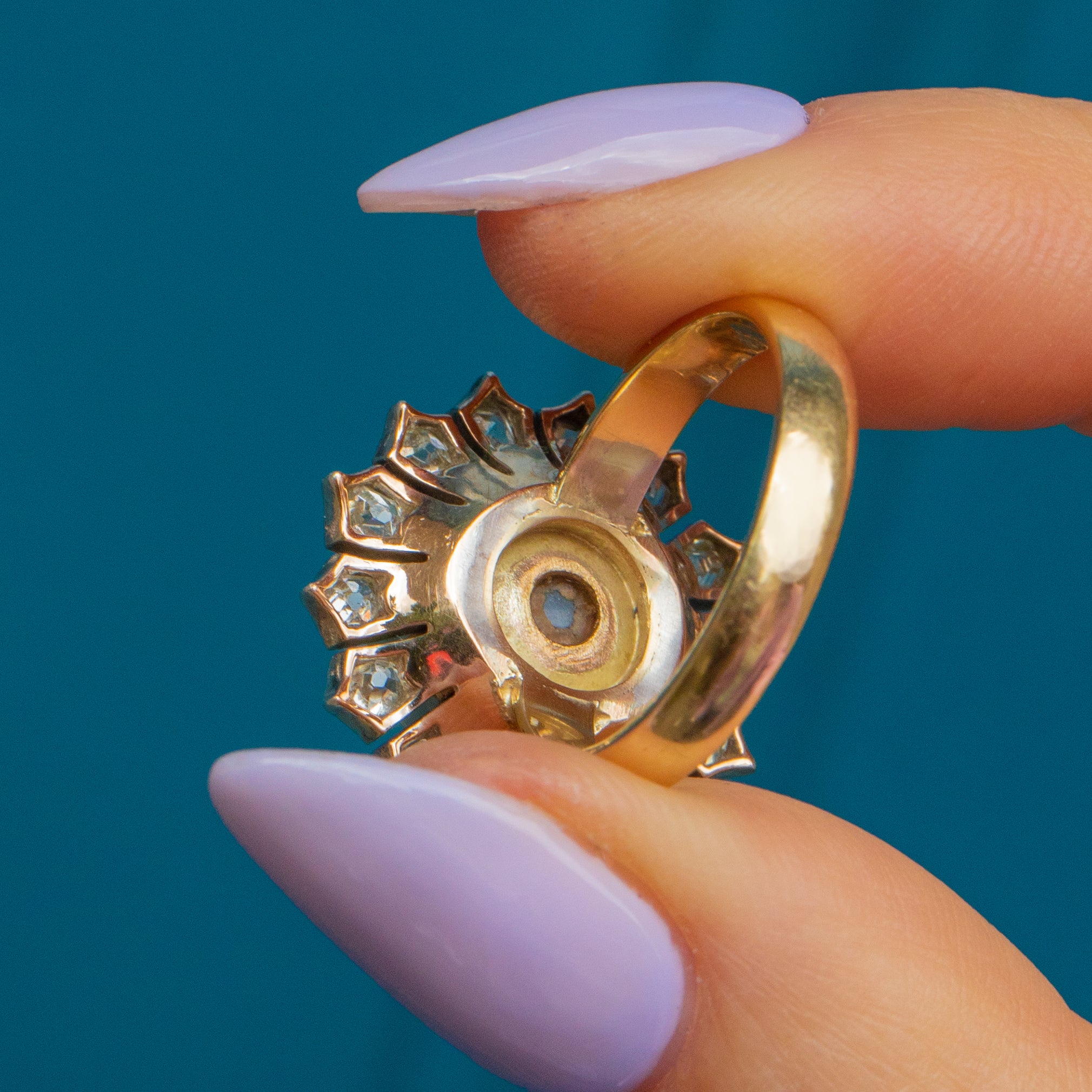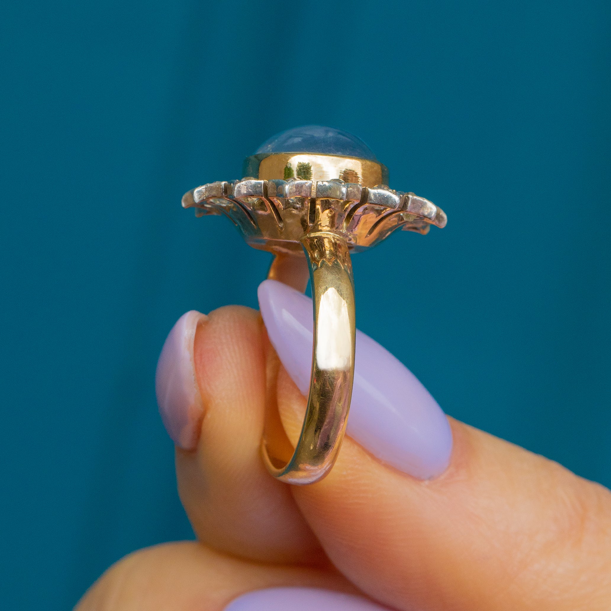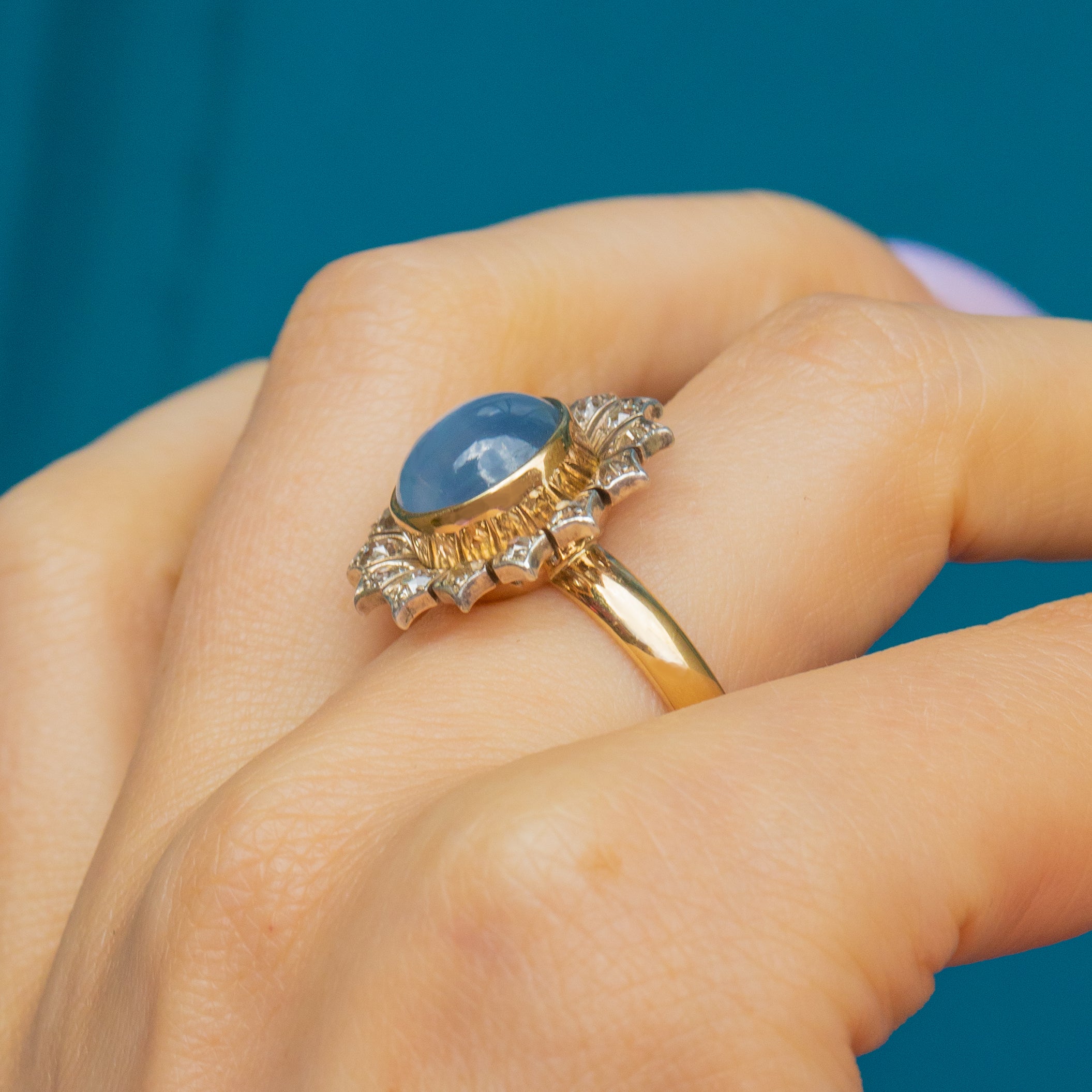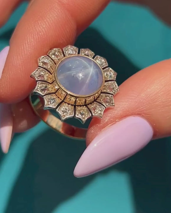 Summer just got a whole lot more glam thanks to this 9ct Gold Sapphire cabochon Diamond flower ring! The most splendorous flower you will ever lay eyes on, her core is formed of a mystical 5.35ct Star Sapphire haloed by Silver petals encrusted with scintillating old mine-cut Diamonds.