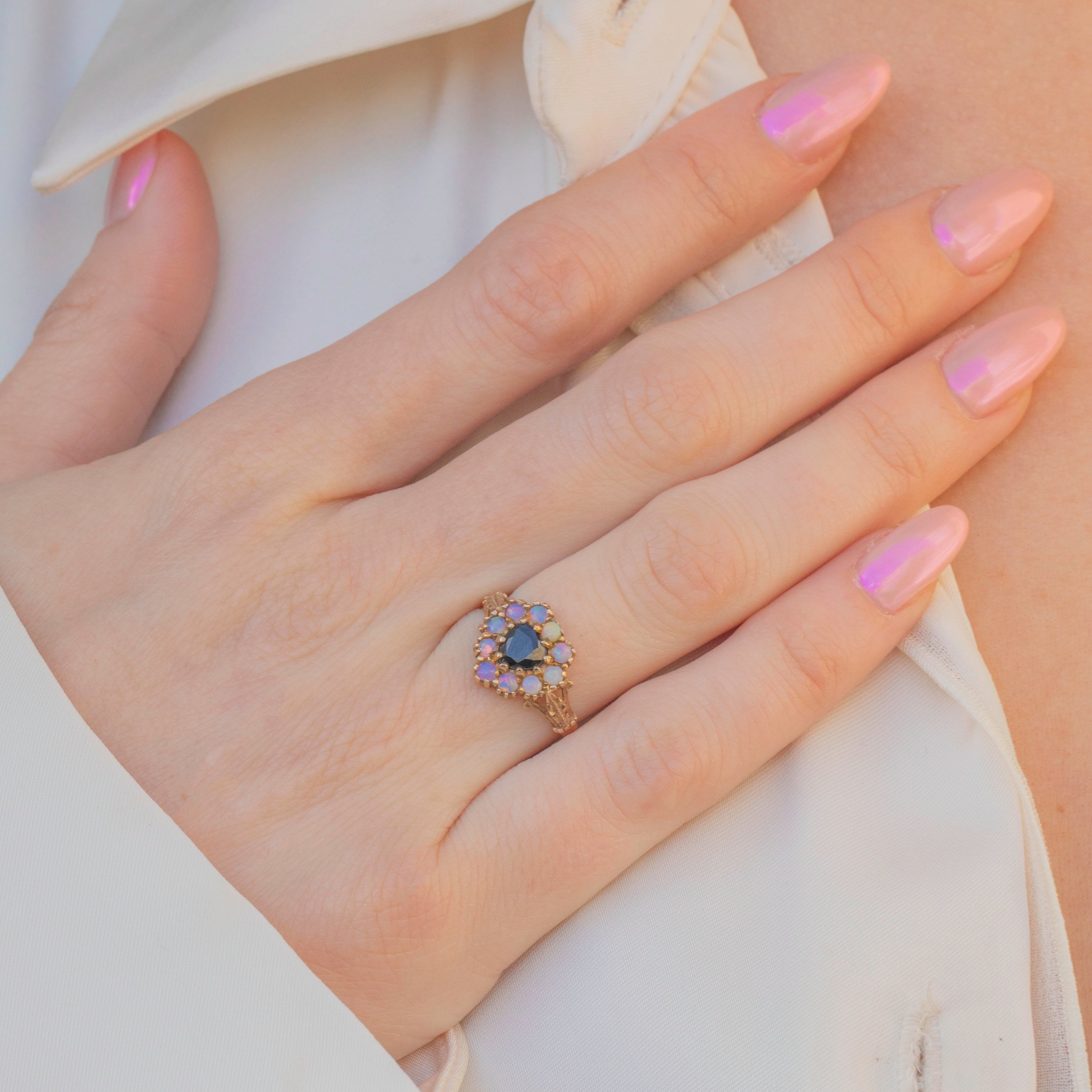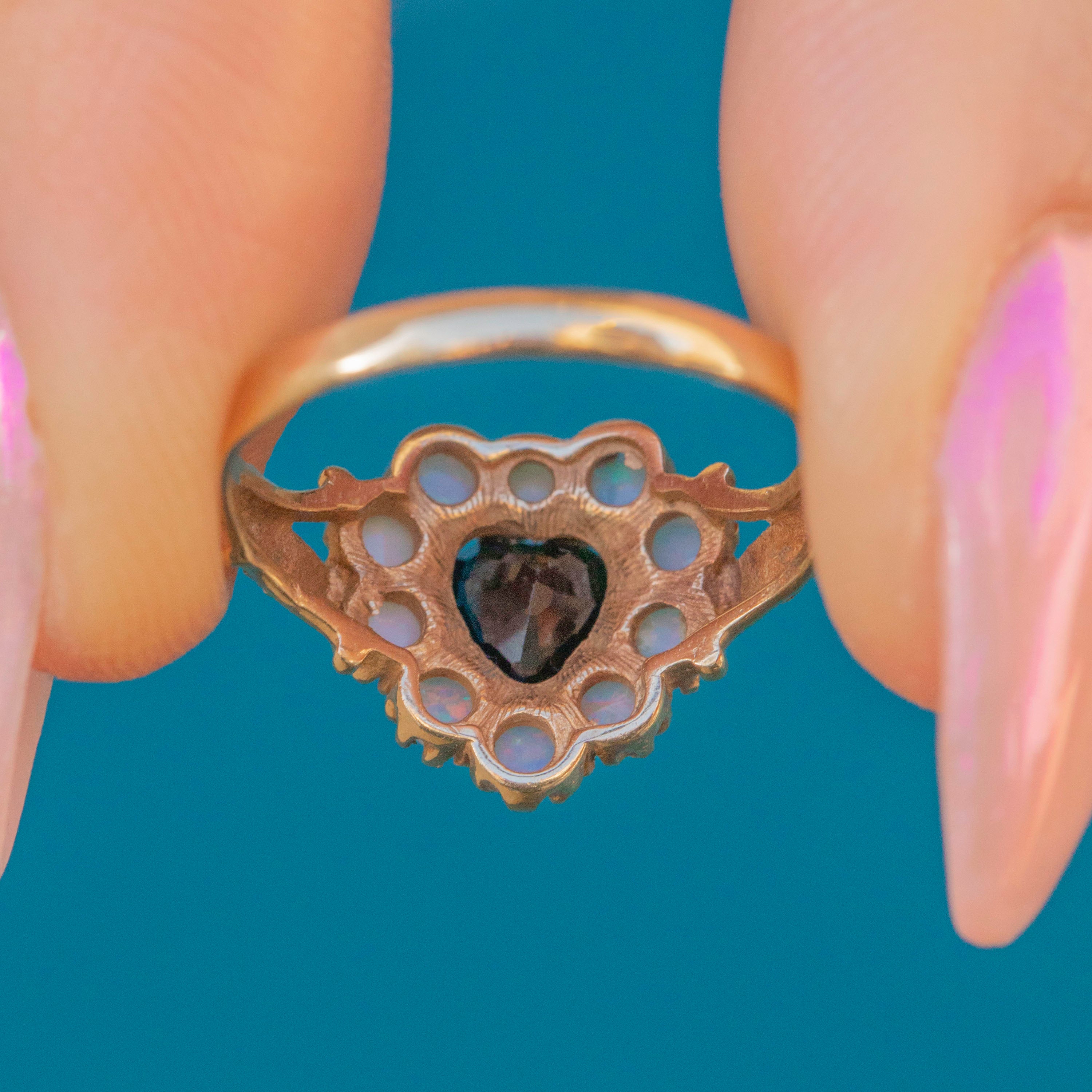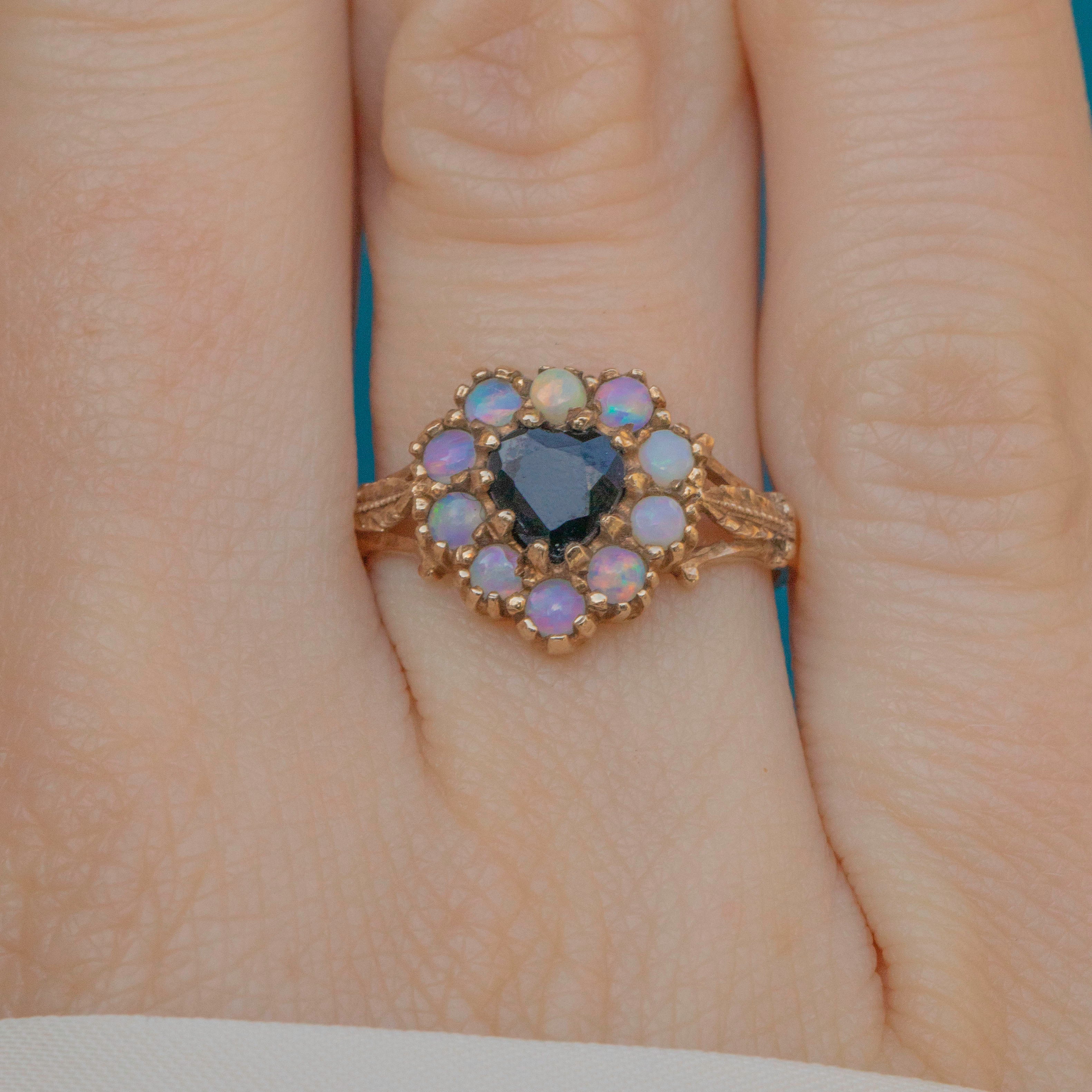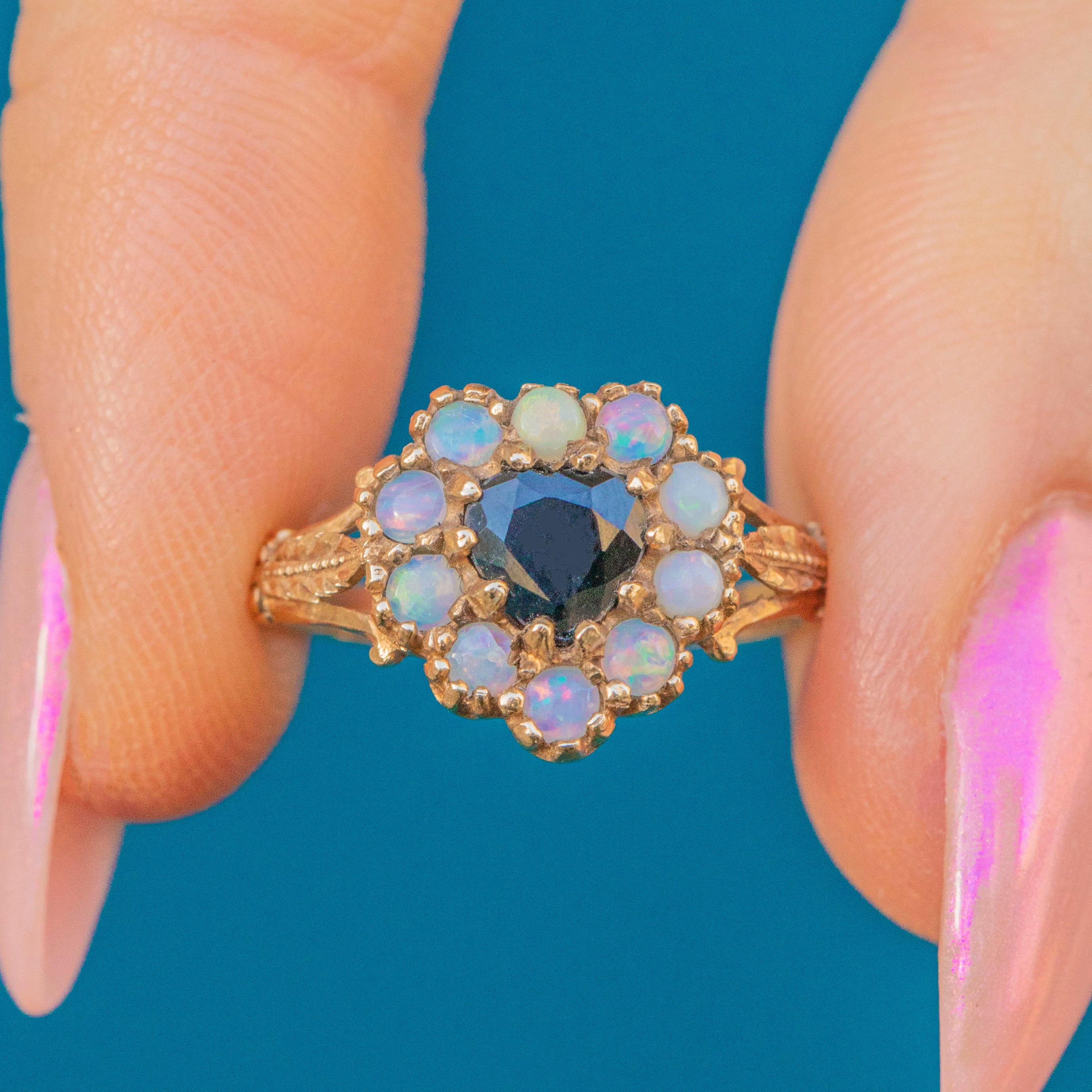 EXCELLENT. This 9ct Gold Sapphire Opal heart cluster ring is in excellent condition. Her Sapphire and Opals are radiant, free from chips or scratches, and are set securely within their settings. The Gold is buttery and the band has a clear set of English hallmarks allowing us to accurately date this vintage treasure to 1988!