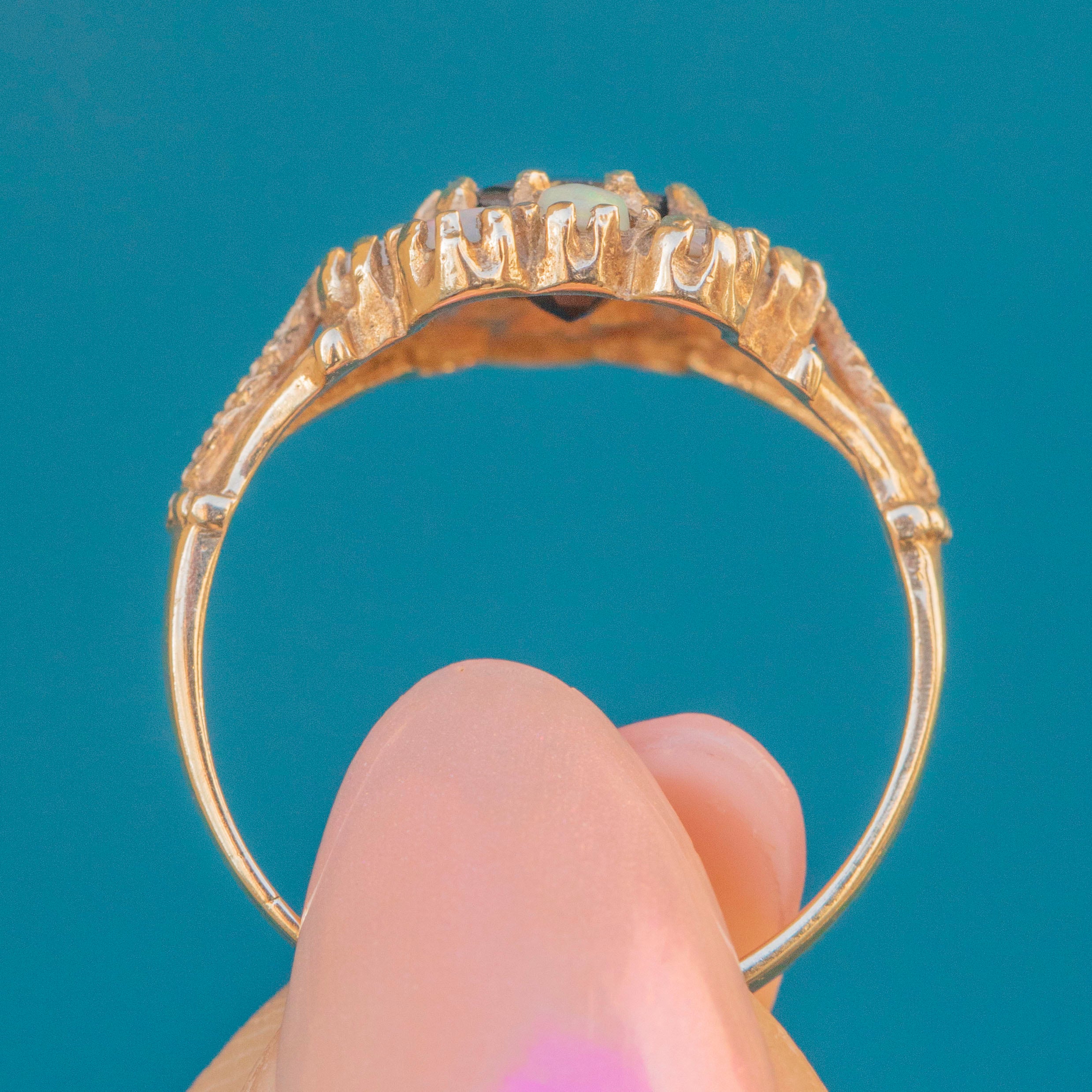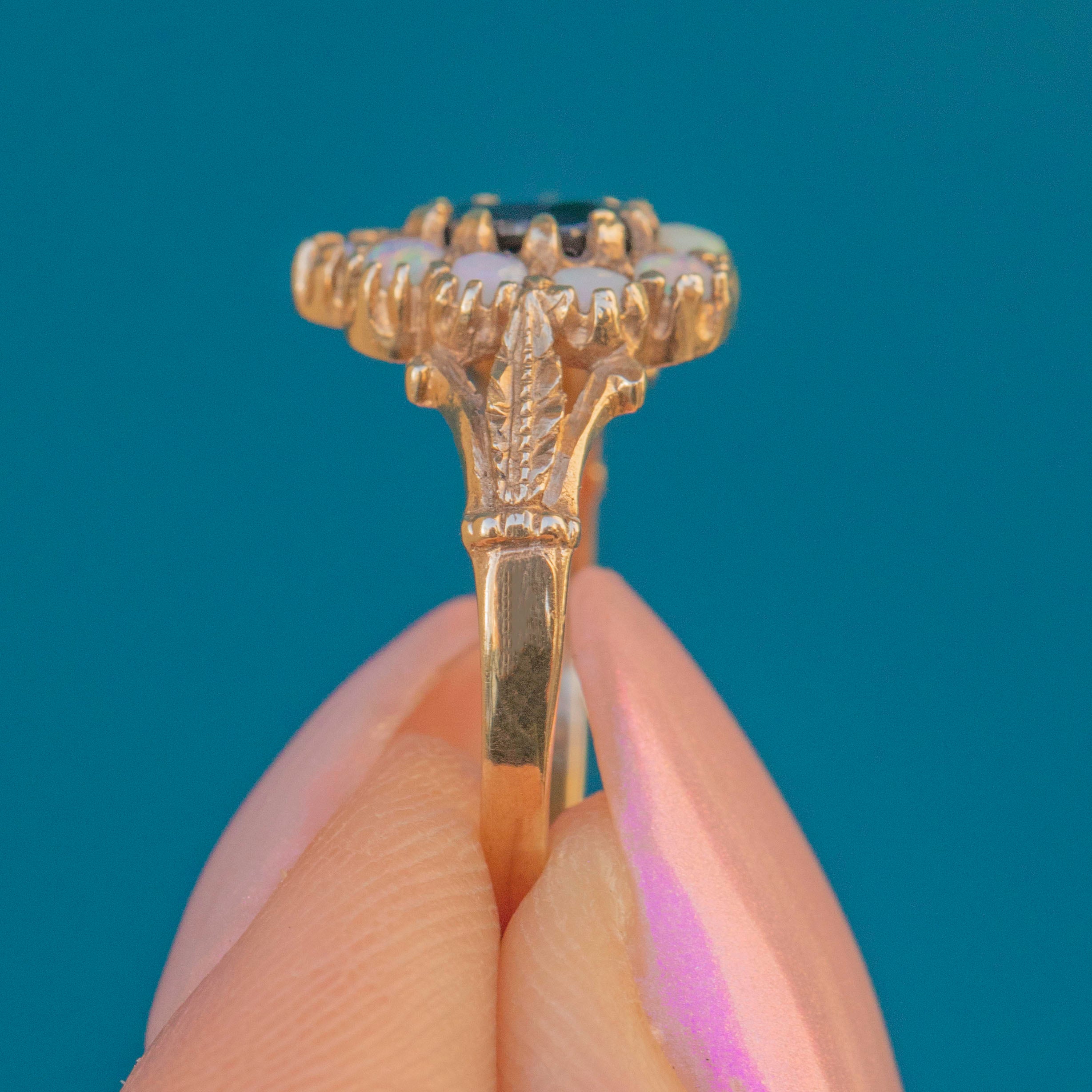 Crafted from buttery 9ct Gold, this vintage ring features a gorgeous deep cerulean Sapphire in her centre, adorned by a halo of iridescent Opals. Each gemstone looks radiant in the light, with its blue and pink tones married together effortlessly by the warmth of the Gold band and settings.