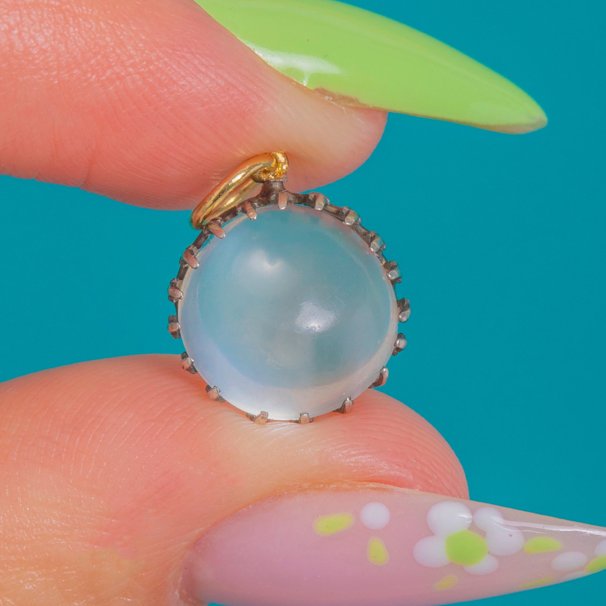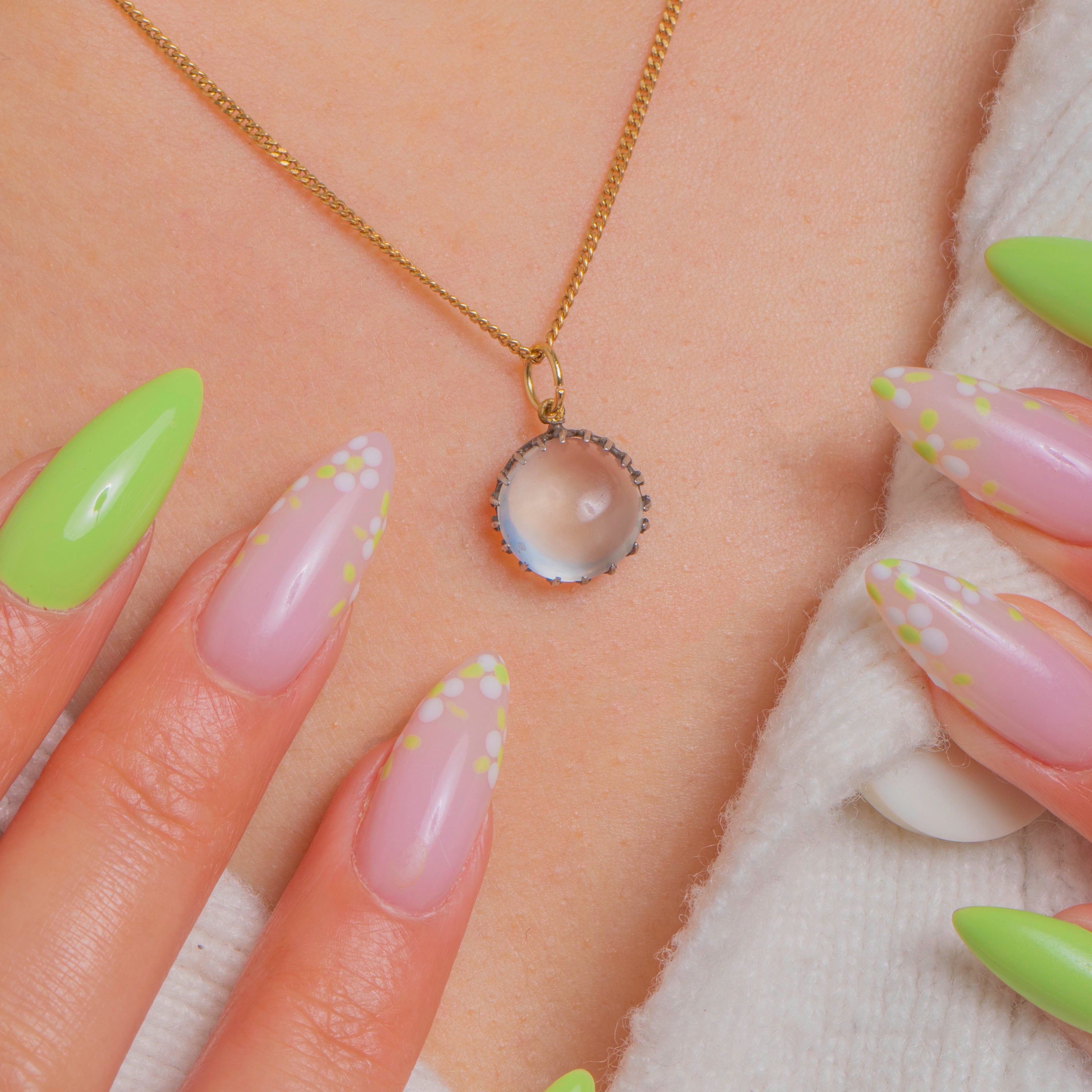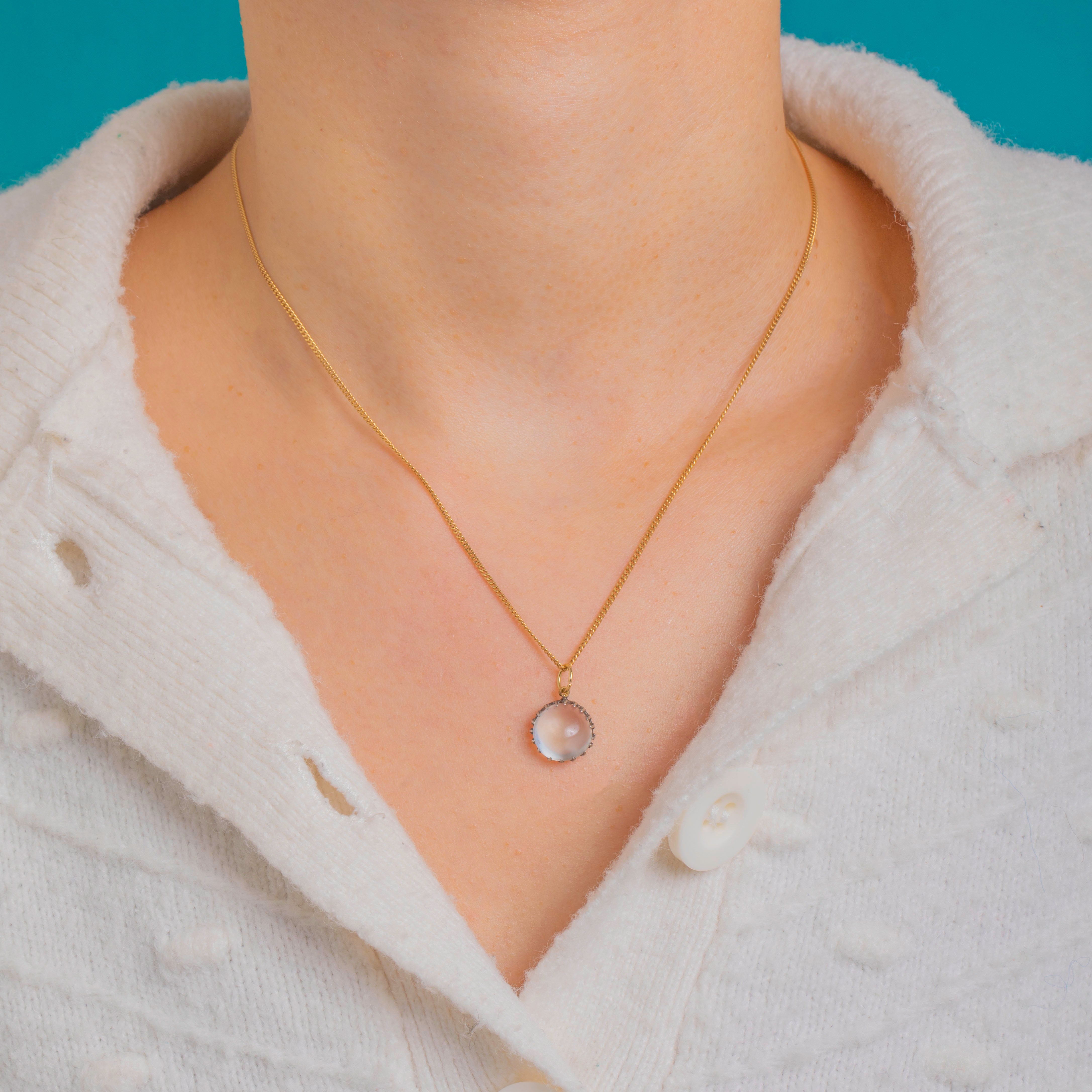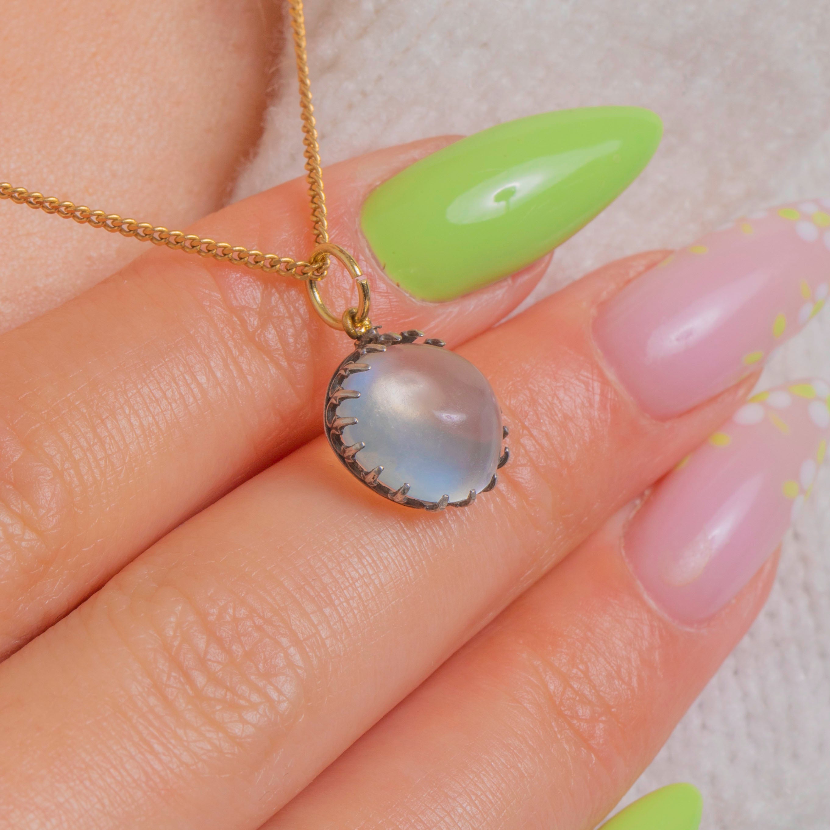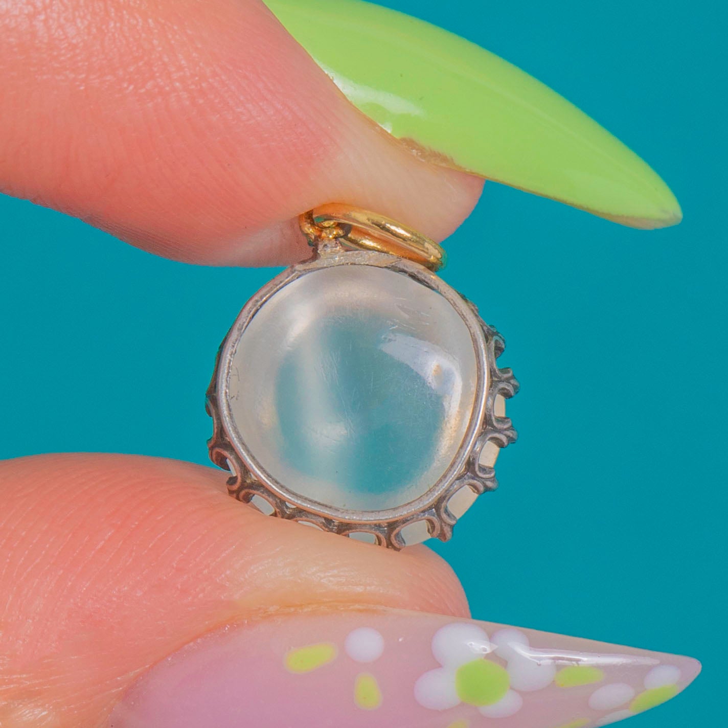 A dreamy Edwardian Moonstone charm with that ethereal, bluish adularescent glow we adore. The high-domed round cabochon is cradled in a crown-style Silver collet with a pretty open scalloped gallery, giving the stone a light, airy presence. A 9ct Gold jump ring adds a refined contrast and makes it effortless to wear on your favourite chain or charm bracelet.