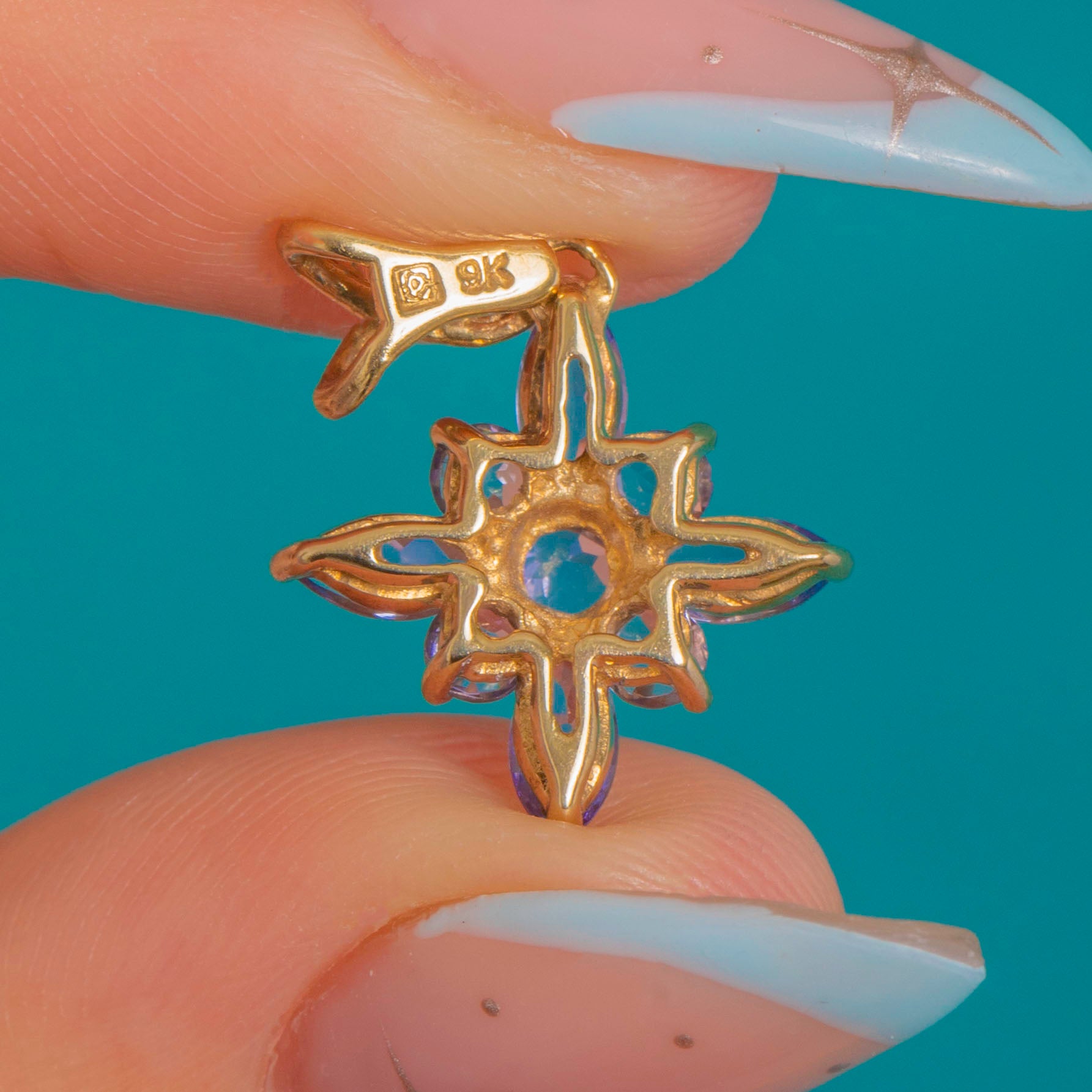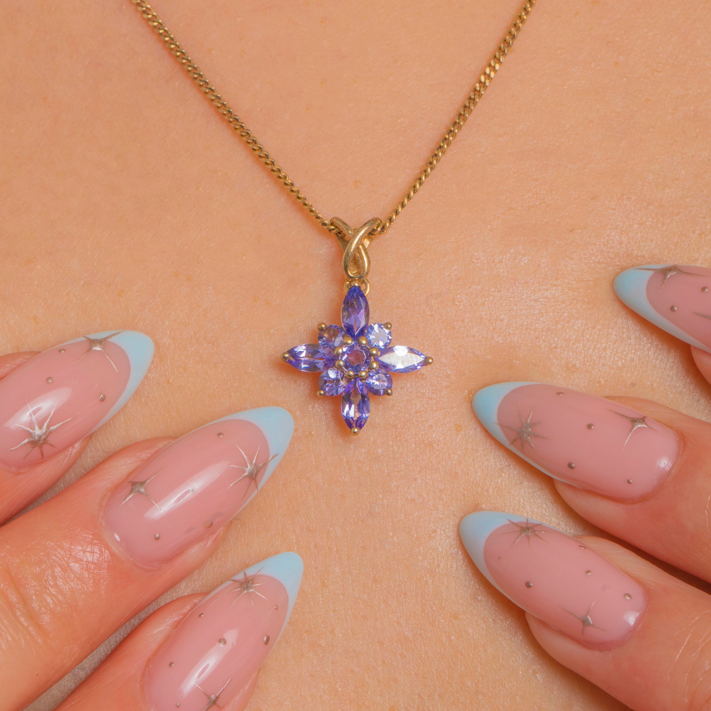 Dainty and dazzling, this 9ct Gold Tanzanite “star” charm blooms with lilac-violet sparkle. Marquise-cut “petals” radiate around a petite round centre to form a chic floral starburst, all neatly claw-set to catch the light beautifully.