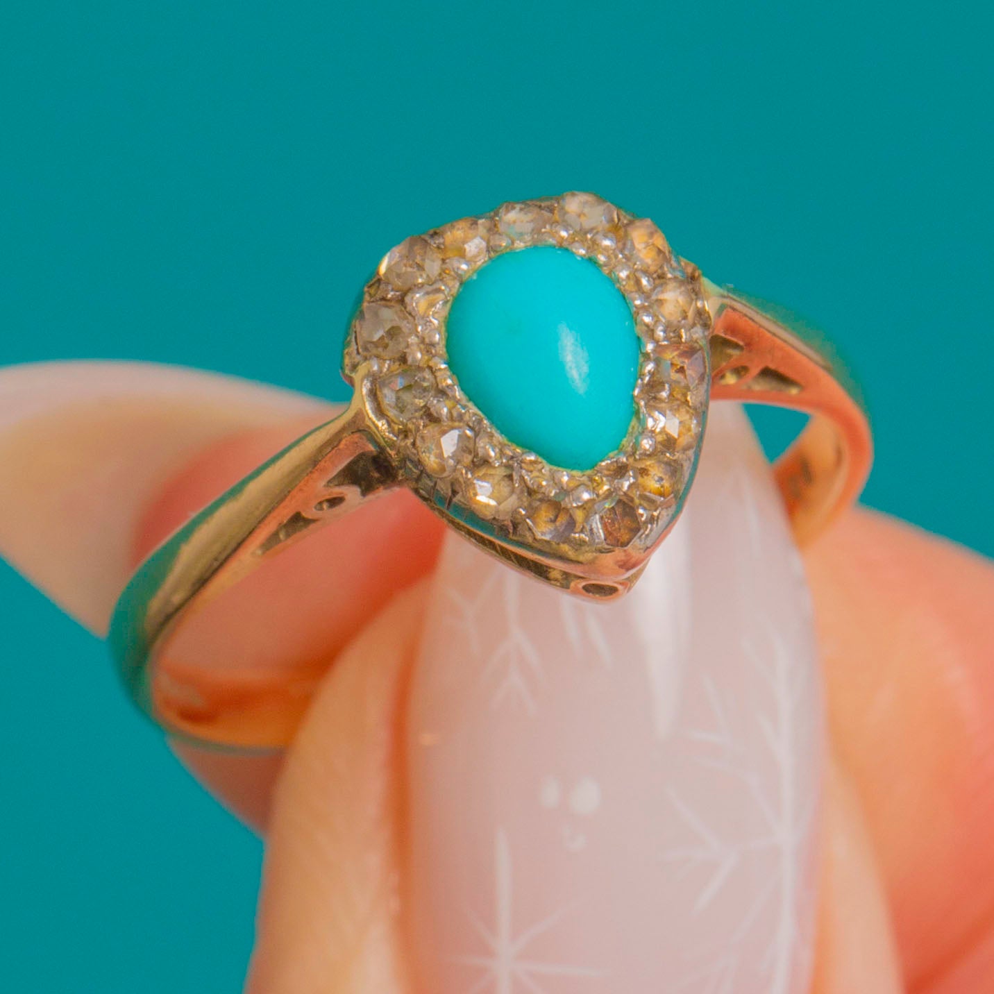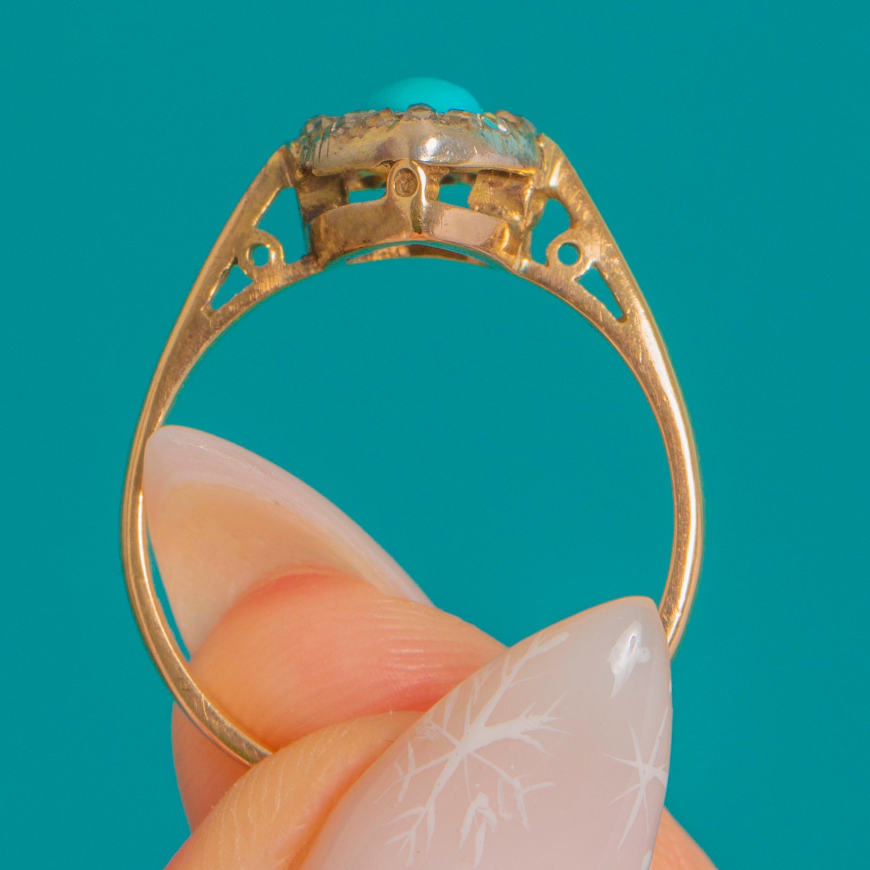 EXCELLENT: The Turquoise cabochon is smooth, glossy and securely set; the Rose Cut Diamonds are bright with only the lightest, age-consistent abrasions visible under magnification. The Platinum settings and 9ct Gold band show minor surface wear commensurate with age, with crisp details retained. A faint resizing/solder line is visible near one shoulder under close inspection, with the shank round and sturdy.