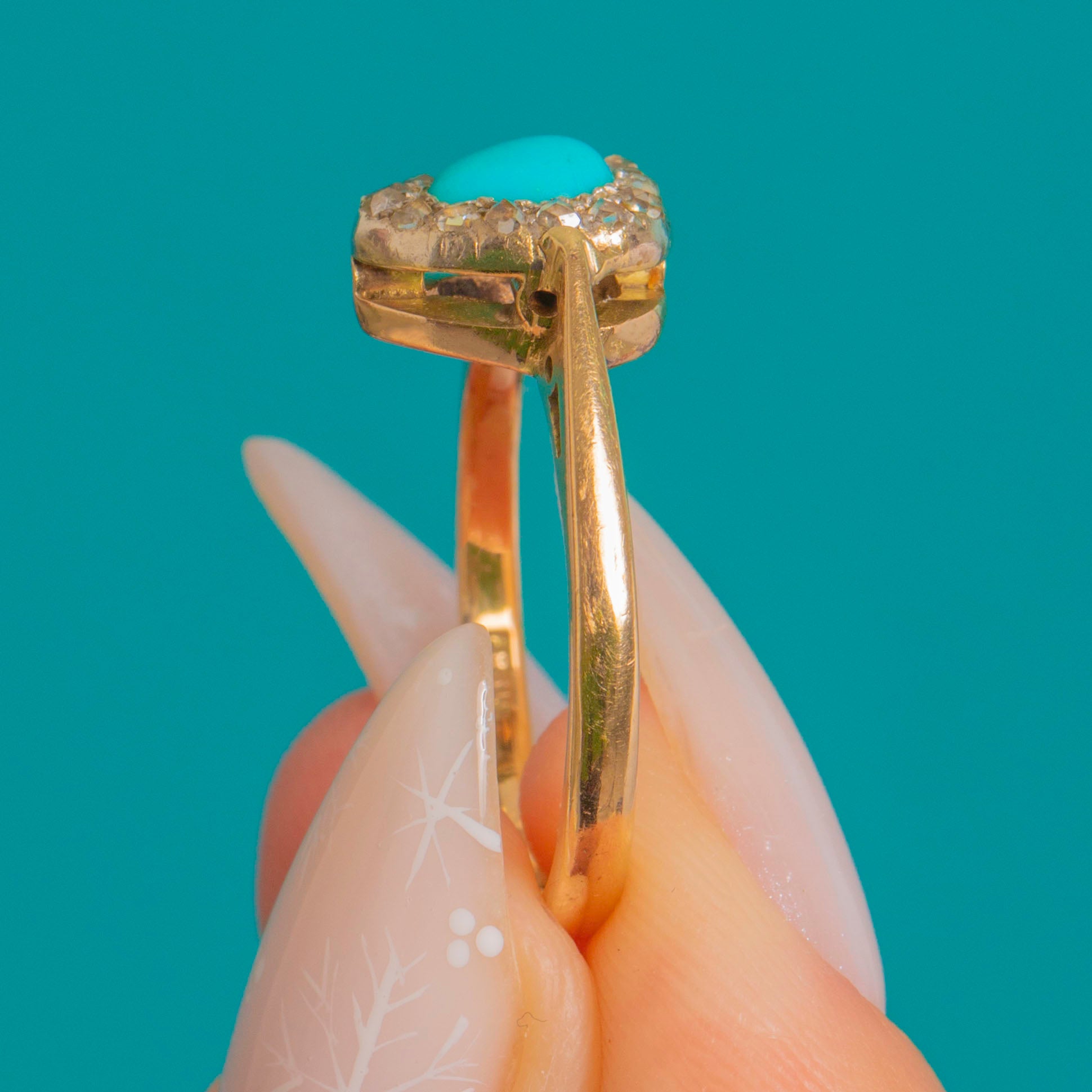 A darling heart cluster ring that marries vibrant colour with timeless sparkle. At its centre sits a bright Turquoise cabochon, framed by a scalloped halo of glinting Rose Cut Diamonds set in cool Platinum for that beautiful “white-topped” contrast against the warm 9ct Gold band.