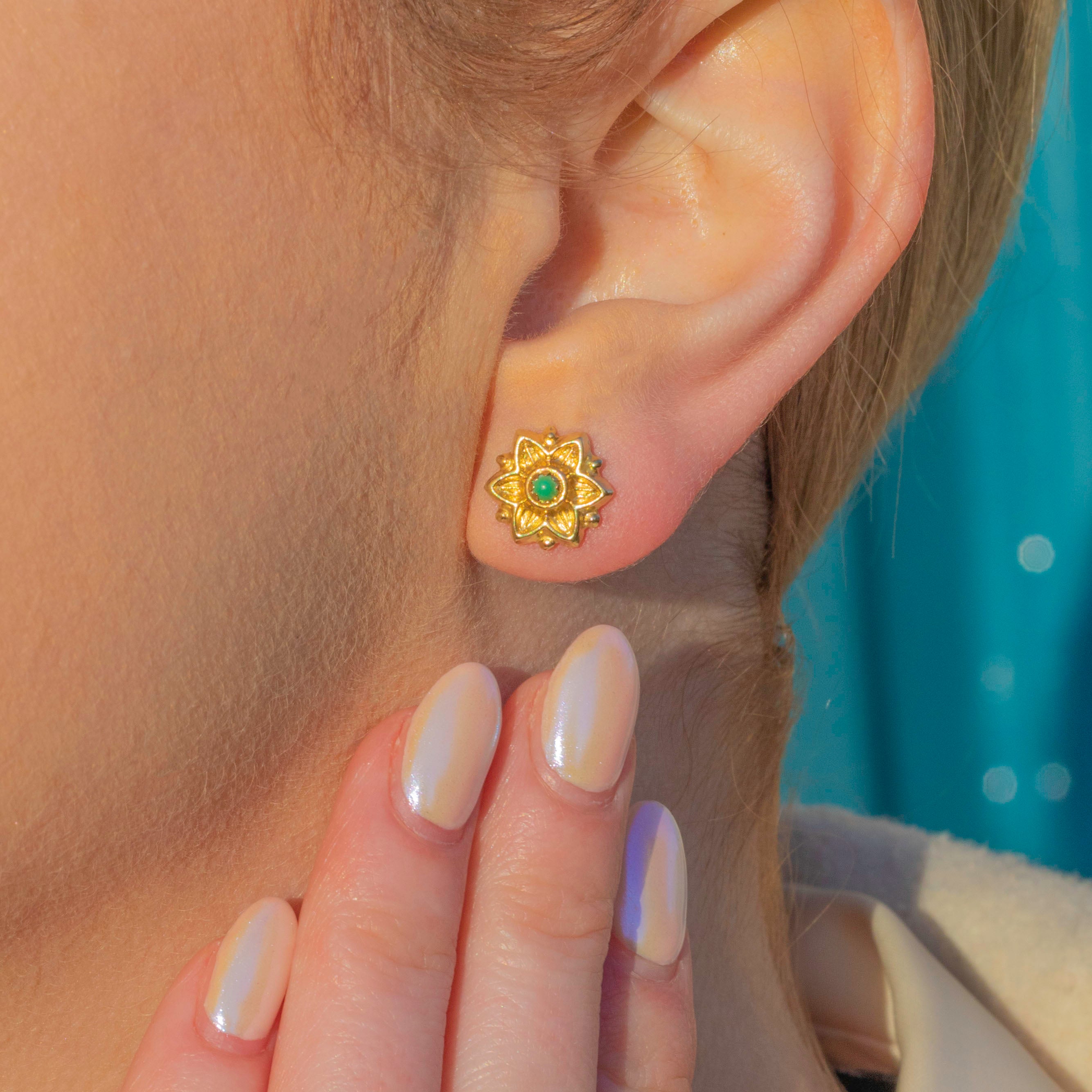 Crafted from buttery 9ct Gold, each earring features a vibrant Turquoise stone in her centre. Each Turquoise is set within an intricately detailed floral setting, wonderfully crafted, giving each vintage stud added texture and depth.