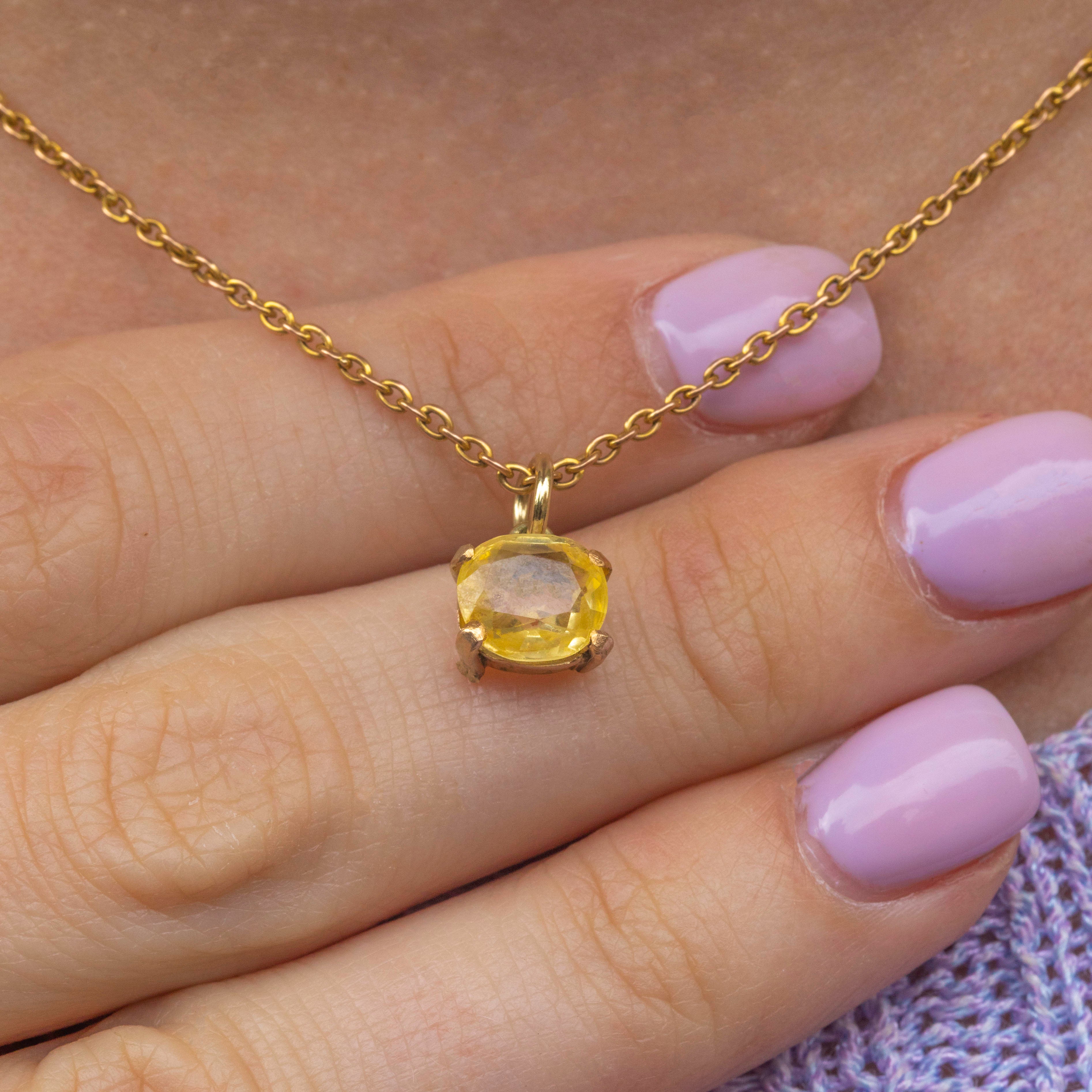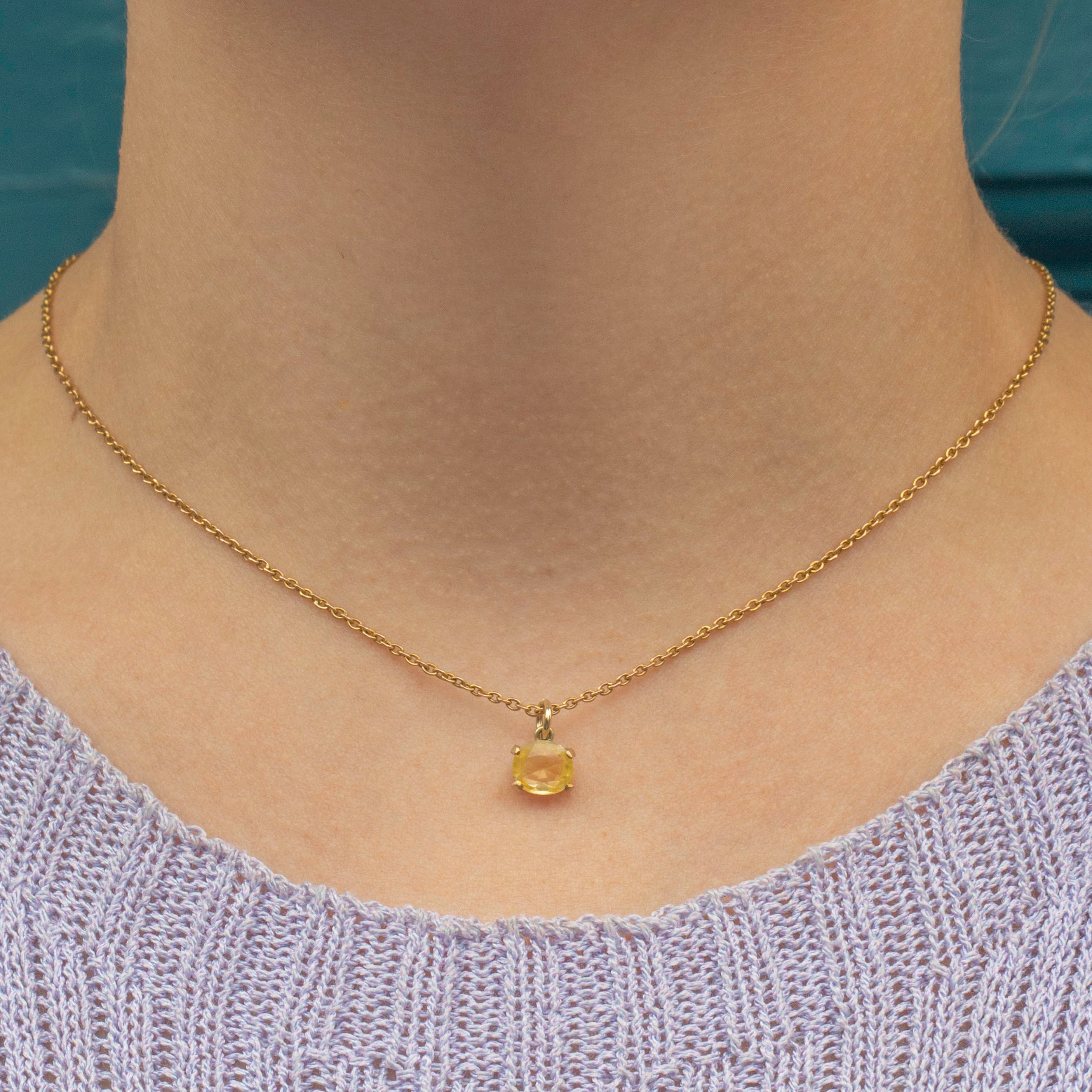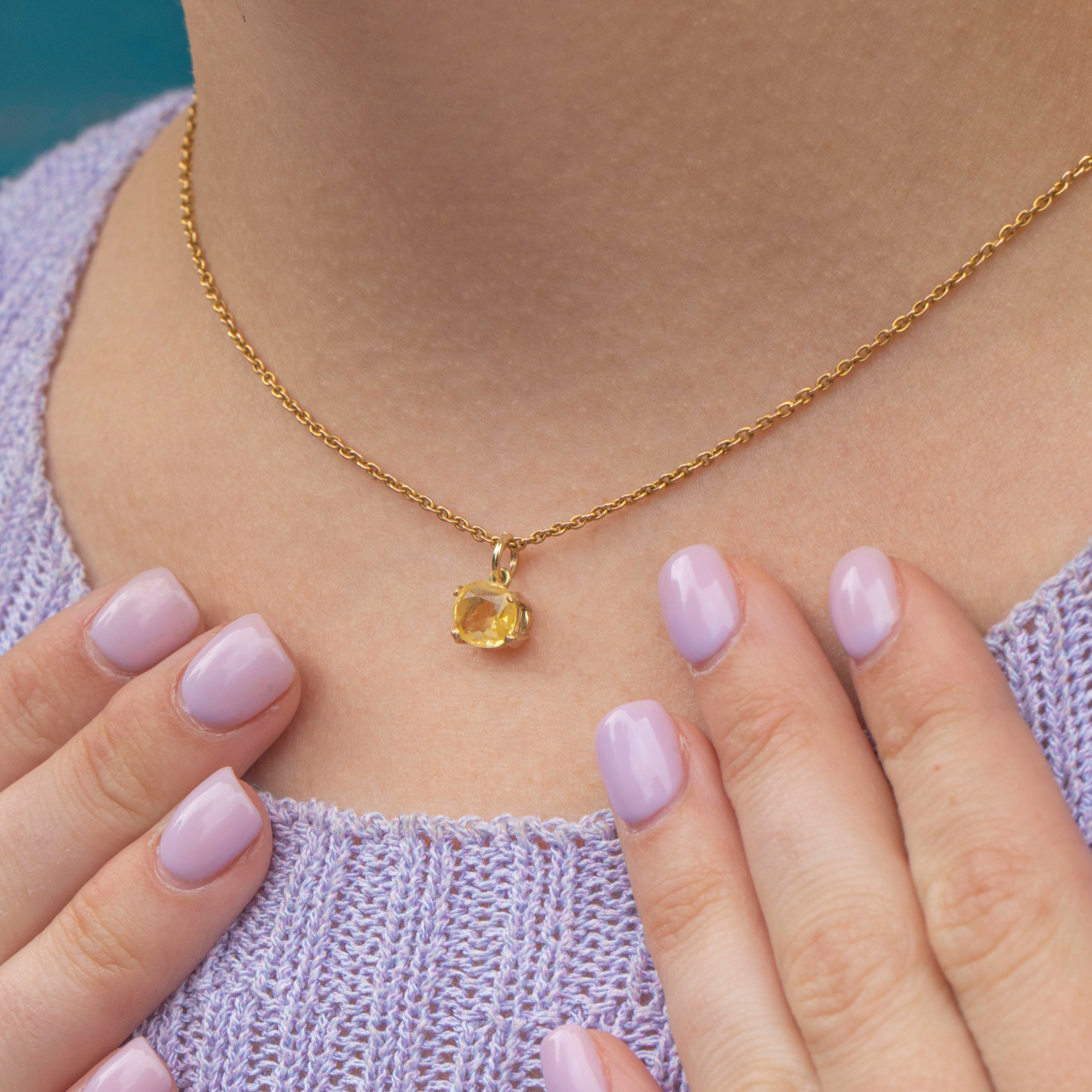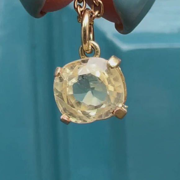 EXCELLENT. This 9ct Gold yellow Sapphire round charm is in excellent condition. The yellow Sapphire sits securely within the claw settings, with no damage to note. With a jump-ring to finish, she can be suspended from a chain of your choice!
