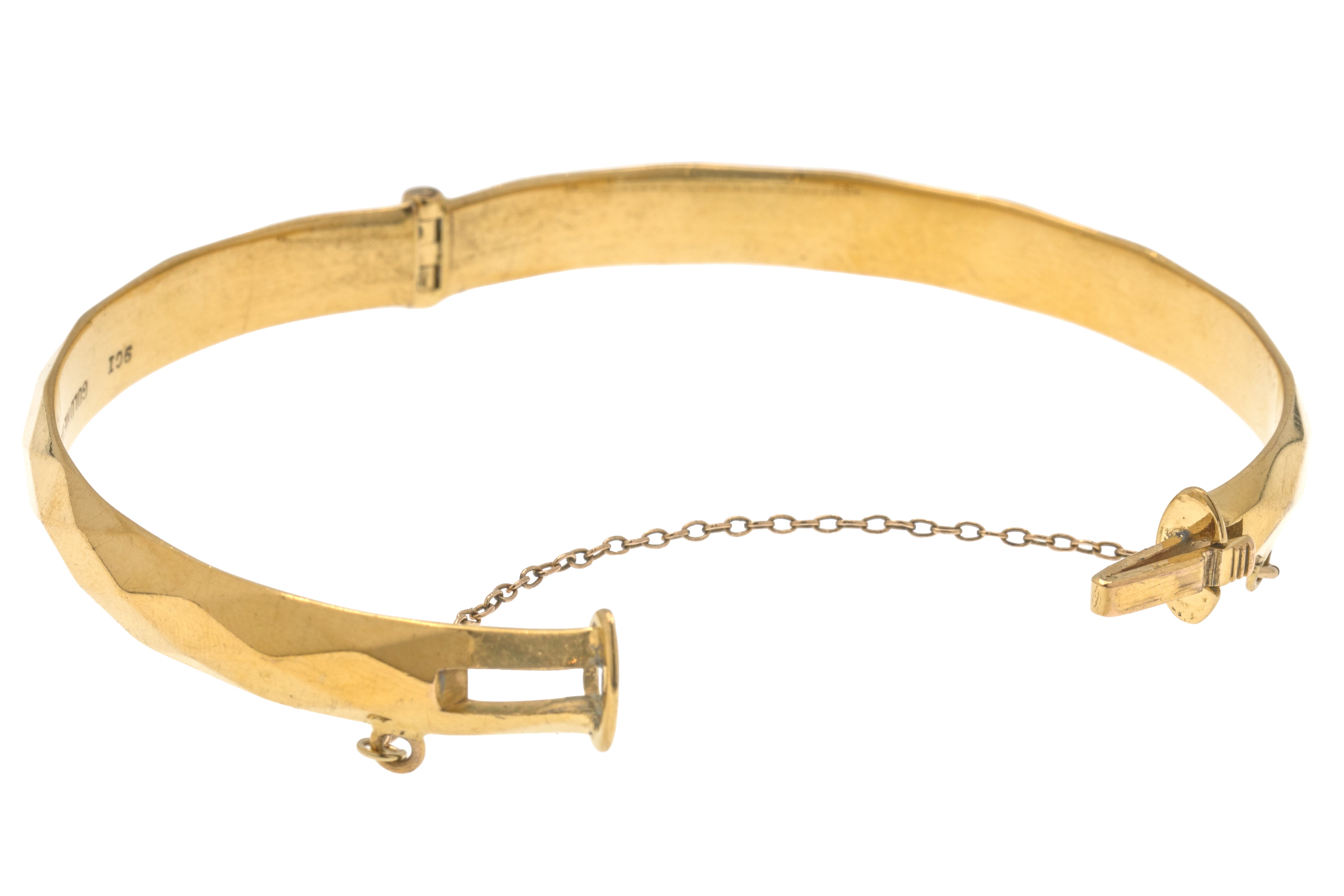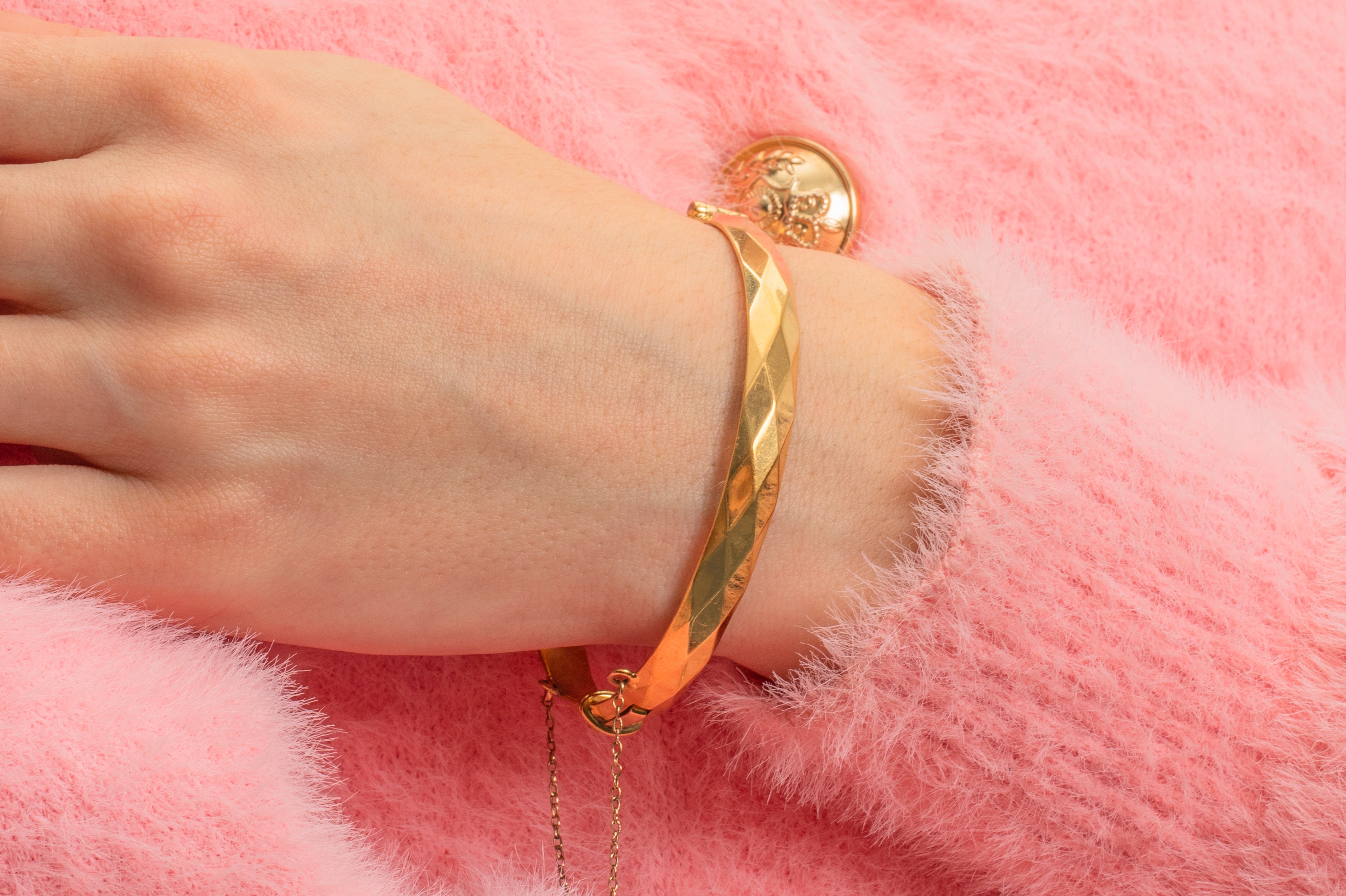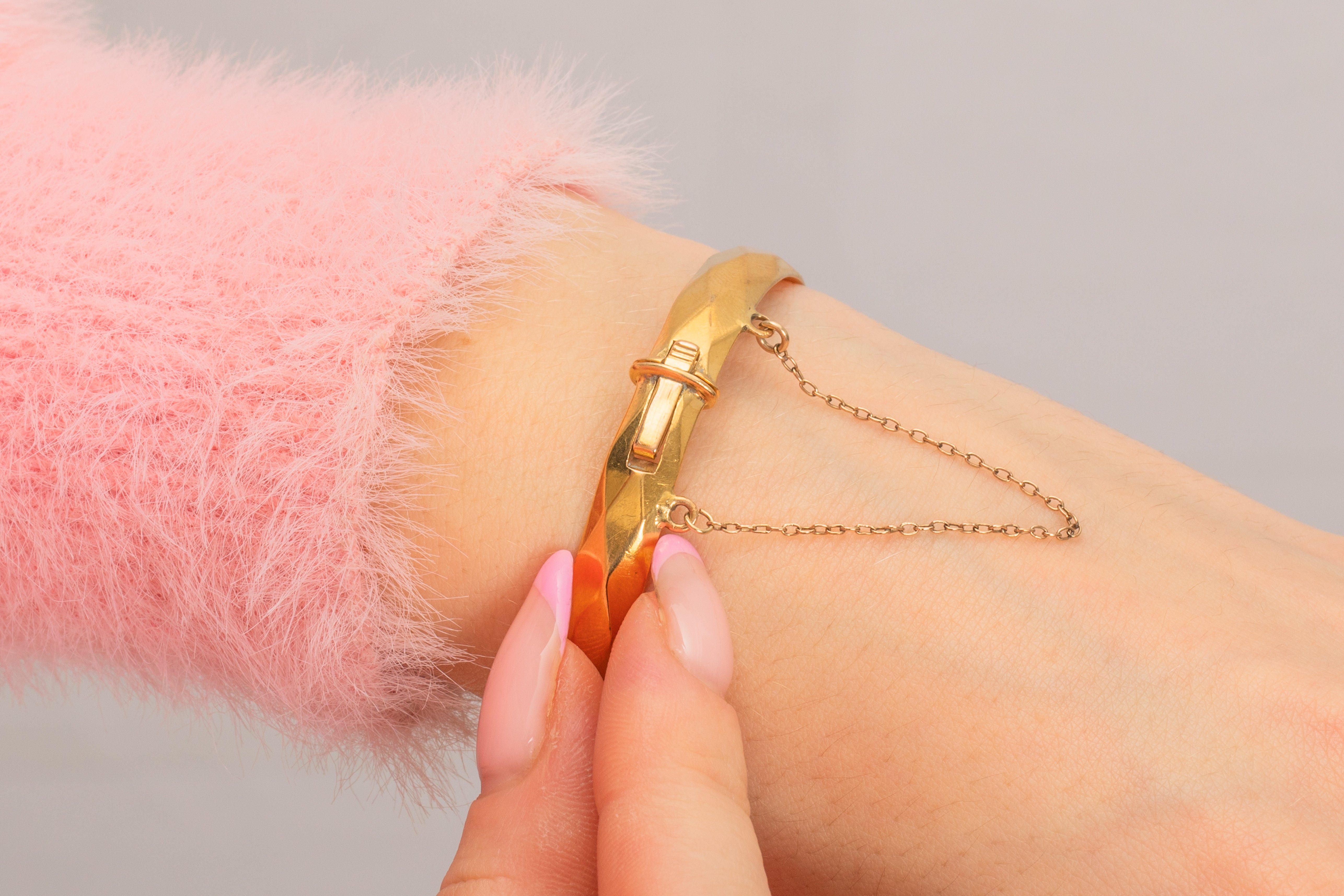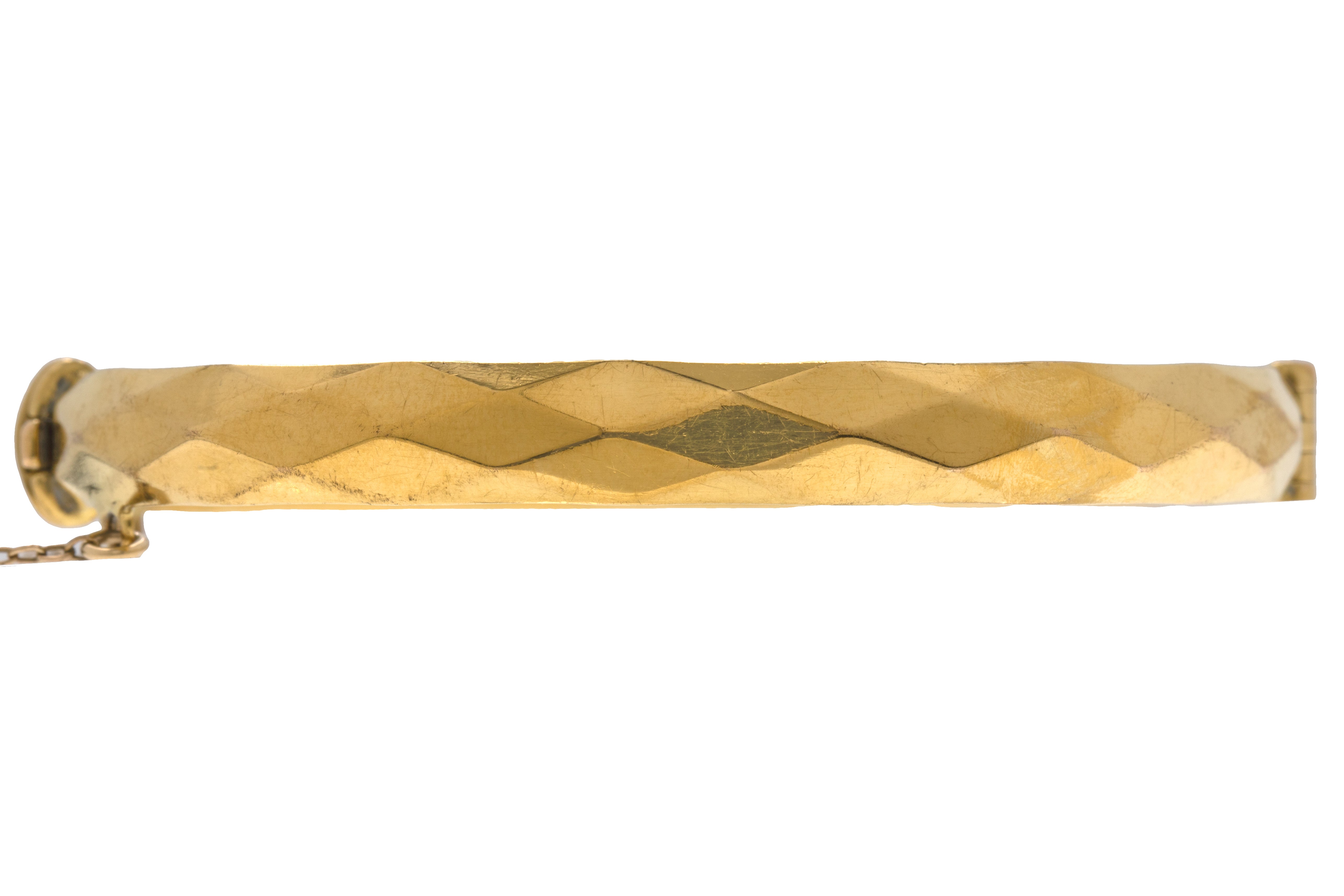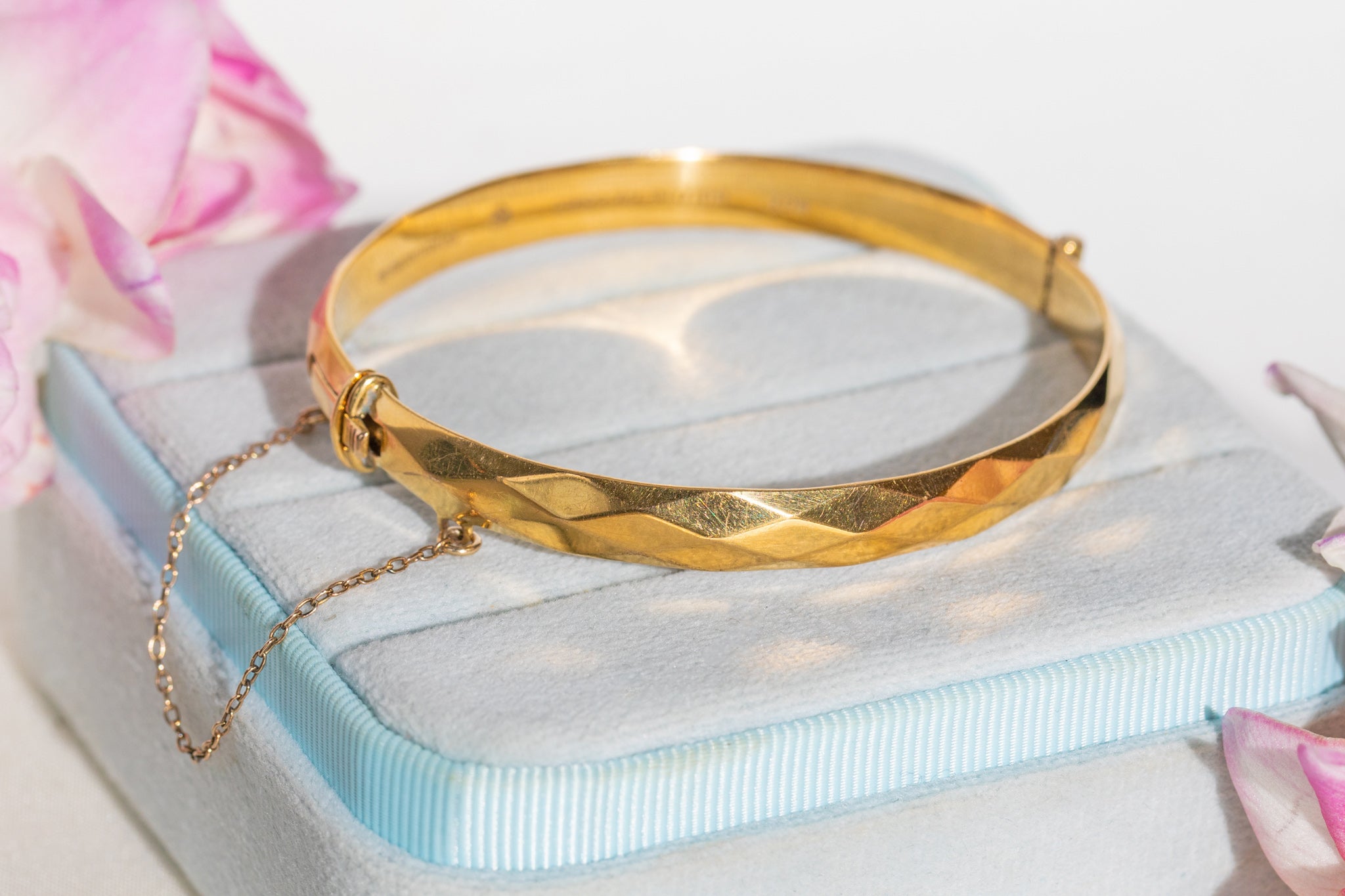 VERY GOOD. This 9ct rolled Gold faceted bangle is in very good condition! The Gold has a bright and buttery hue with some subtle wear along the edge of the facets, but nothing that detracts from her overall splendour. With a fully functioning clasp and safety chain, you can wear this striking bangle with ease and enjoy it with the utmost confidence.