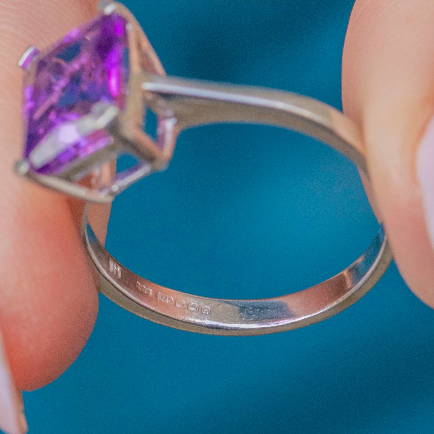 EXCELLENT. This 9ct White Gold Amethyst ring is in pristine condition. Her regal purple Amethyst is securely set in her claw settings, free from any chips, scratches or surface wear - she looks brand new! Her 9ct White Gold band is brilliant and bright, with practically no wear to her surface or evidence of resizing. Clearly hallmarked to the year 2007, this Amethyst ring will make a vibrant addition to your collection!