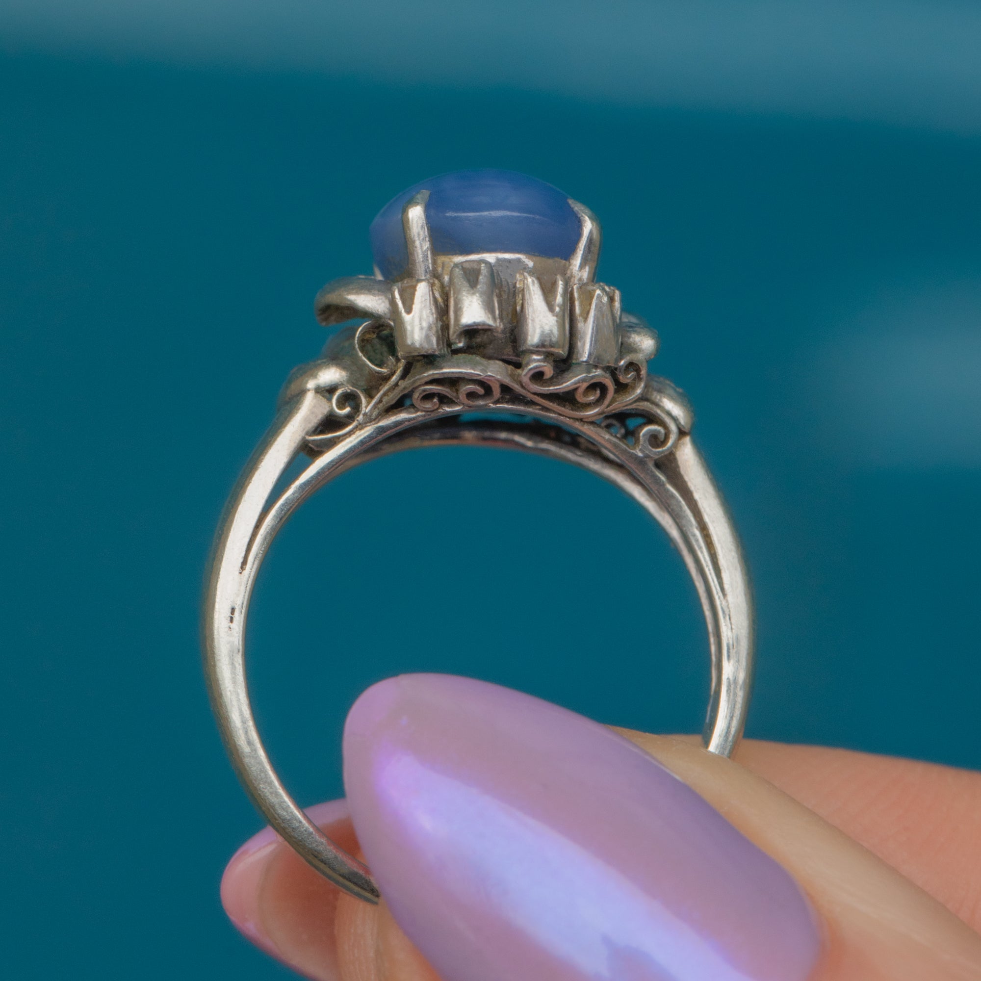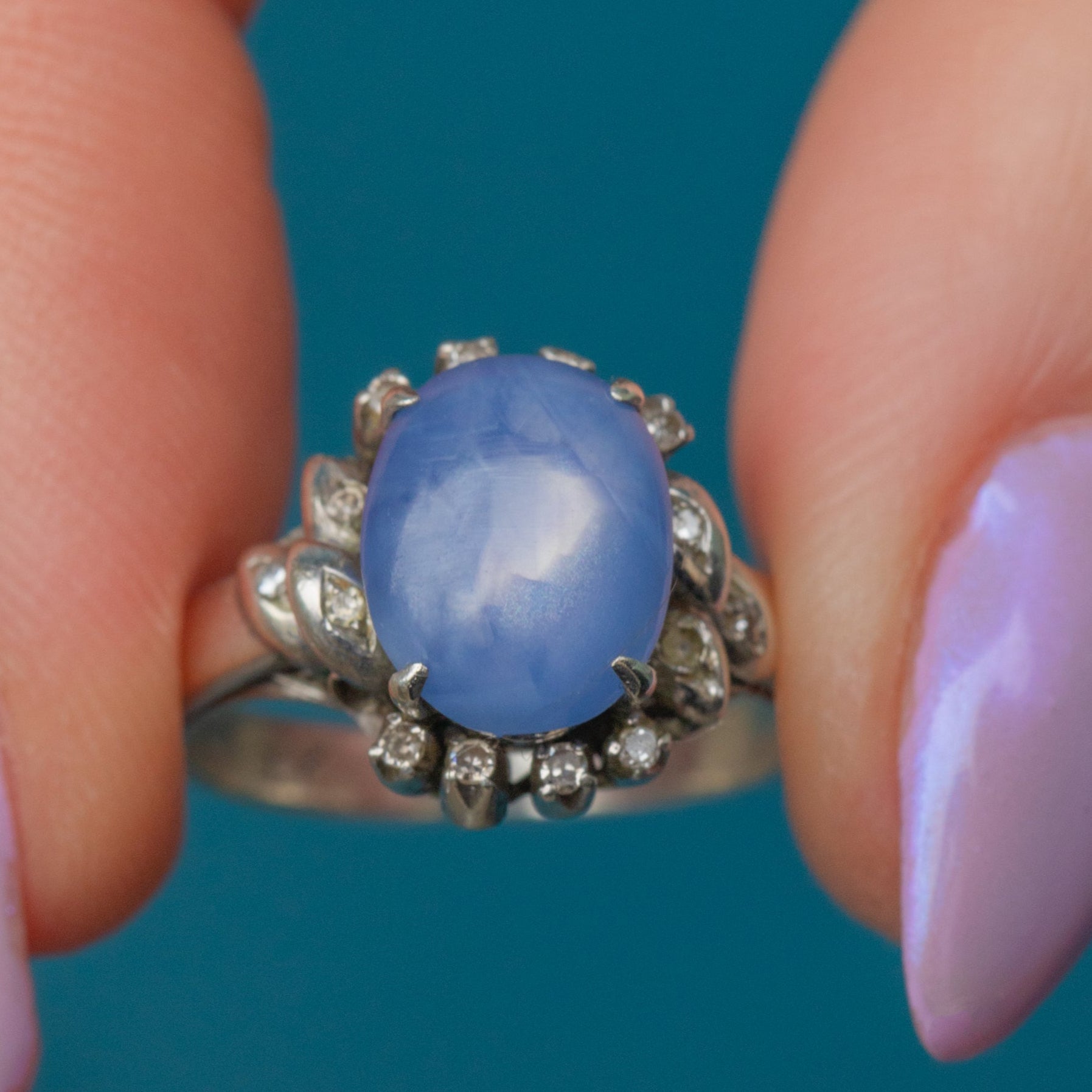 VERY GOOD. This 9ct White Gold natural Star Sapphire Diamond ring is in very good condition. The Star Sapphire is perfectly smooth with no signs of surface wear and is securely displayed within its claw settings. It displays strong asterism in direct light and the star is central on the gem. The growth lines suggest this is a natural no heat Sapphire. The Diamonds are all present adding a subtle sparkling accent to the petal details. There is a faint resize mark on the band, but this is only noticeable under close inspection and does not compact the integrity of the ring. Brimming with gorgeous details and promising many more years of enjoyment, don't hesitate to make this vintage Star Sapphire ring your newest obsession!