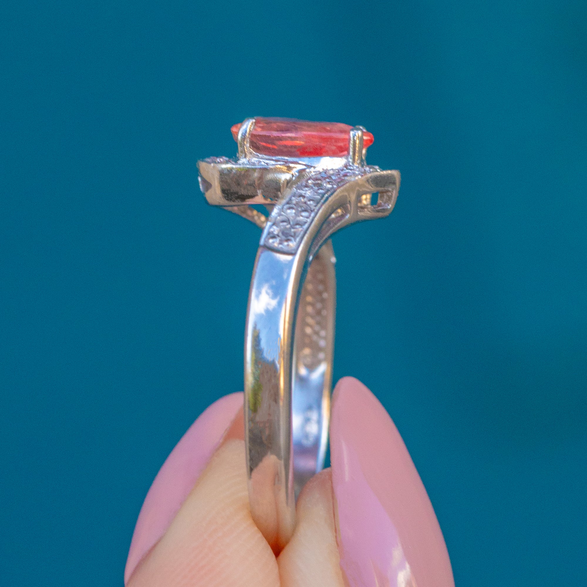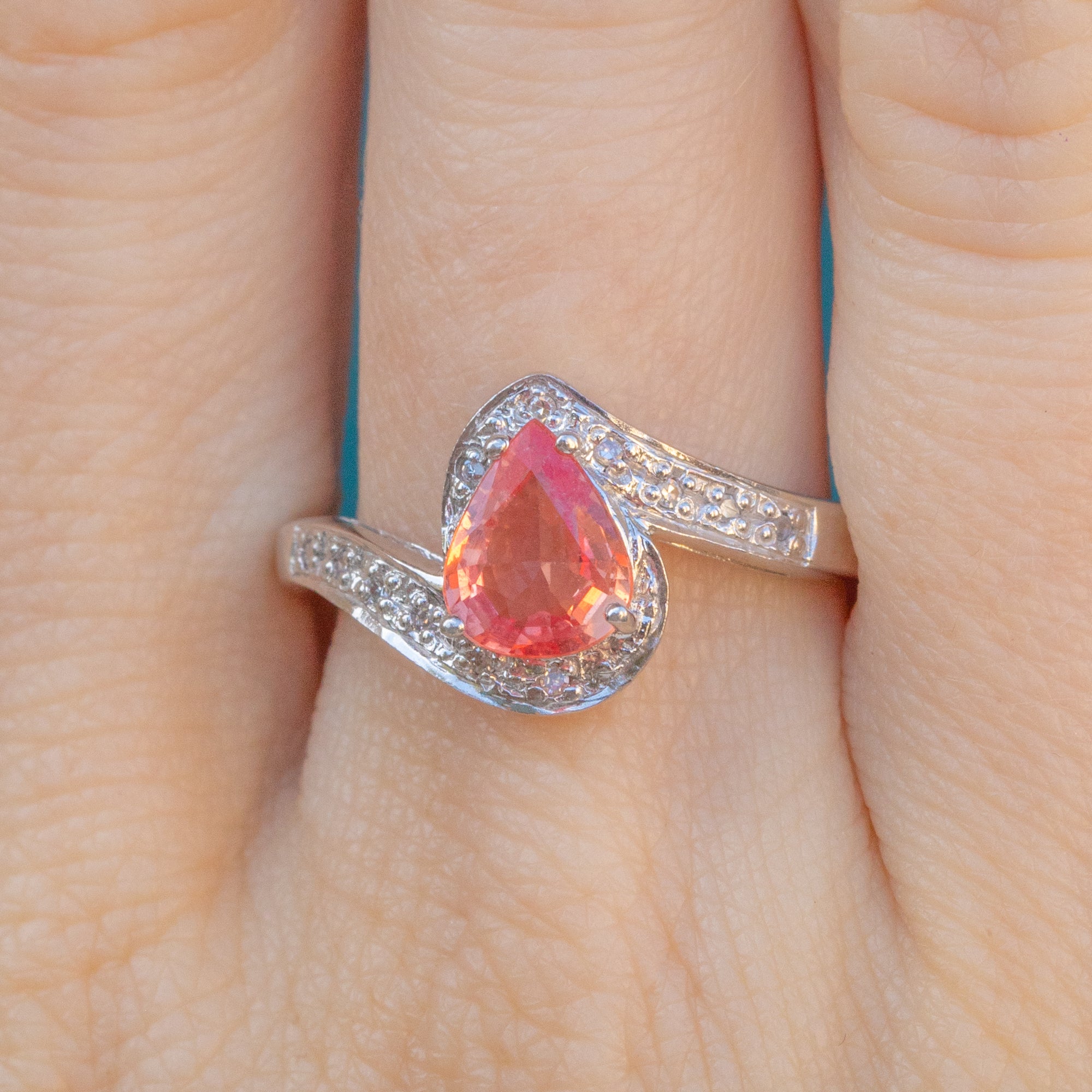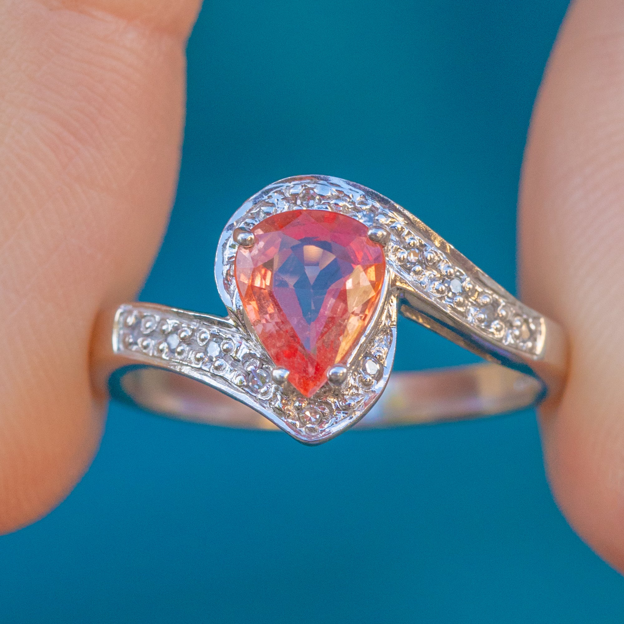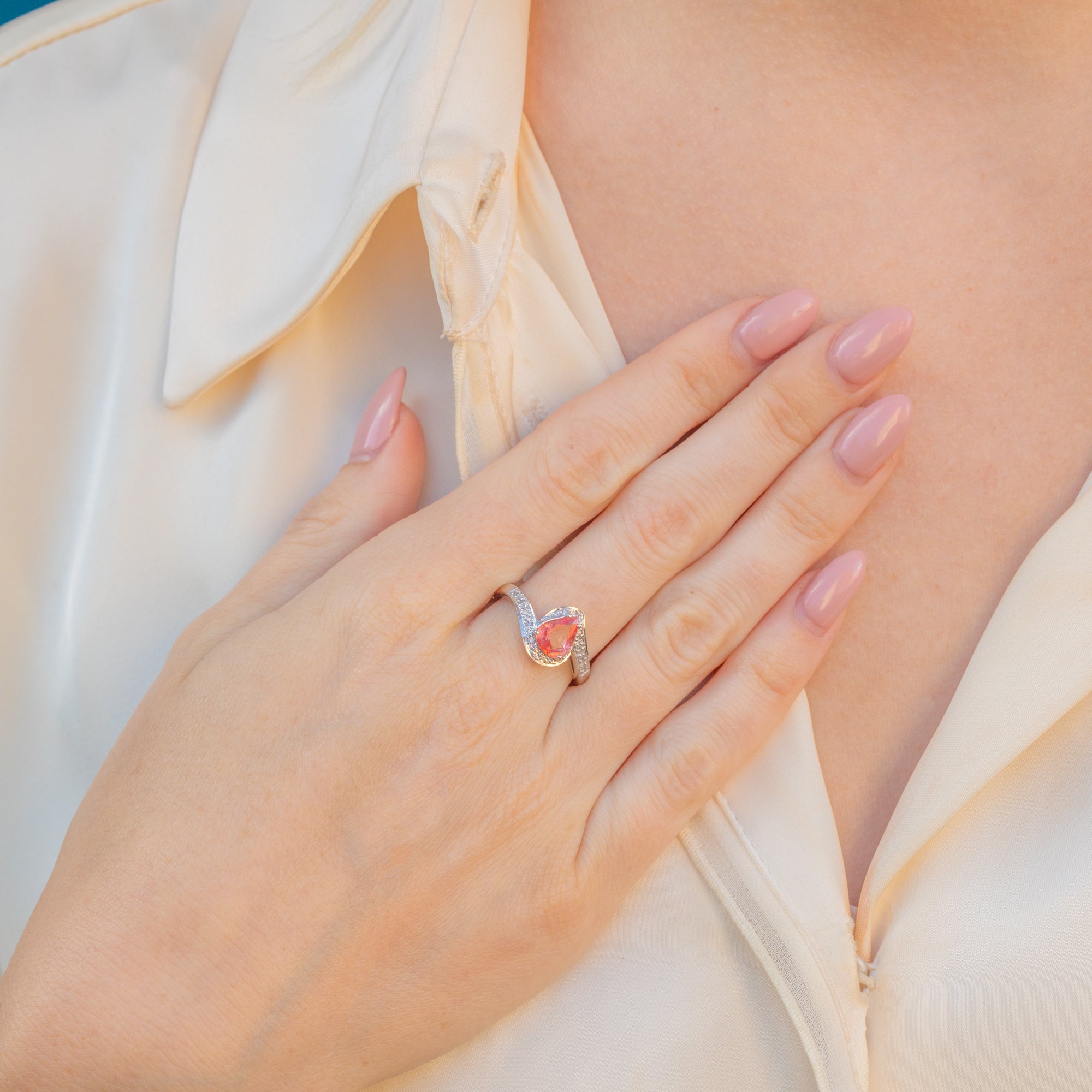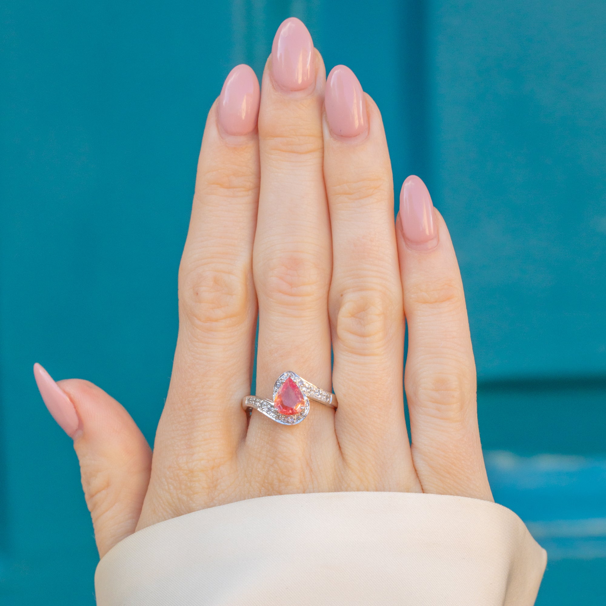 MATERIALS: 9ct White Gold, Padparadscha Sapphire (0.40ct), Diamonds/
