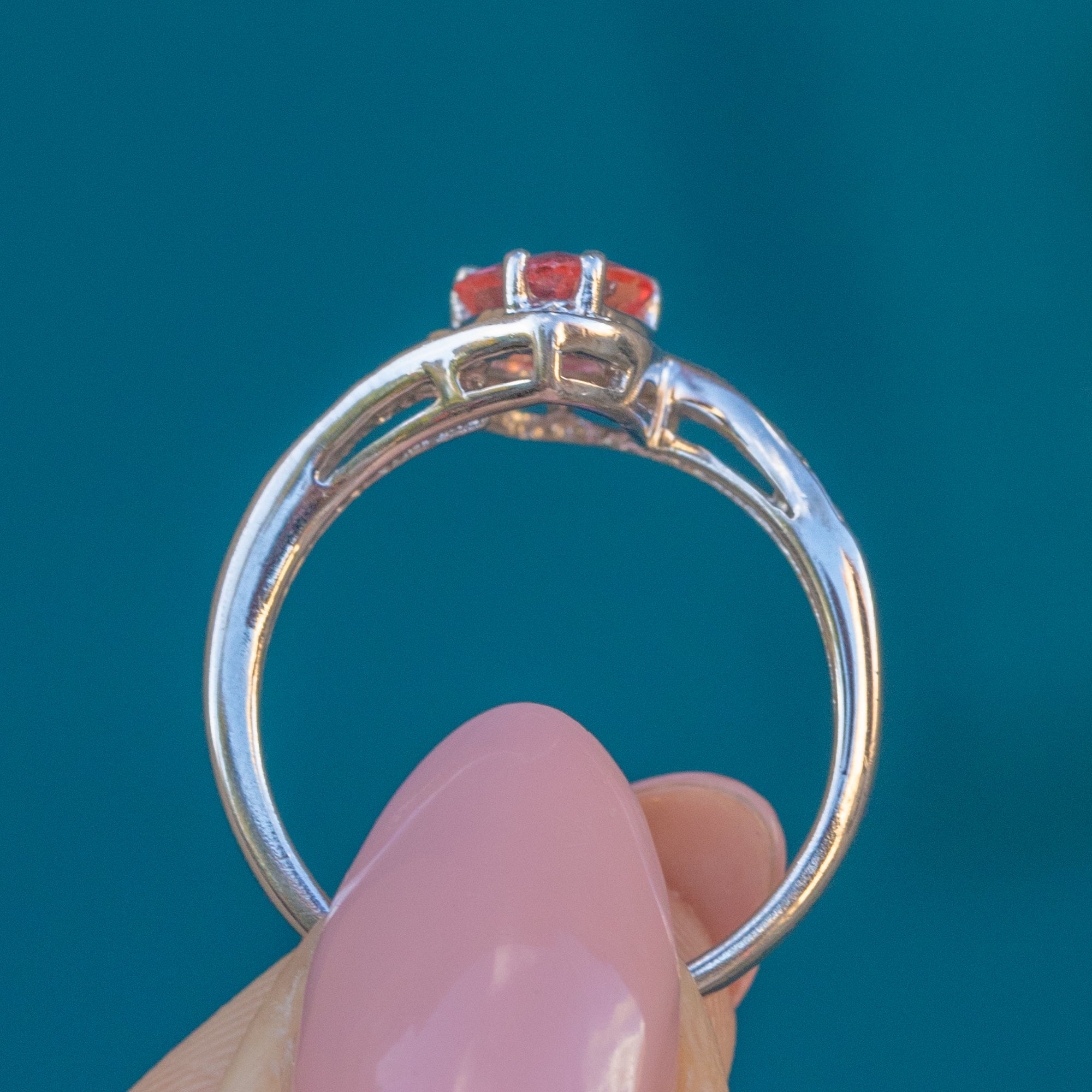 Her White Gold band is smooth and luxurious emphasising the coral tones of the impressive Padparadsha Sapphire. This vintage ring is unlike anything we have seen before and is sure to become your new favourite treasure!