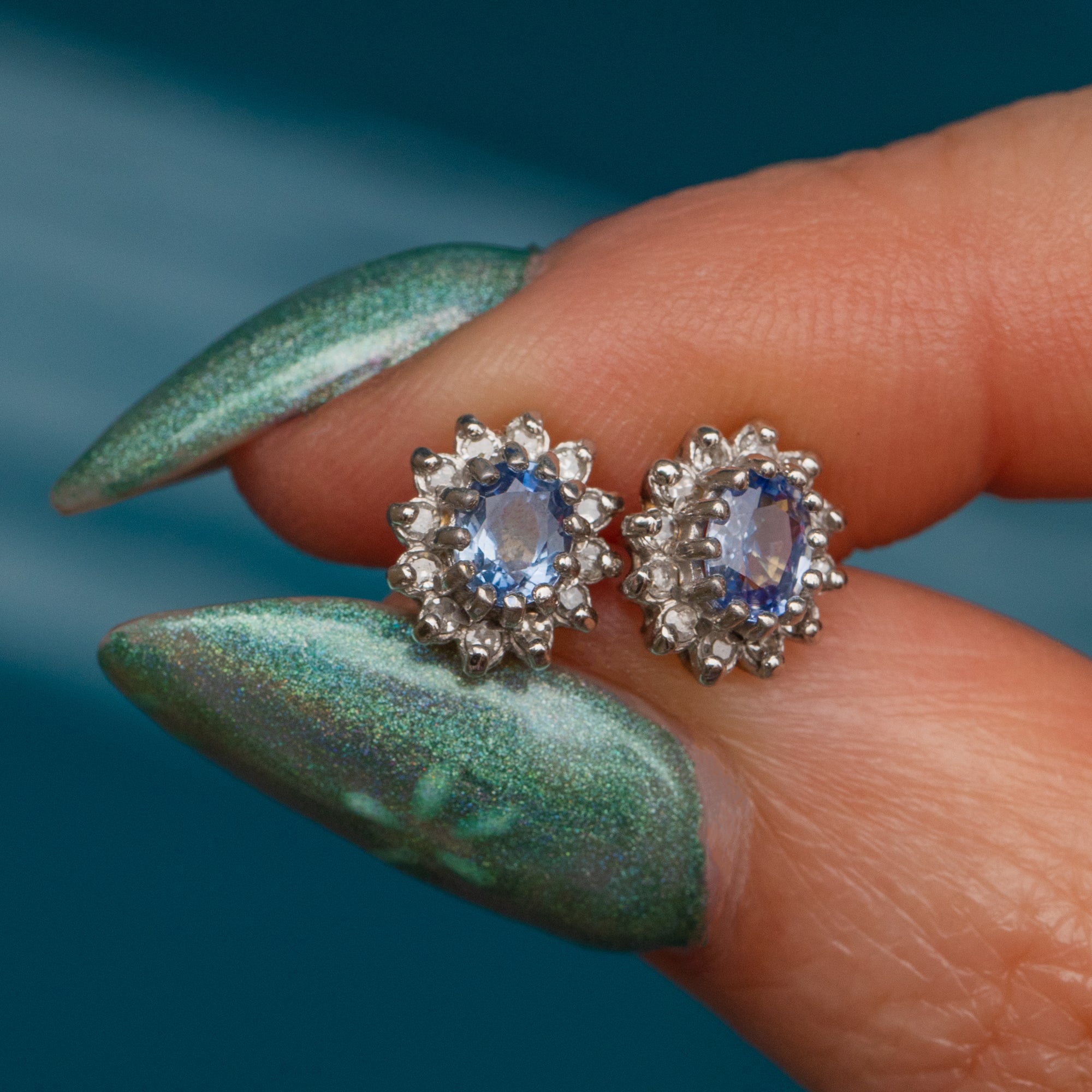 These 9ct White Gold Sapphire flower cluster stud earrings provide a glacial pop of colour. Homing a 0.20ct Sapphire in the centre of each flaunting soft cornflower hues surrounded by a sea of scintillating Diamonds, their sparkle mesmerise in an instant!