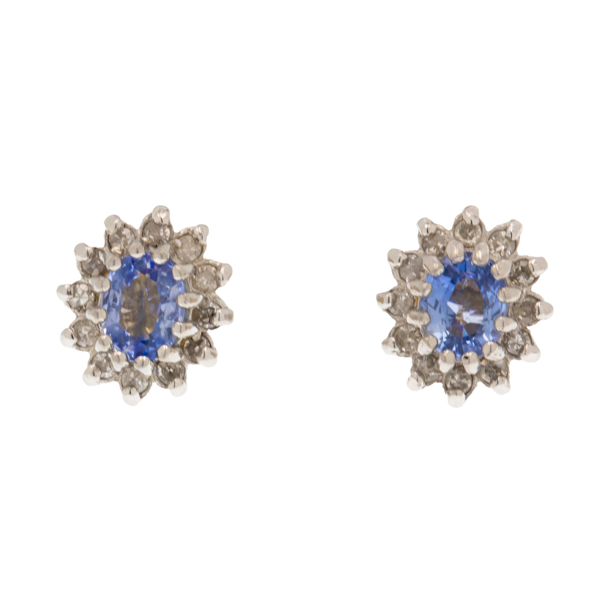 EXCELLENT. These 9ct White Gold Sapphire flower cluster stud earrings are in excellent condition. The gemstones are secure within their settings, and the overall form of the clusters are in tip-top shape. With securely soldered ear posts and tight-fitting butterfly backs, you can be sure these Sapphire Diamond earrings will sit securely in your lobes.