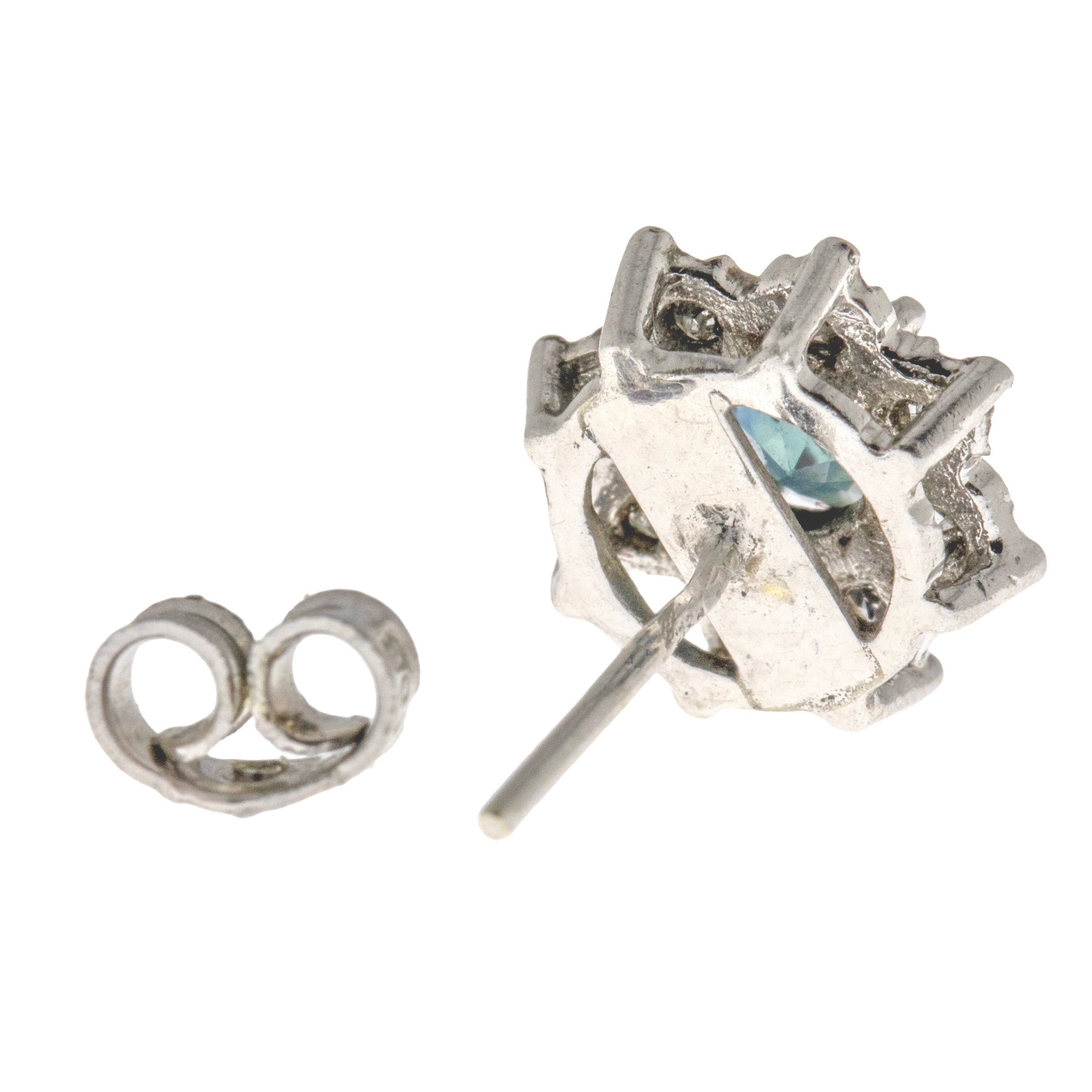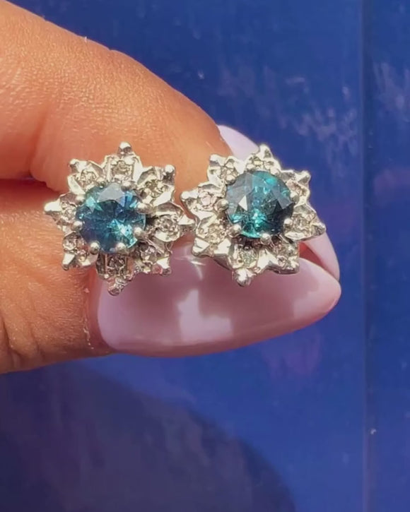 EXCELLENT. This pair of Sapphire Diamond cluster stud earrings are offered in excellent condition. The Sapphires and Diamonds are securely held within their settings and free from any nibbles or abrasions. The 9ct White Gold have a lustrous shine and the posts are firmly soldered, with butterfly backs providing secure closure. With proper care and maintenance, these vintage stud earrings will last for generations to come!
