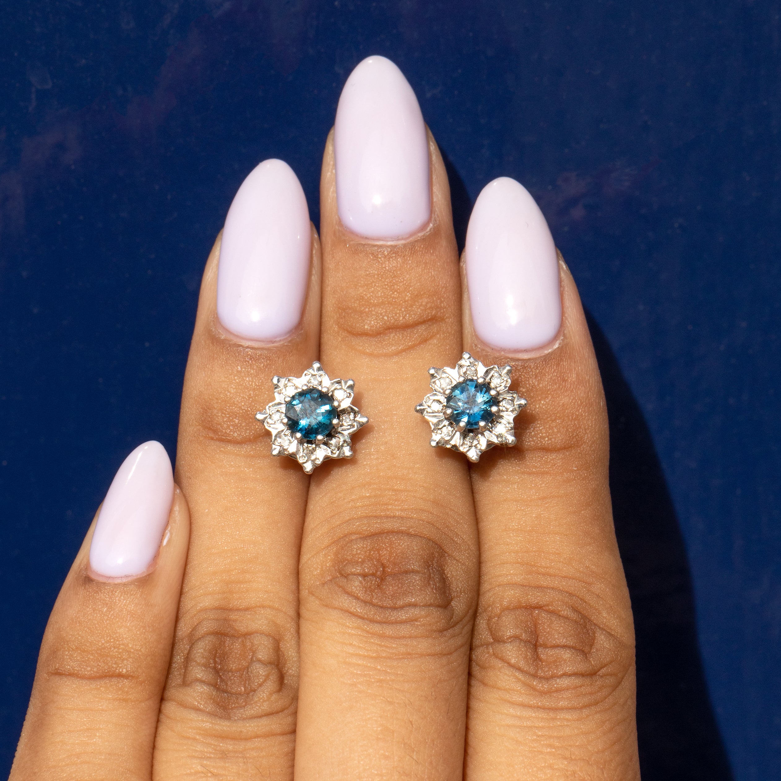 Fall in love with the opulence of these 9ct white Gold Sapphire Diamond cluster stud earrings! Crafted from solid 9ct White Gold, each earring boasts a deep blue Sapphire, with a combined weight of 1.00ct, haloed by eight twinkling Diamond embellished petals.