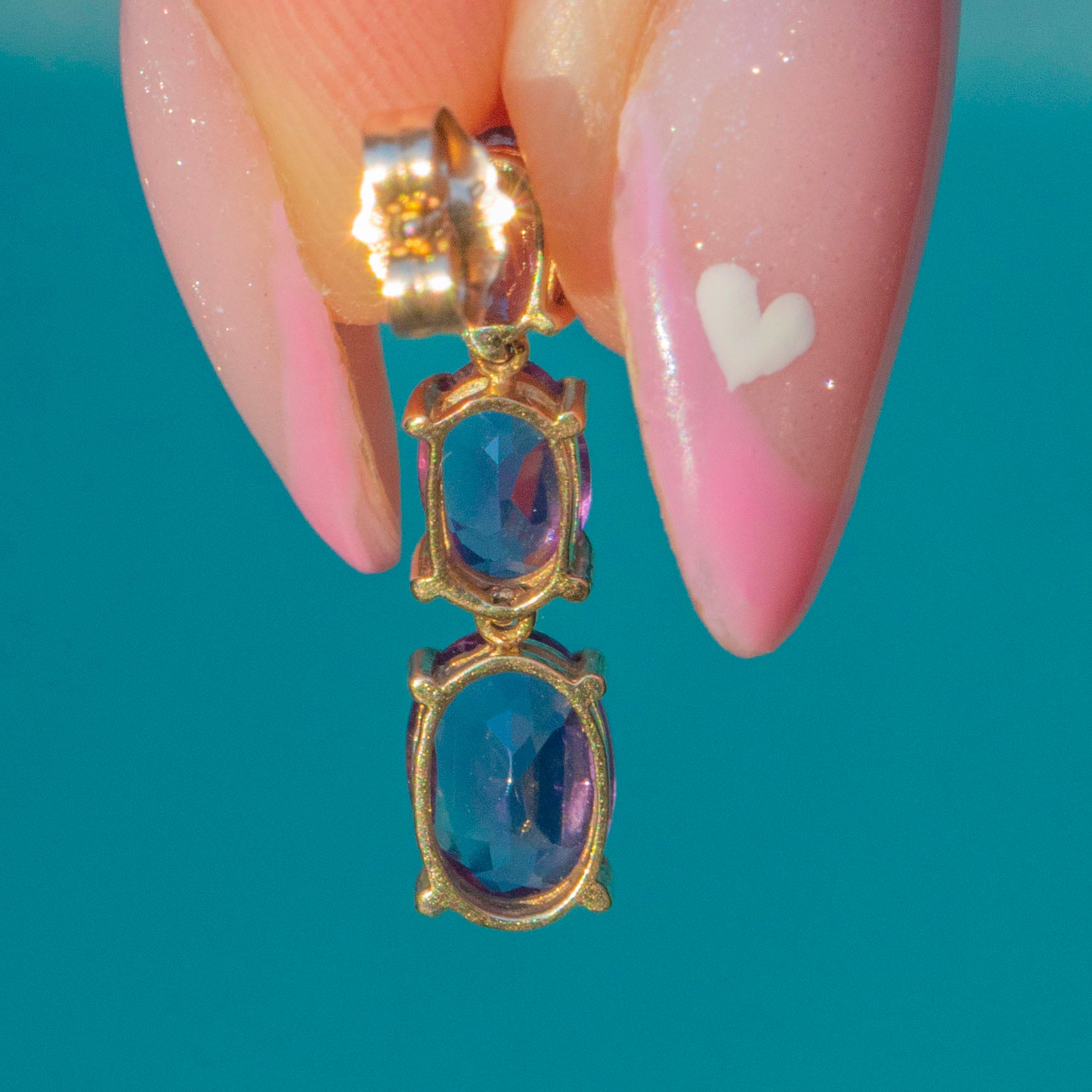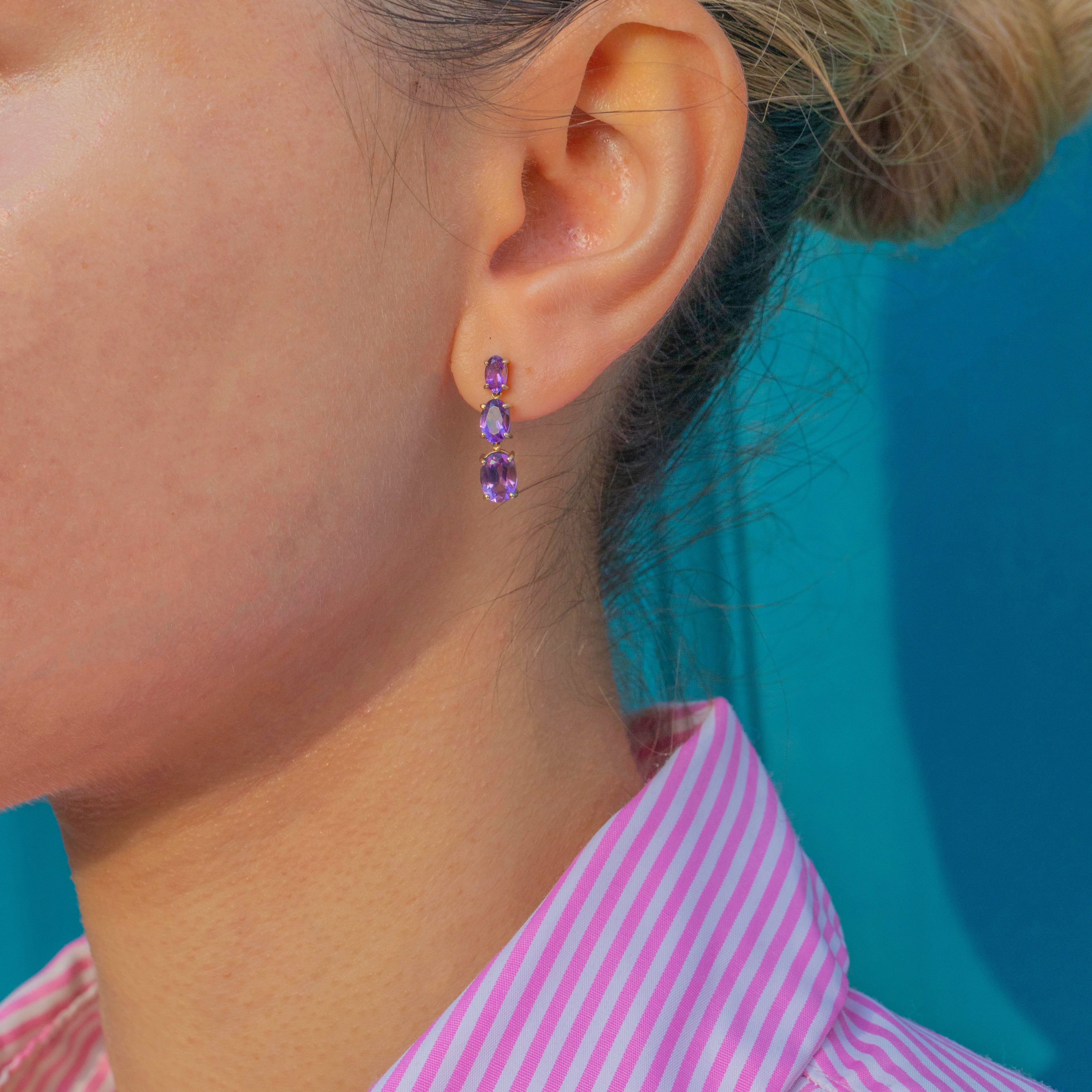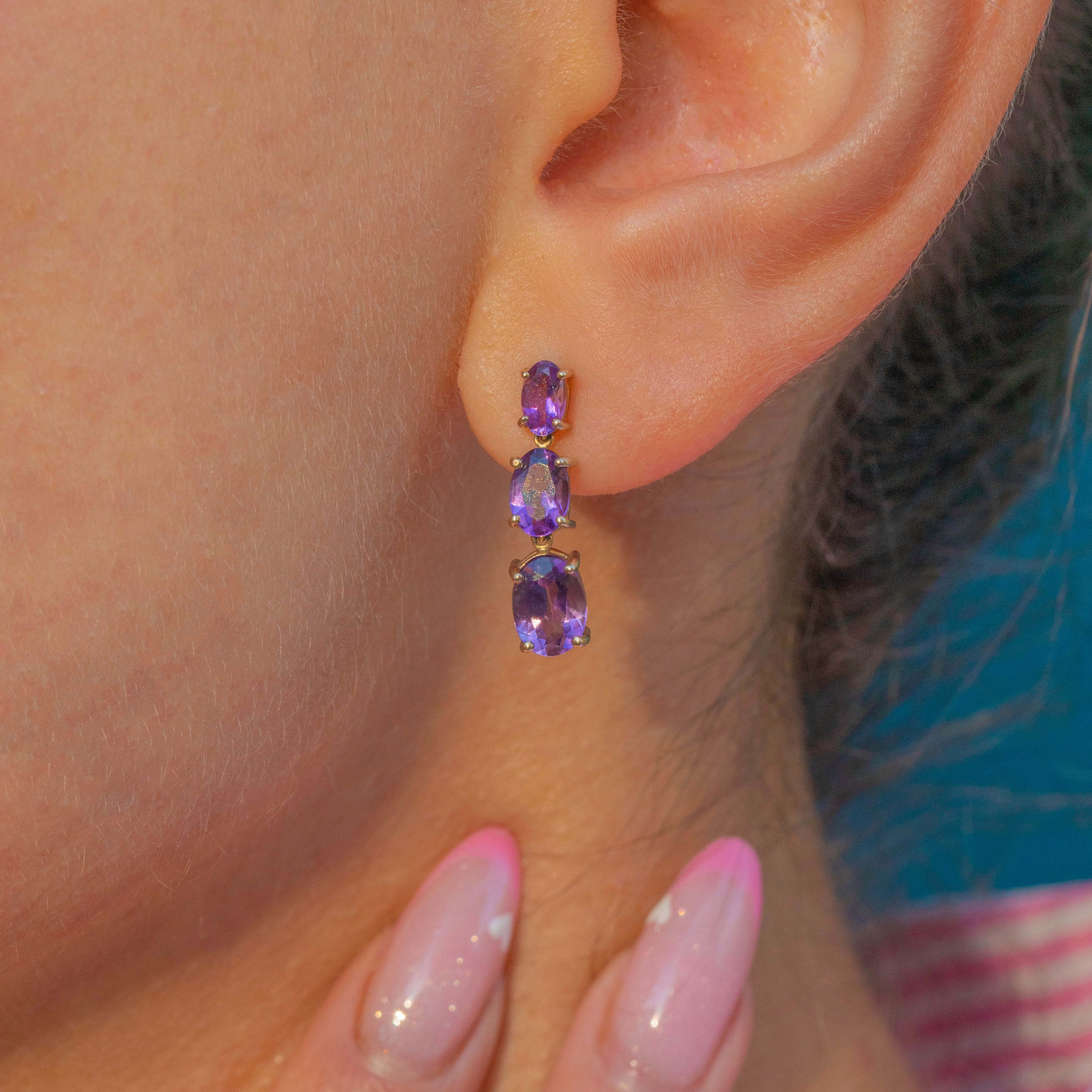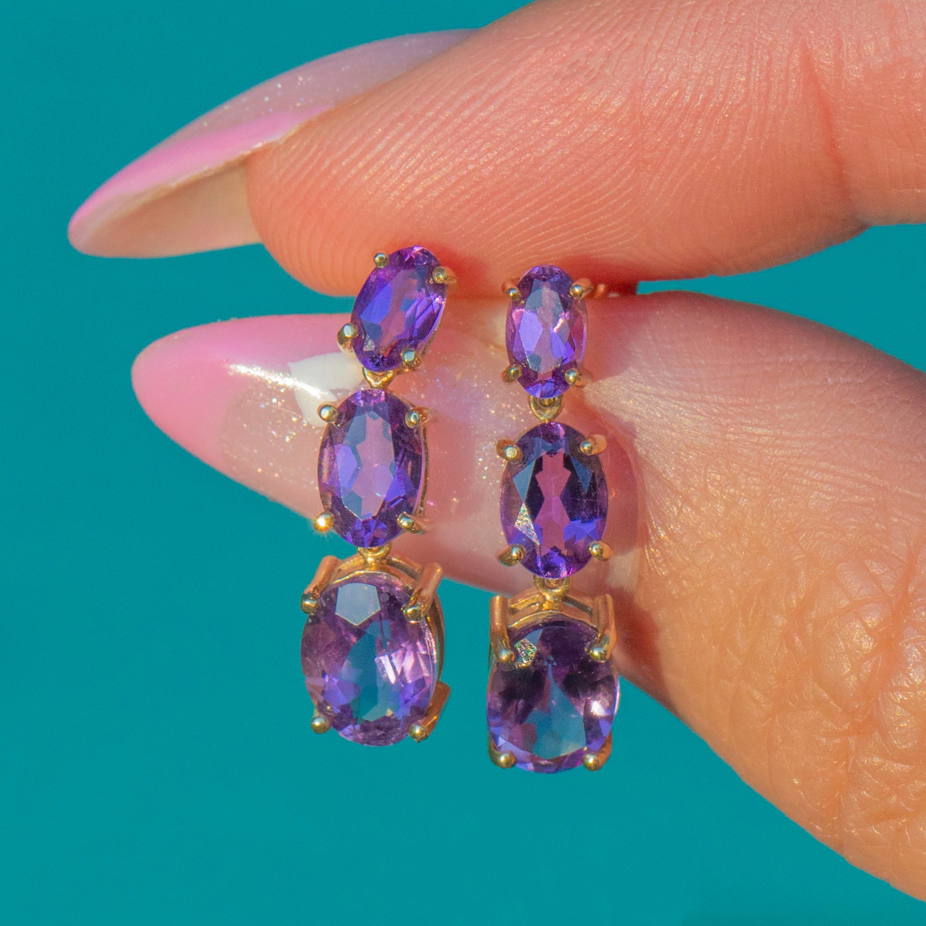 Graceful and refined, these Modern 10ct Gold earrings feature three graduating oval Amethysts in a chic articulated drop design.