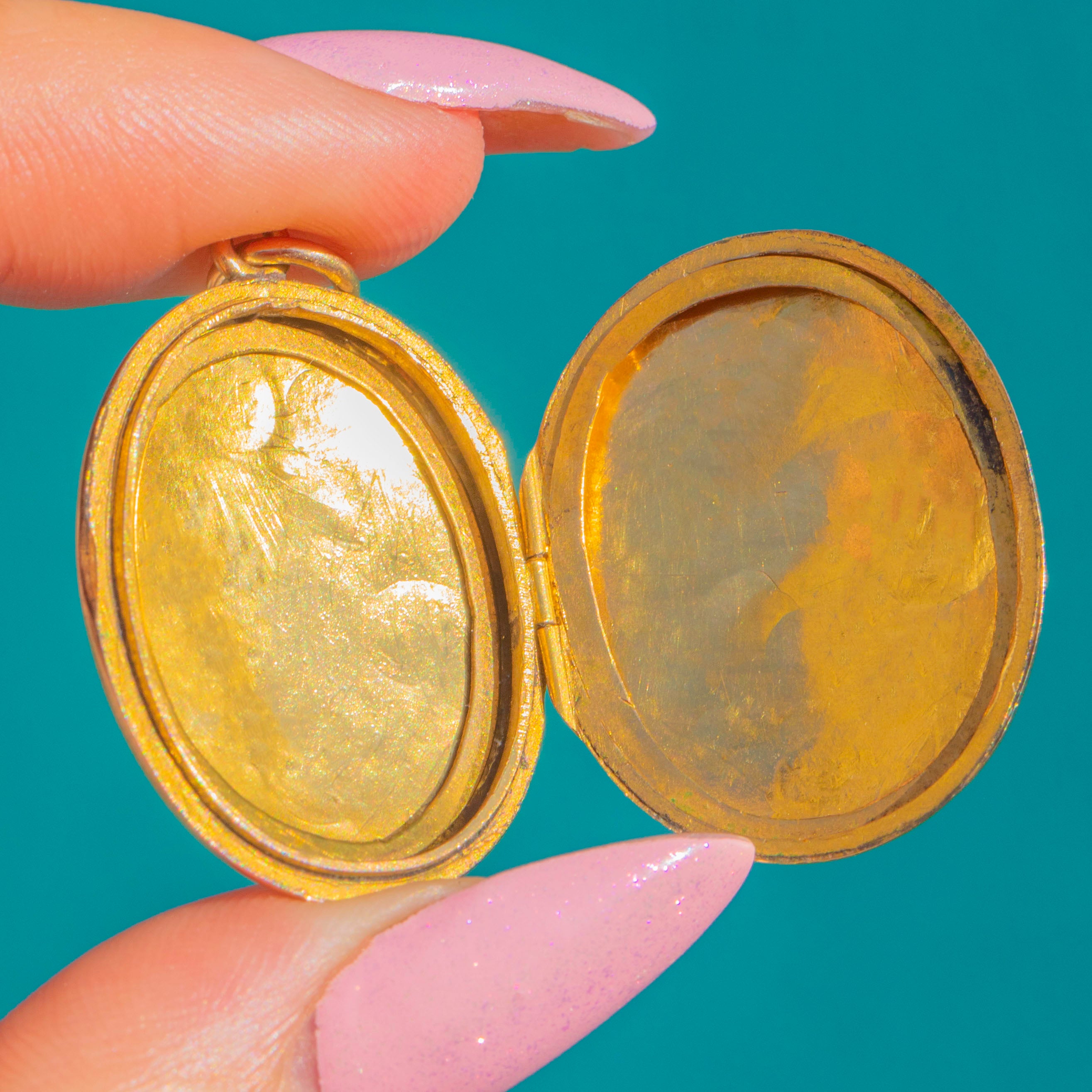 VERY GOOD: The Gold is bright with crisp engravings and only light surface scratches, minor dings and gentle discolouration, with attractive patina in the engraved recesses, all consistent with age. The interior rims are present with expected wear from use. A small area of solder is visible at the base of the hasp, indicative of a past reinforcement; overall the locket presents beautifully and is ready to enjoy.
