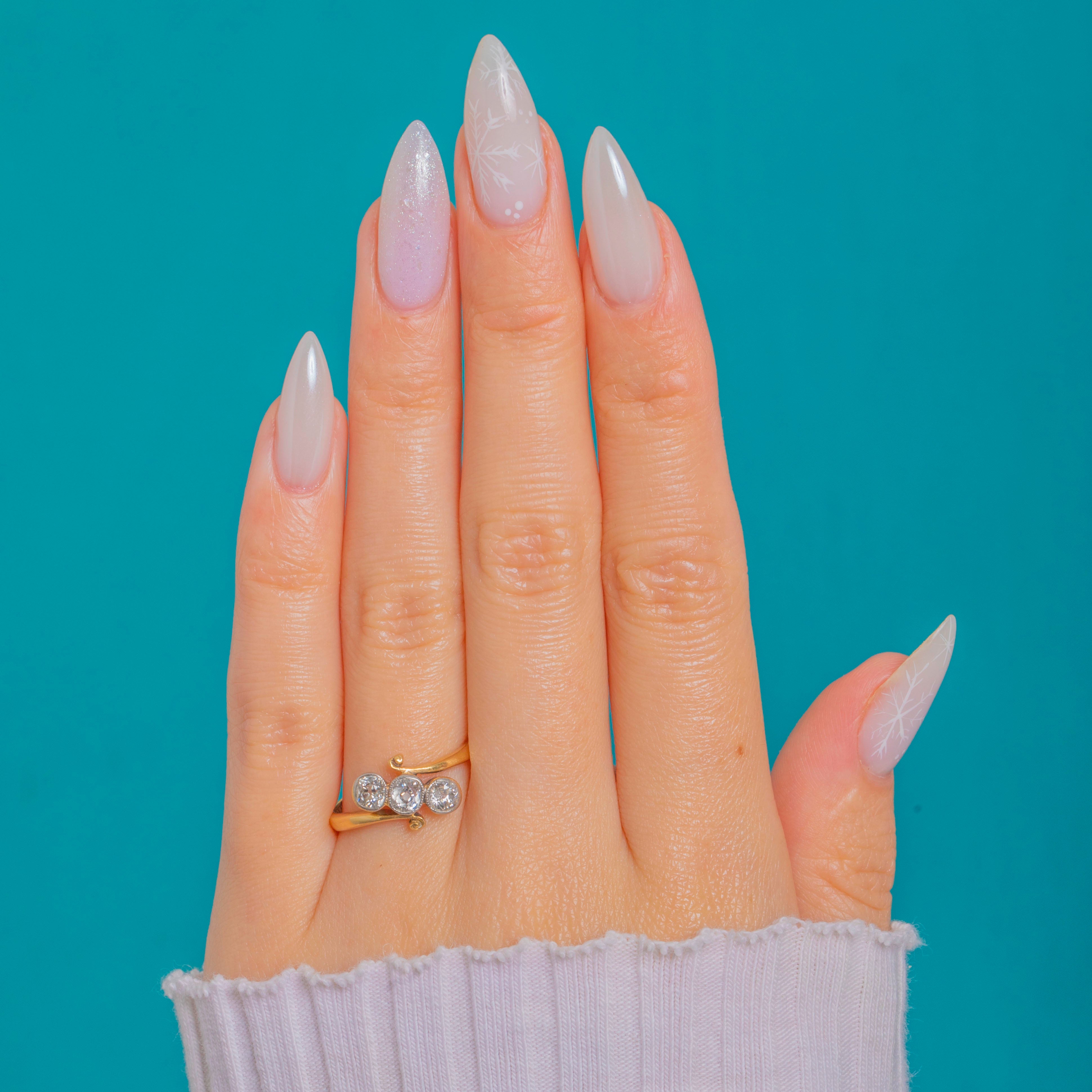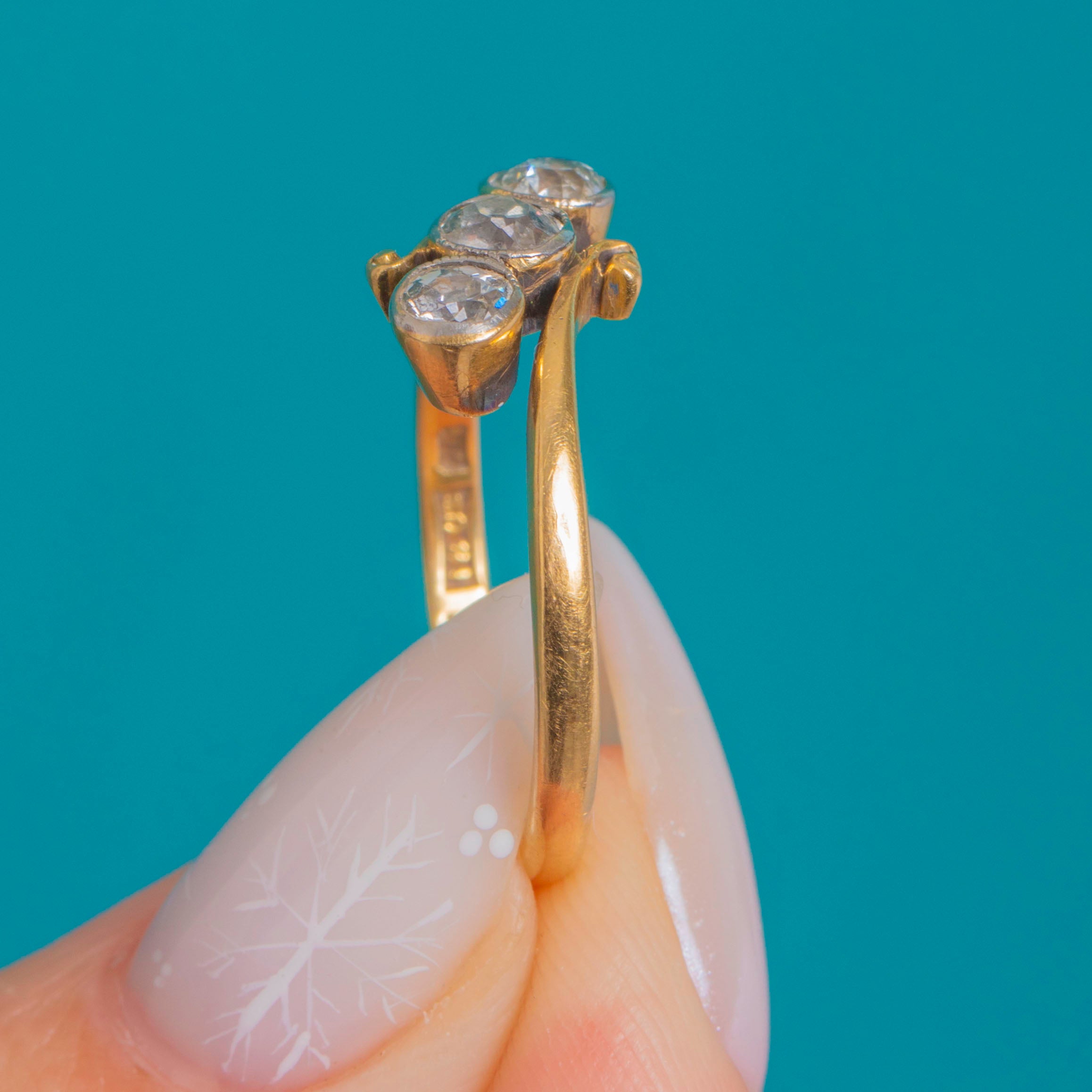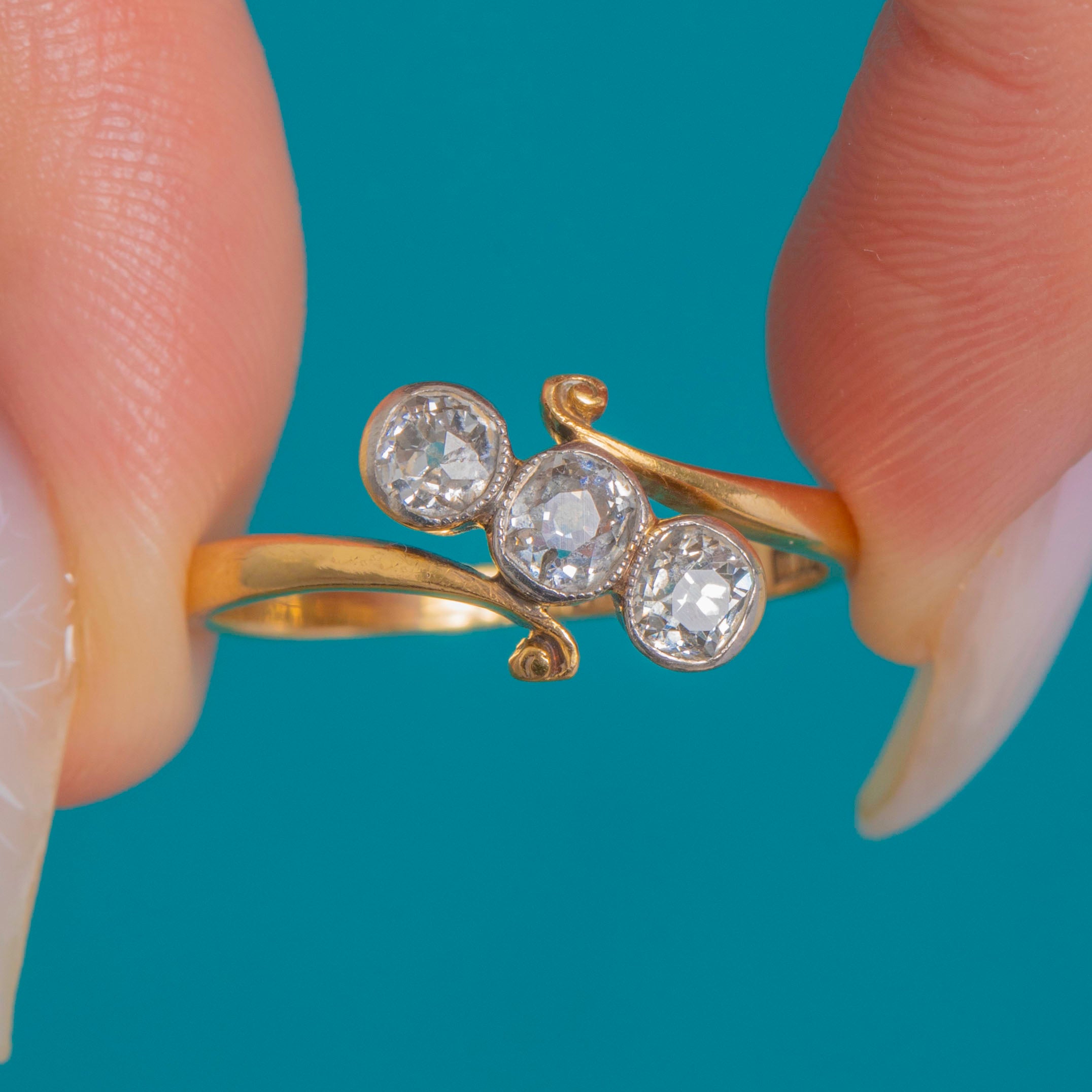 Delicate and romantic, this antique twist trilogy ring captures the Belle Époque mood with effortless finesse. Three bright, scintillating Old Mine Cut Diamonds are set in white Gold topped rub-over bezels, their fine millegrain edges and linear arrangement elegantly framed by sinuous crossover S-scroll shoulders. Crafted in 18ct Gold, the low-profile head sits close to the finger for a refined, wearable silhouette.