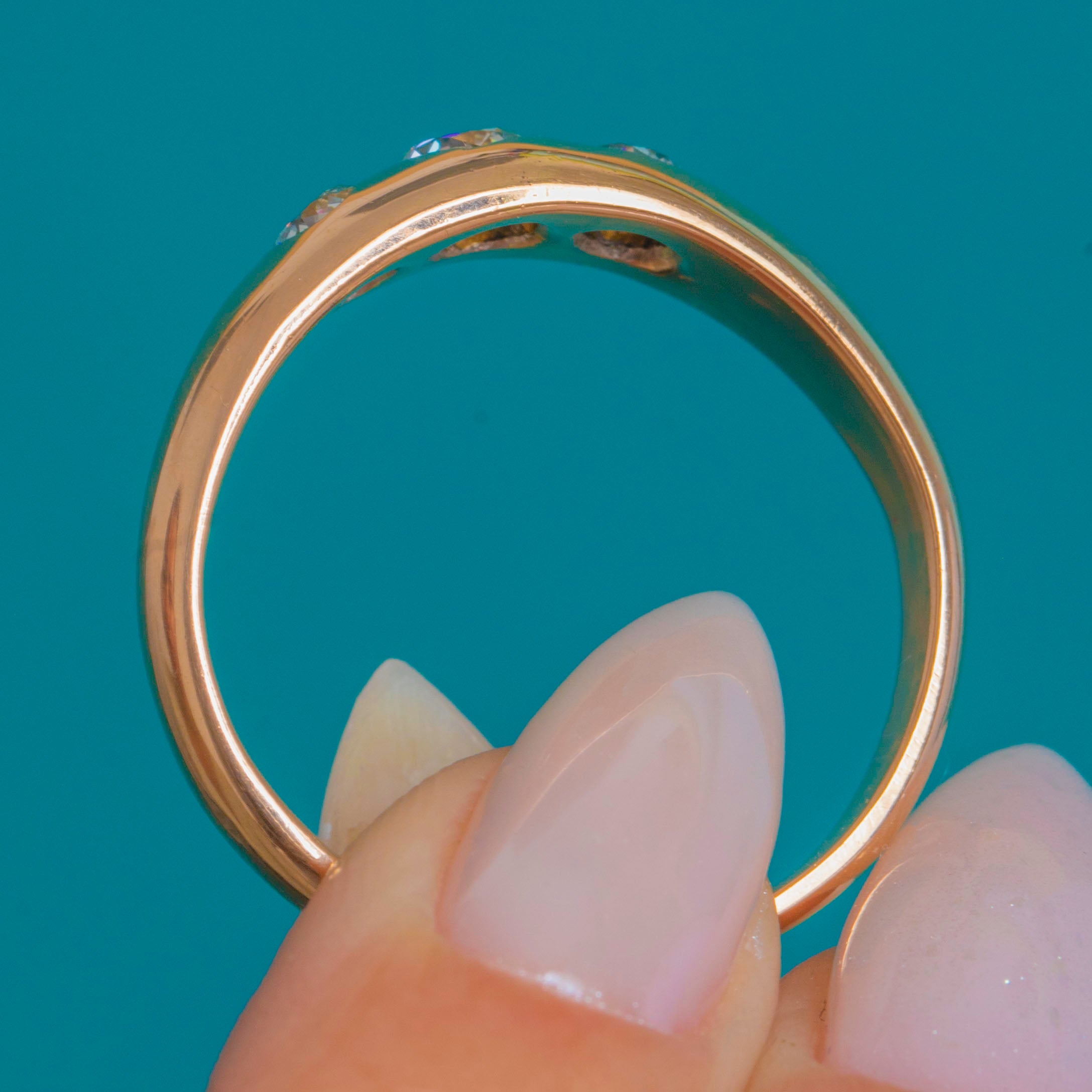 Sleek, sculptural and so wearable, this antique trilogy ring showcases three Old European Cut Diamonds set flush into a domed 14ct Gold band. The low-profile gypsy settings and polished curves give it that effortless Victorian elegance, while the graduated Diamonds sparkle crisply against the warm glow of the Gold.