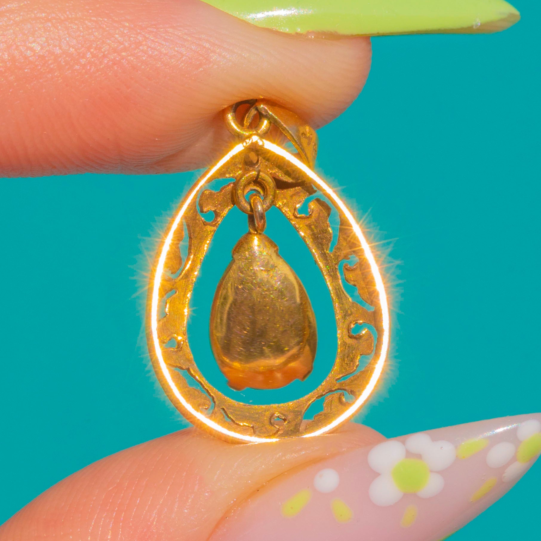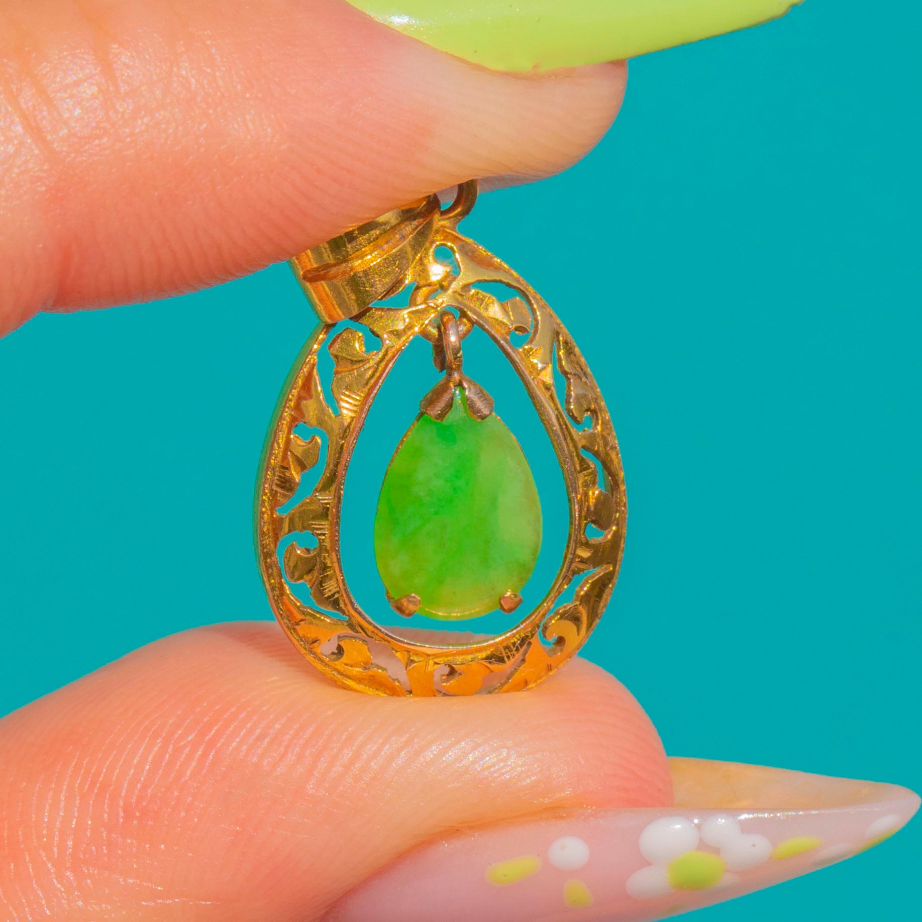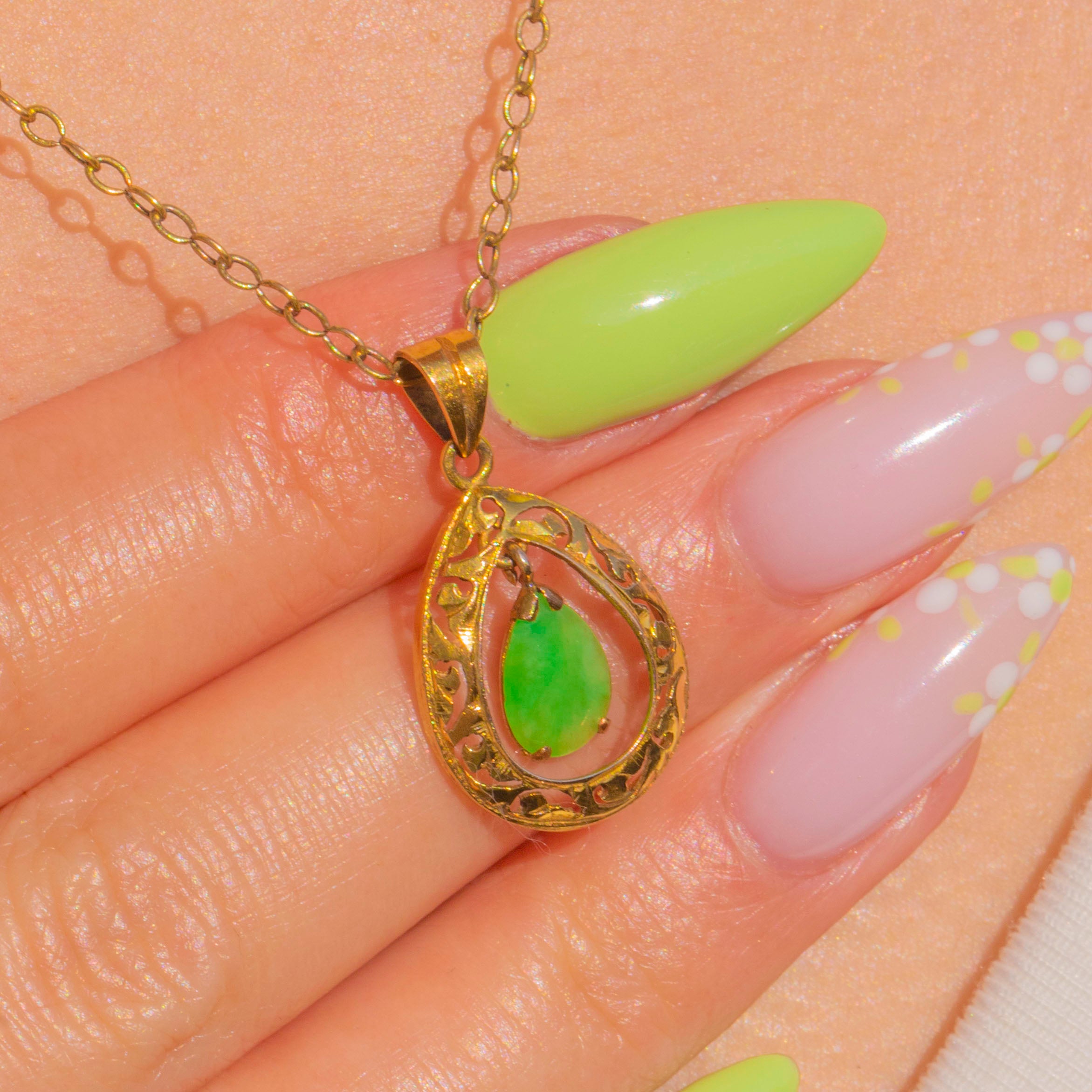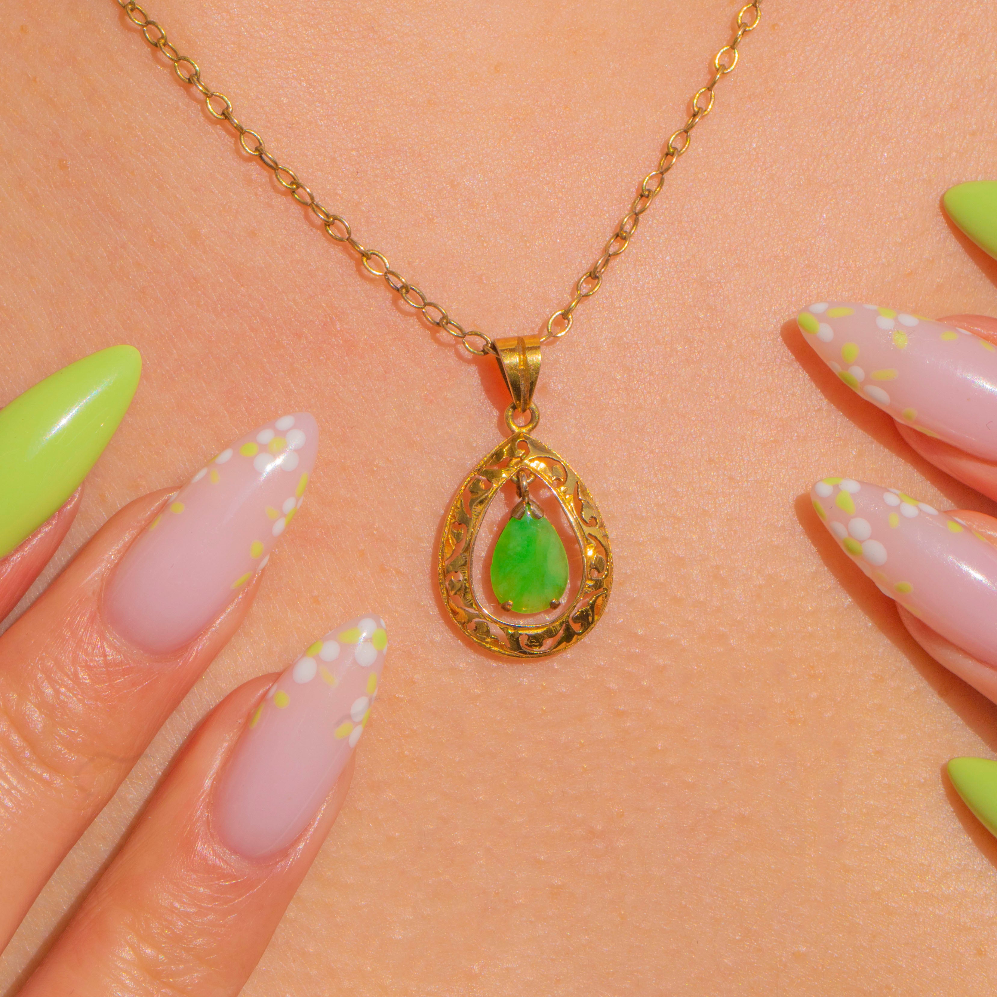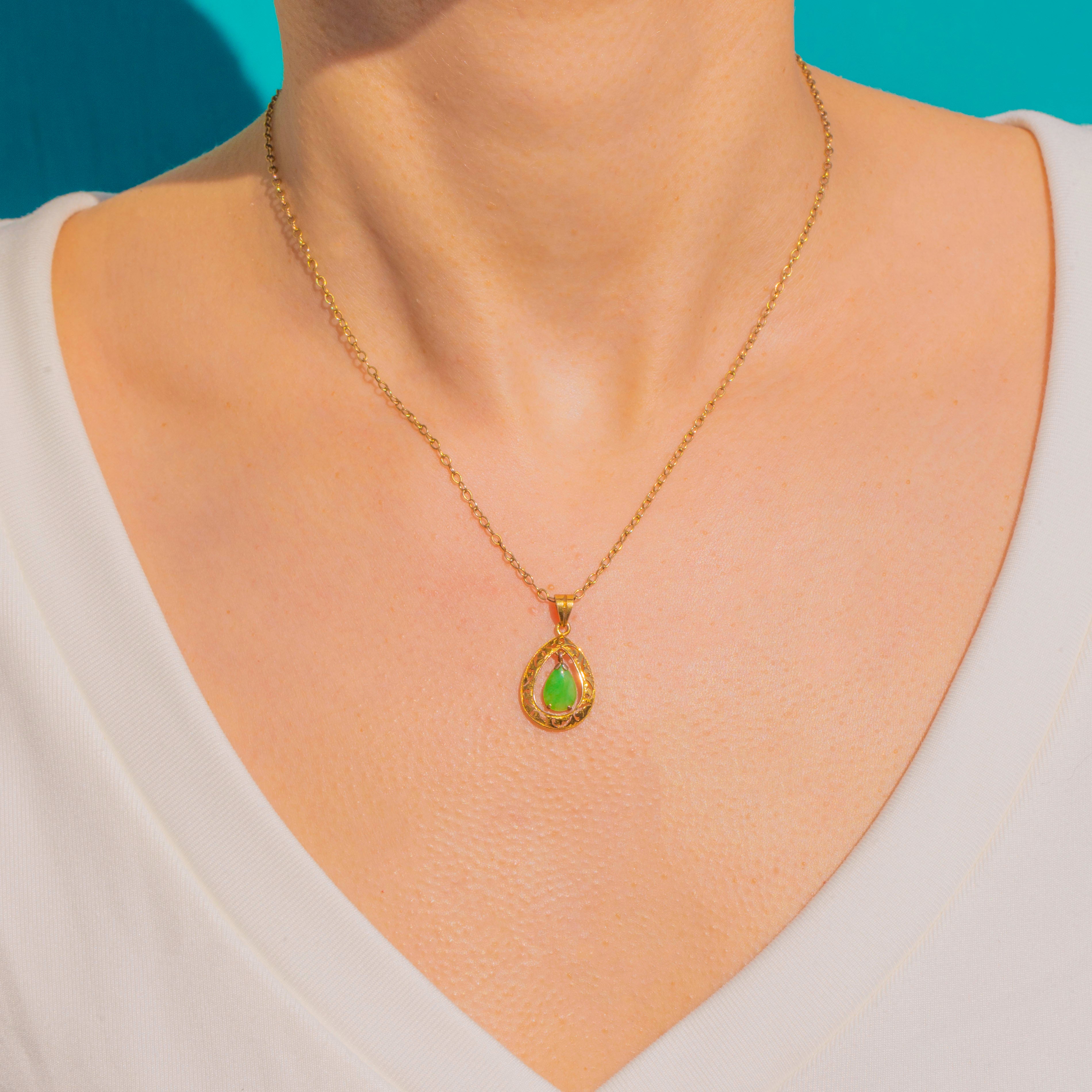 A graceful Art Deco teardrop pendant in 14ct Gold, finely pierced with romantic foliate scrolls and framing a suspended pear Jade cabochon. The inner drop is articulated so it moves within the outer frame, adding a soft, fluid shimmer as you wear it.