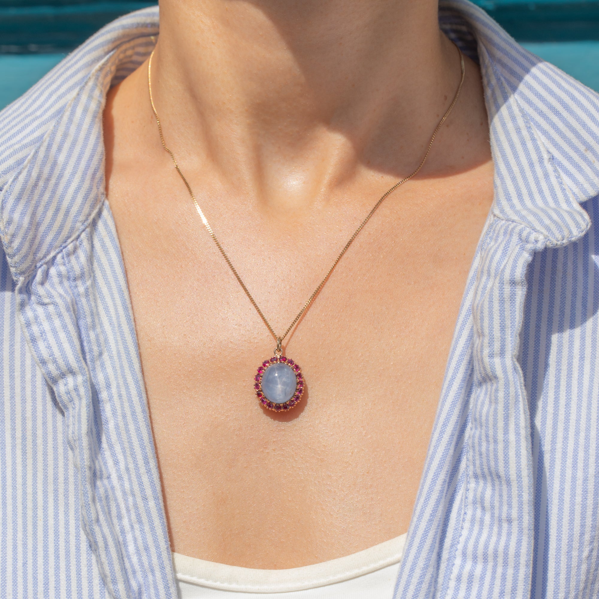 This antique 14ct Gold natural Star Sapphire Ruby cluster pendant is a sight to behold! This graceful Edwardian pendant features a luminous natural Star Sapphire, her silken asterism gently shimmering across the surface like moonlight reflected in water. Encircling the central gem is a vivid halo of Rubies, their deep pink-red tones offering a beautiful contrast and enhancing the Sapphire’s mysterious, ethereal glow.
