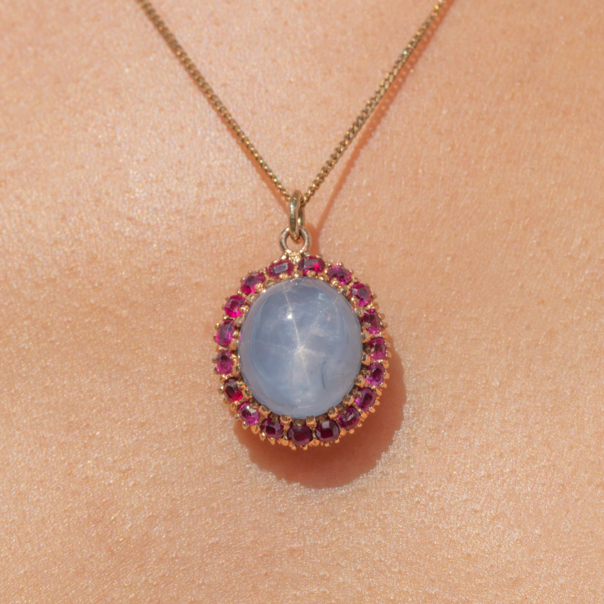 VERY GOOD-EXCELLENT: This antique 14ct Gold Natural Star Sapphire Ruby cluster pendant is in wonderful condition, with all stones securely set and the original craftsmanship beautifully preserved. The central Natural Star Sapphire is smoothly domed, with only a few mild surface marks, largely concealed by the Sapphire's soft, shimmering asterism but visible under close inspection. The surrounding Rubies are all present with a radiant hue, they exhibit some minor abrasions, typical for antique pieces of this kind, but this does not detract from the overall appearance or integrity of the setting.