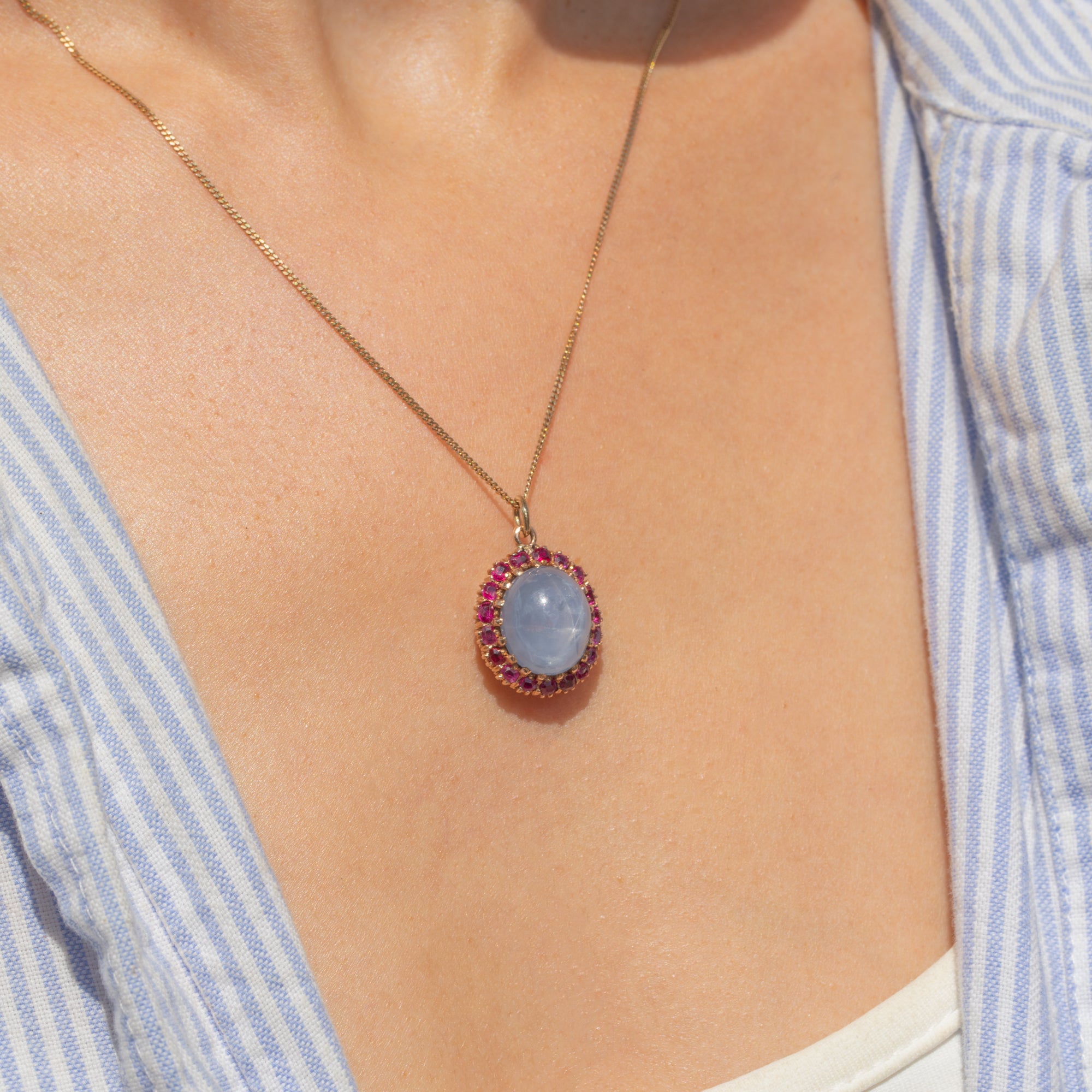 VERY GOOD-EXCELLENT: This antique 14ct Gold Natural Star Sapphire Ruby cluster pendant is in wonderful condition, with all stones securely set and the original craftsmanship beautifully preserved. The central Natural Star Sapphire is smoothly domed, with only a few mild surface marks, largely concealed by the Sapphire's soft, shimmering asterism but visible under close inspection. The surrounding Rubies are all present with a radiant hue, they exhibit some minor abrasions, typical for antique pieces of this kind, but this does not detract from the overall appearance or integrity of the setting.
