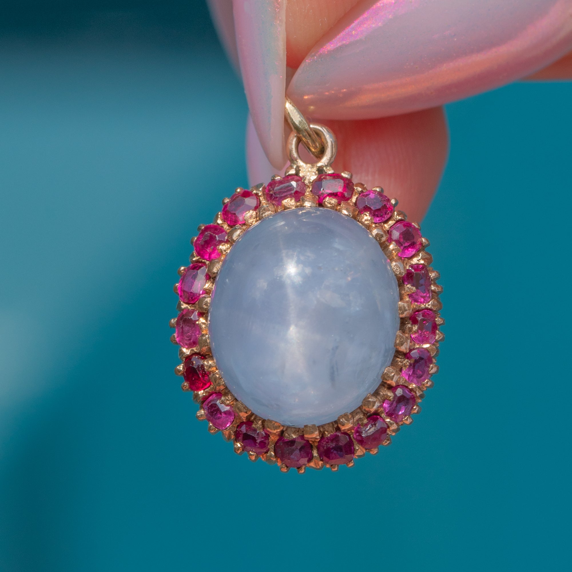 VERY GOOD-EXCELLENT: This antique 14ct Gold Natural Star Sapphire Ruby cluster pendant is in wonderful condition, with all stones securely set and the original craftsmanship beautifully preserved. The central Natural Star Sapphire is smoothly domed, with only a few mild surface marks, largely concealed by the Sapphire's soft, shimmering asterism but visible under close inspection. The surrounding Rubies are all present with a radiant hue, they exhibit some minor abrasions, typical for antique pieces of this kind, but this does not detract from the overall appearance or integrity of the setting.