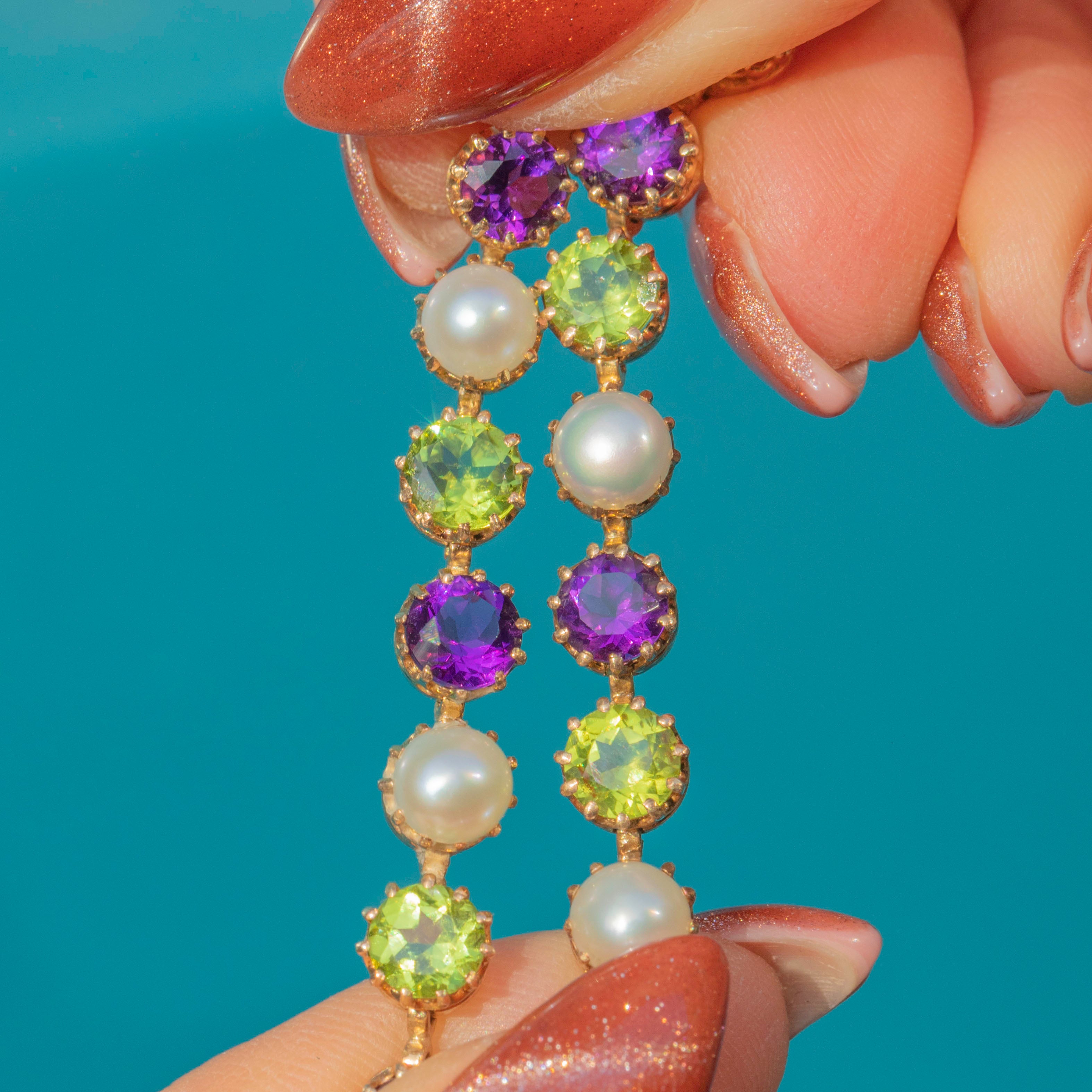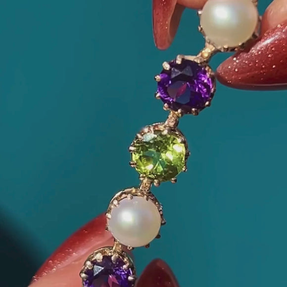 MATERIALS: Tests as 15ct Gold, Amethyst (1.85ct), Peridot (2.30ct), Pearls.