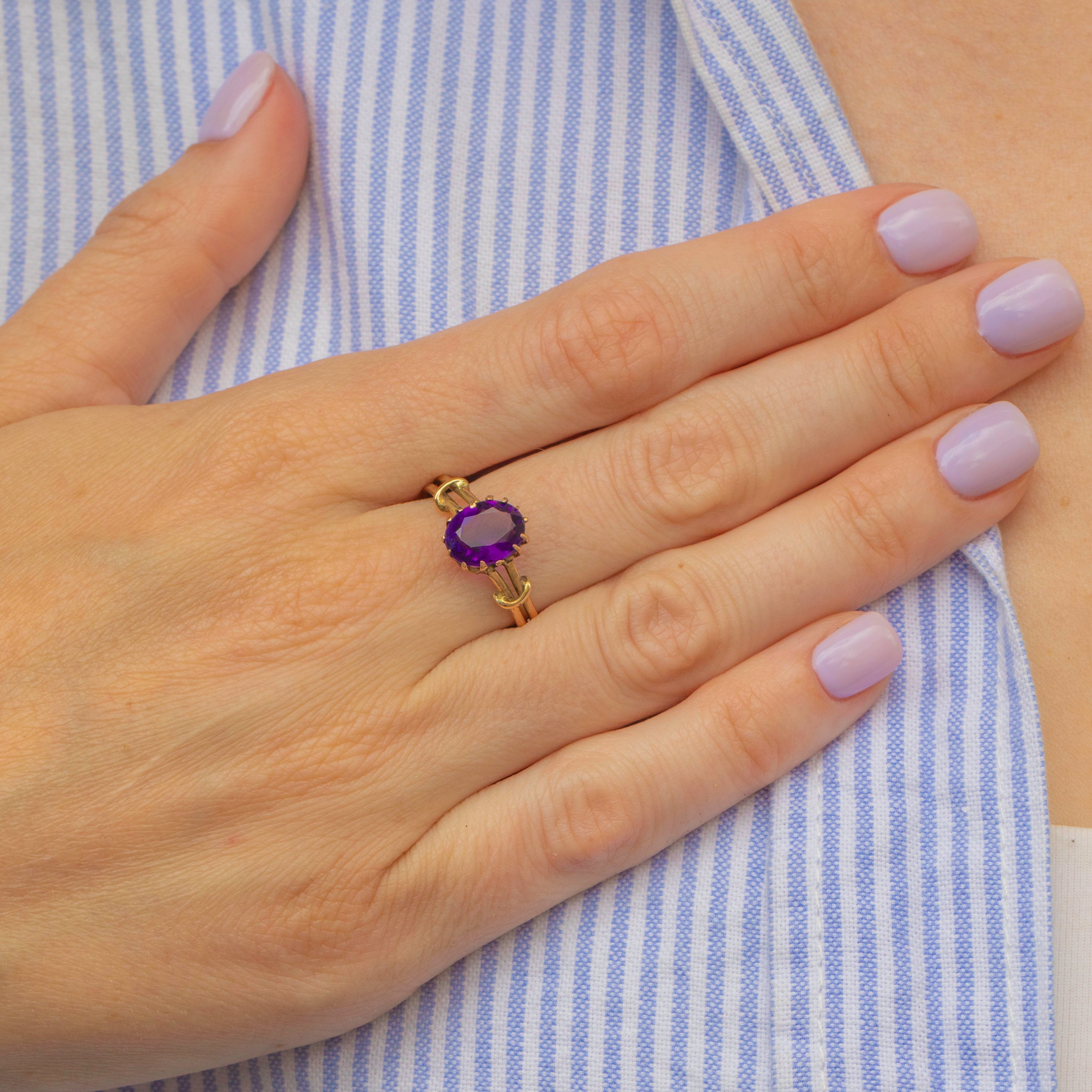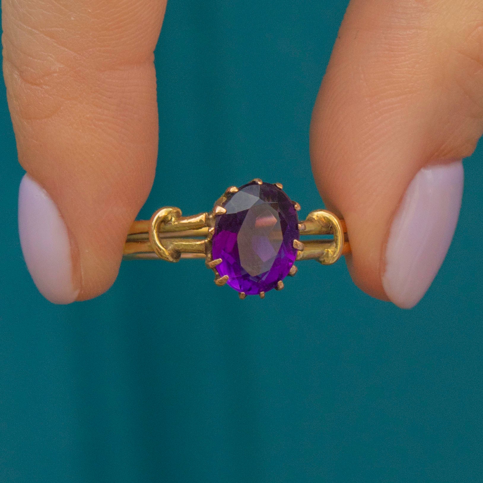 Add an instant pop of colour to your ring stack with this antique 15ct Gold Amethyst solitaire ring! Deep plum hues with flashes of magent dance between the fabulously faceted form of her 1.25ct Amethyst, flanked between buckle-like details on either shoulder.