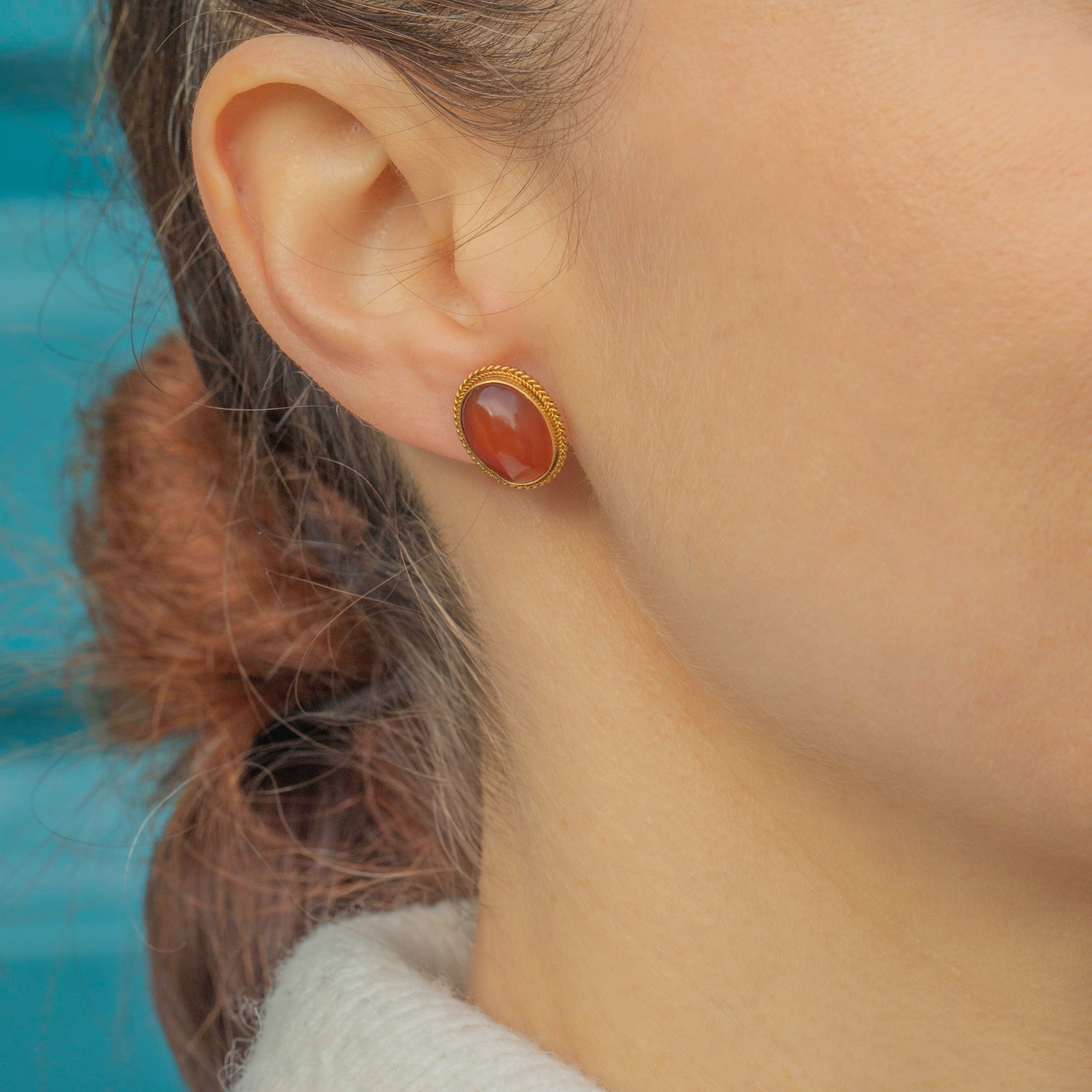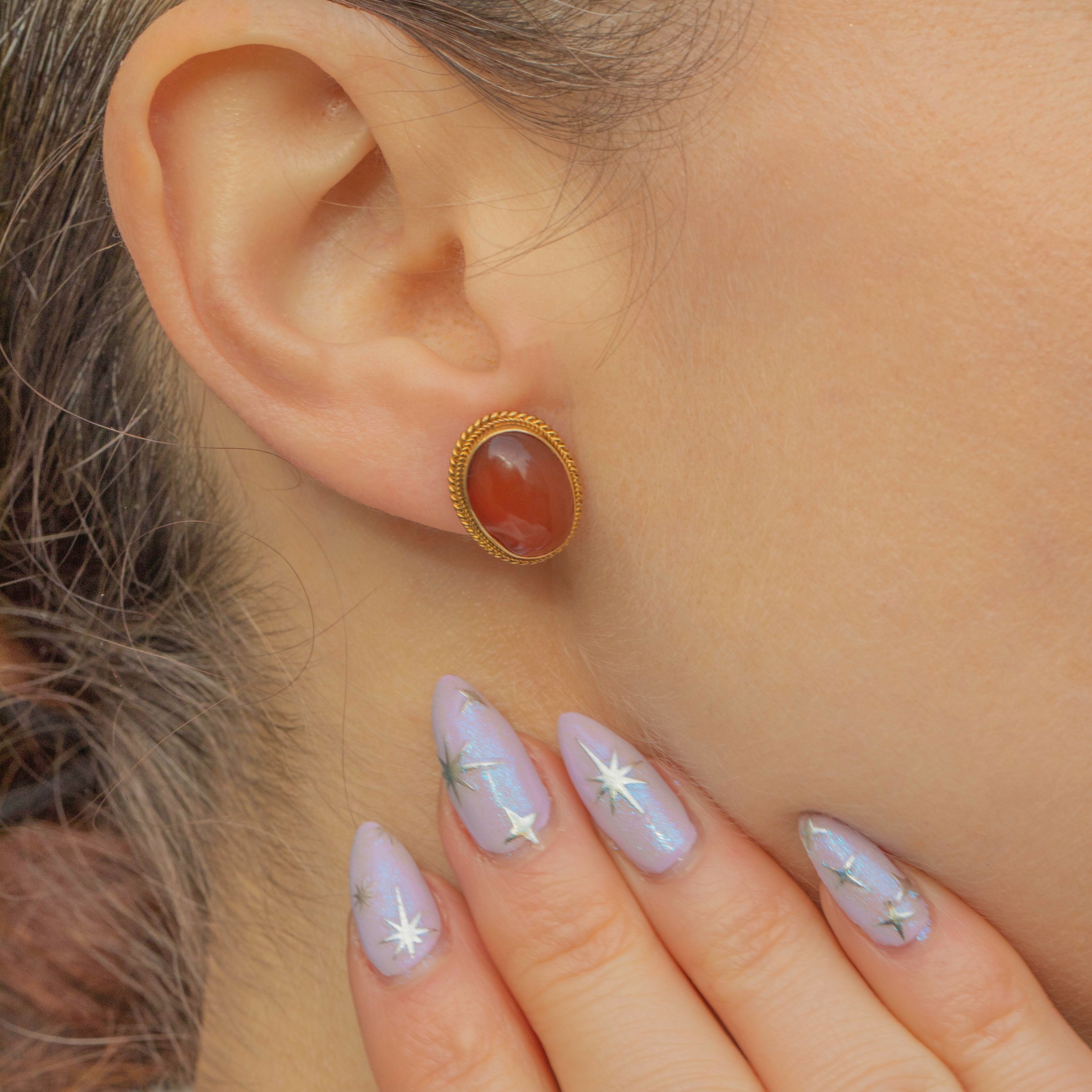 Each inlaid with a glossy Carnelian cabochon, these earrings are a versatile pair you can wear every day.