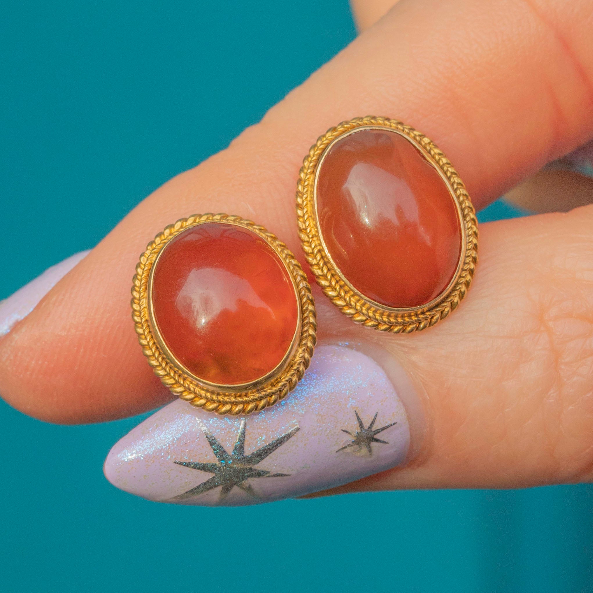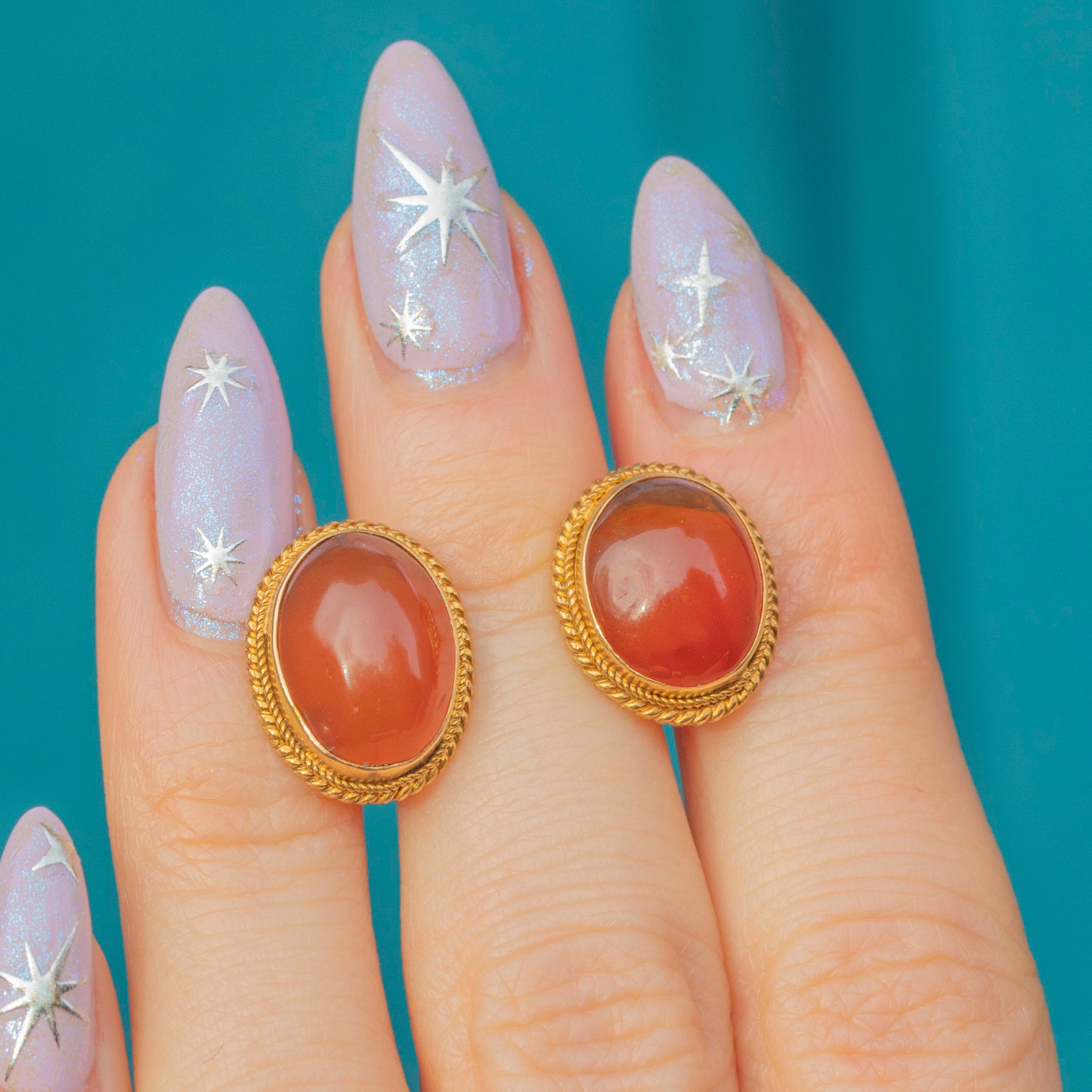Carnelian cabochons are each 12.5mm long x 9.5mm wide, weighing approx. 7.00ct combined.