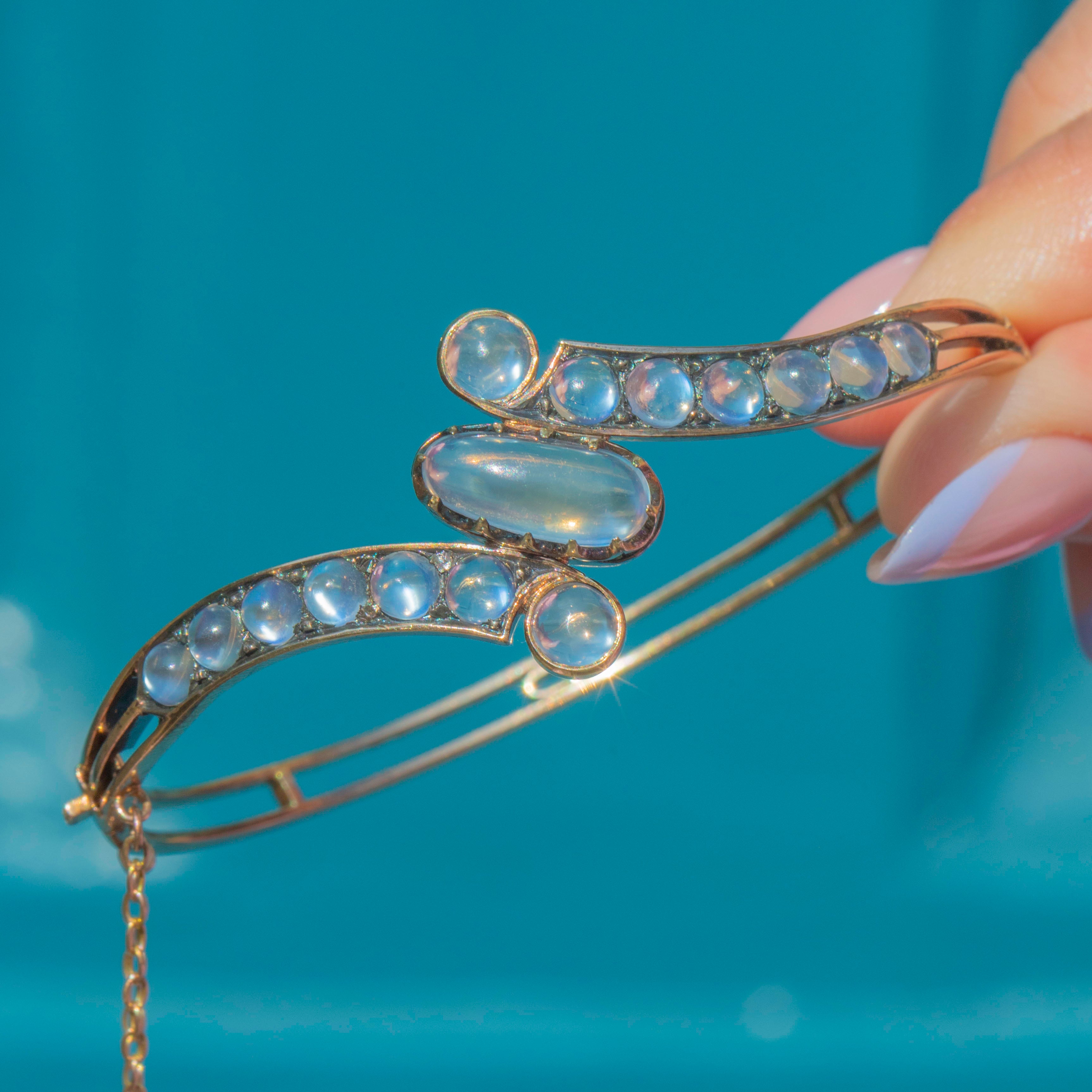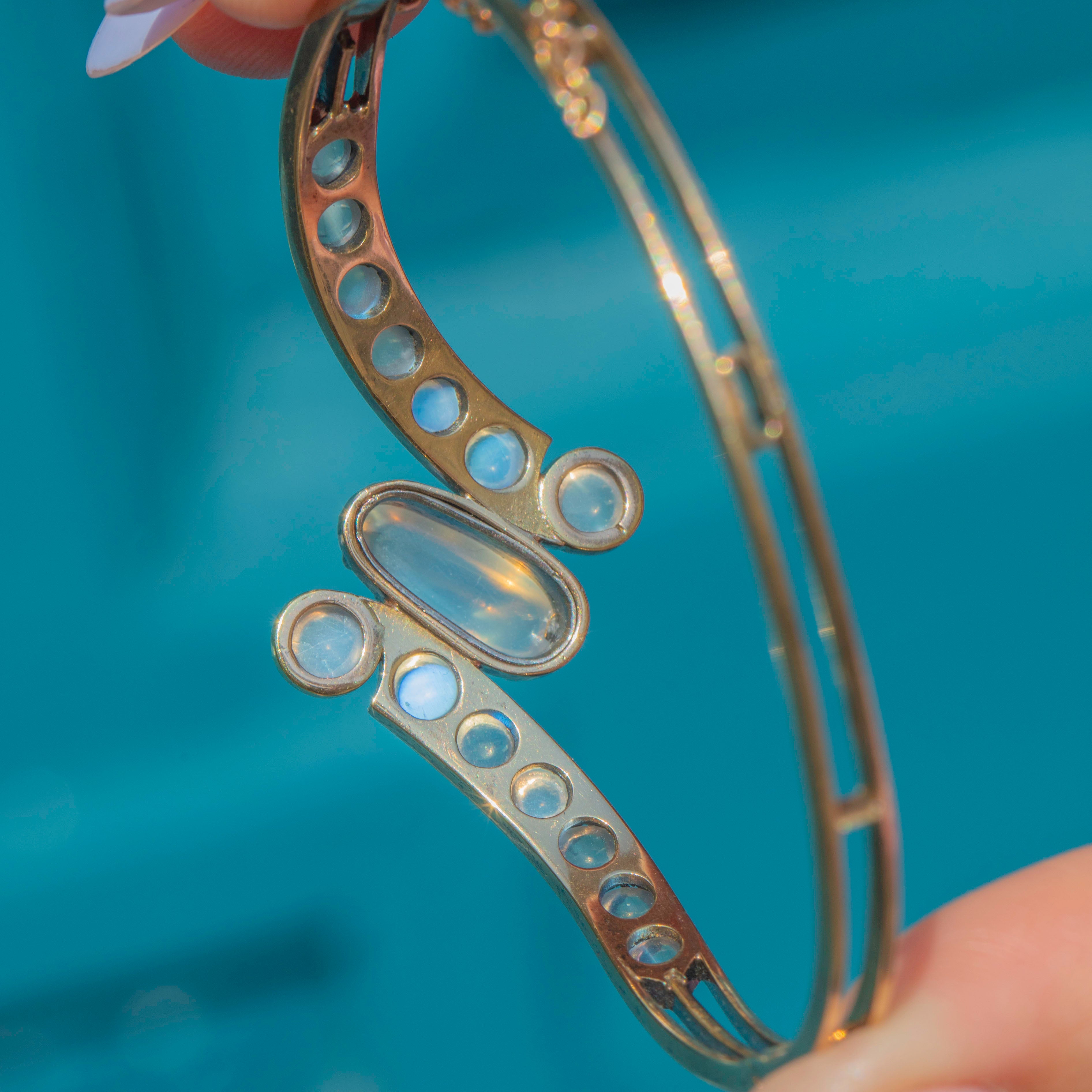 This breathtaking Antique 15ct Gold Ceylon Moonstone Bypass Bangle is crafted in 15ct Gold and adorned with fifteen graduating Ceylon moonstones, each one glowing with the soft, ethereal shimmer that makes these piece so sought after