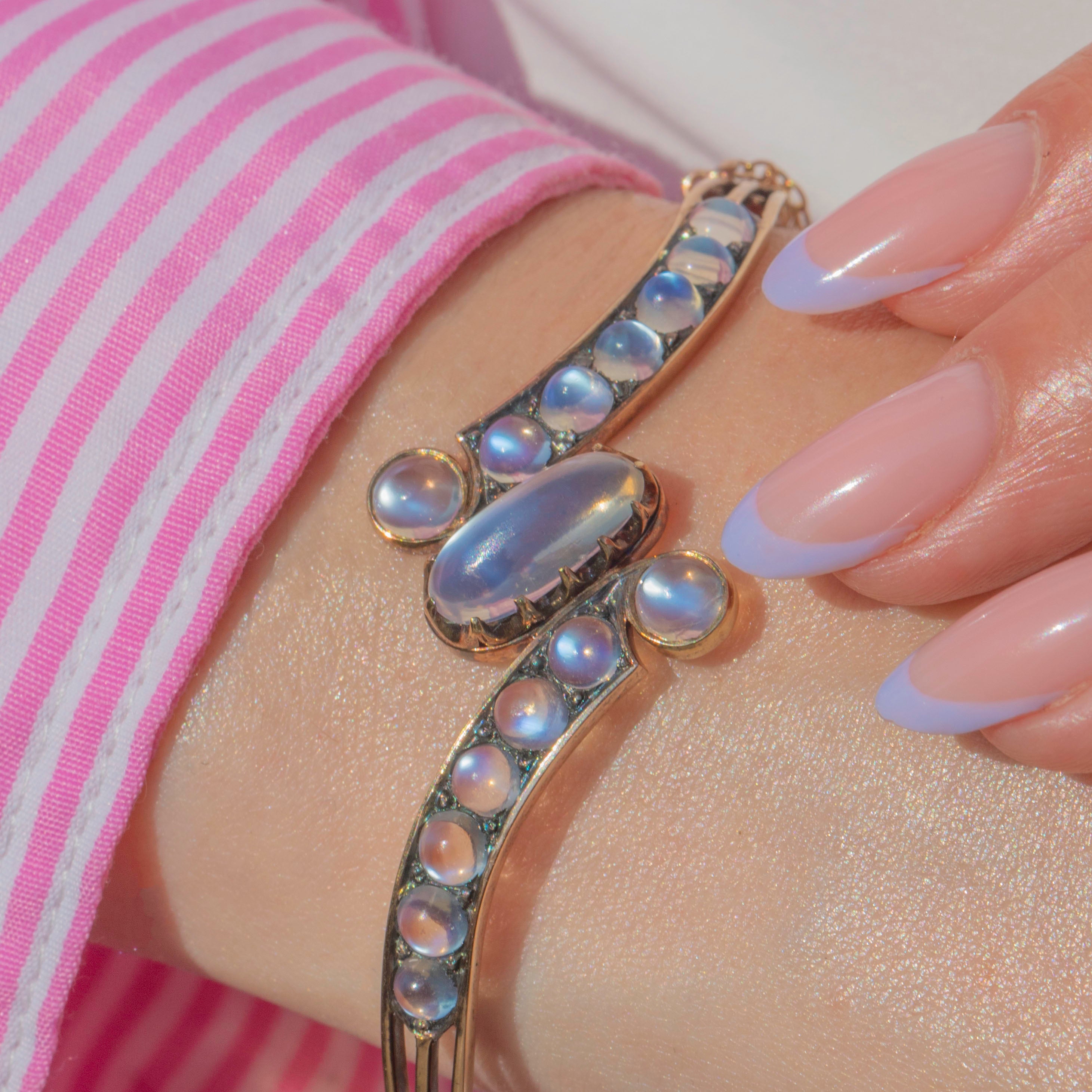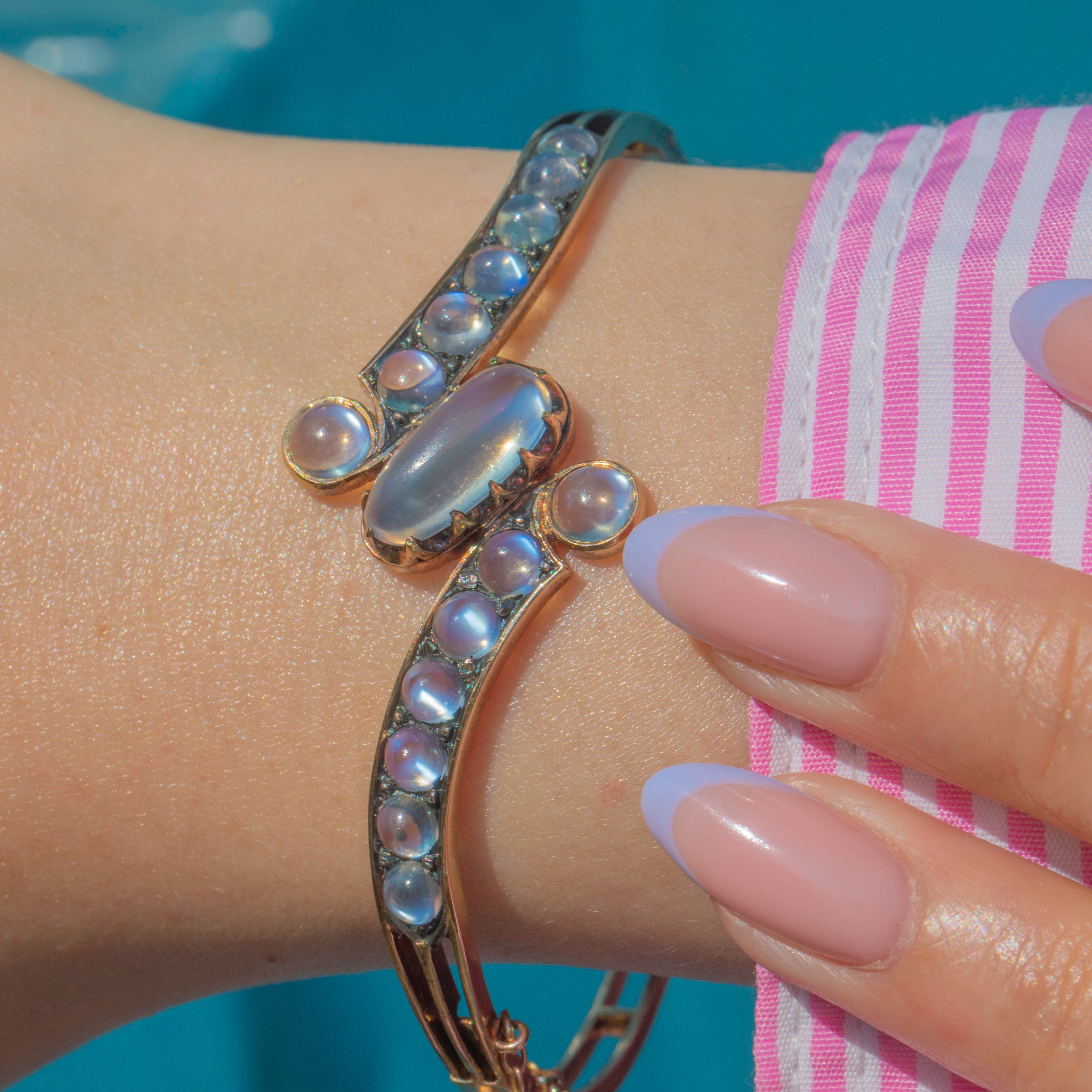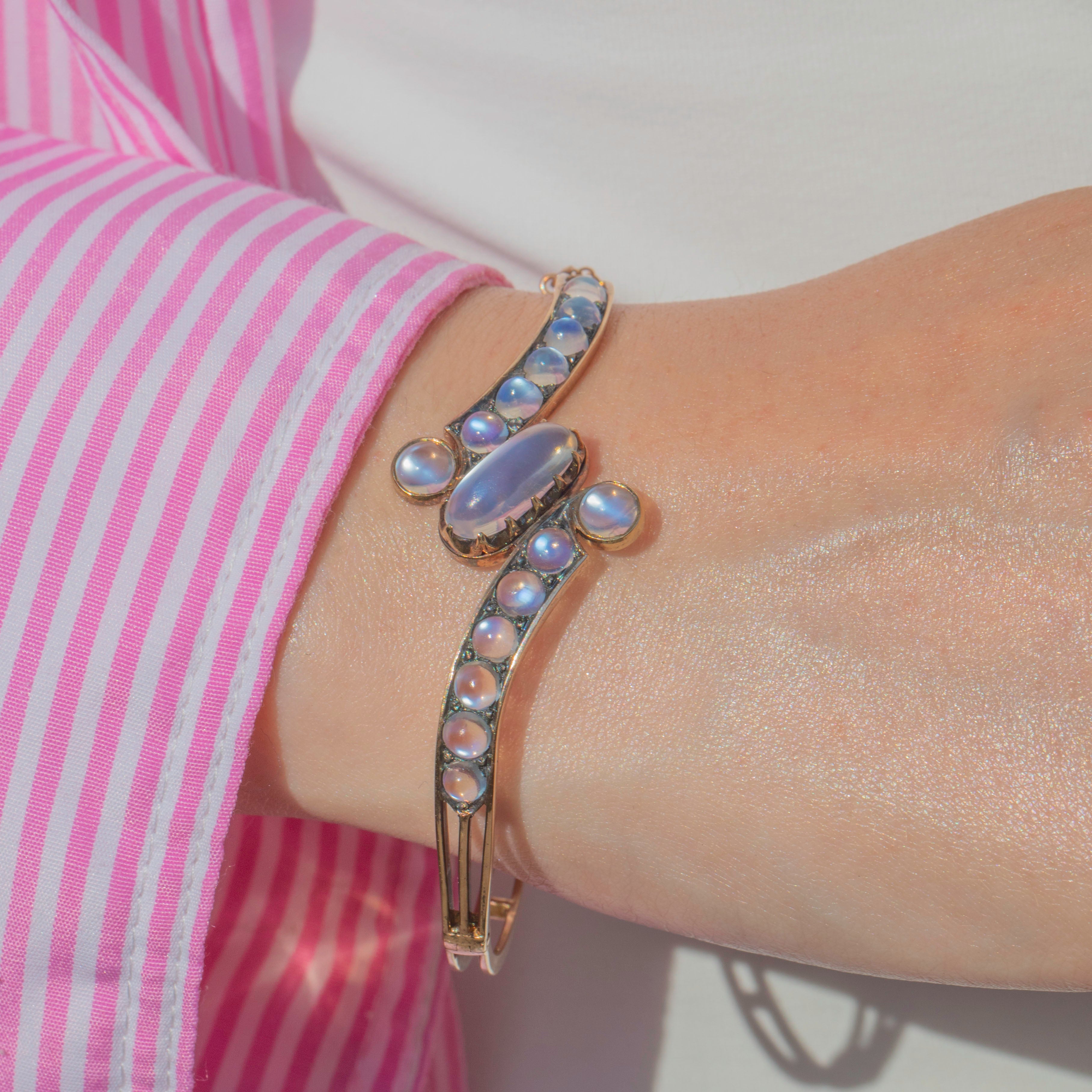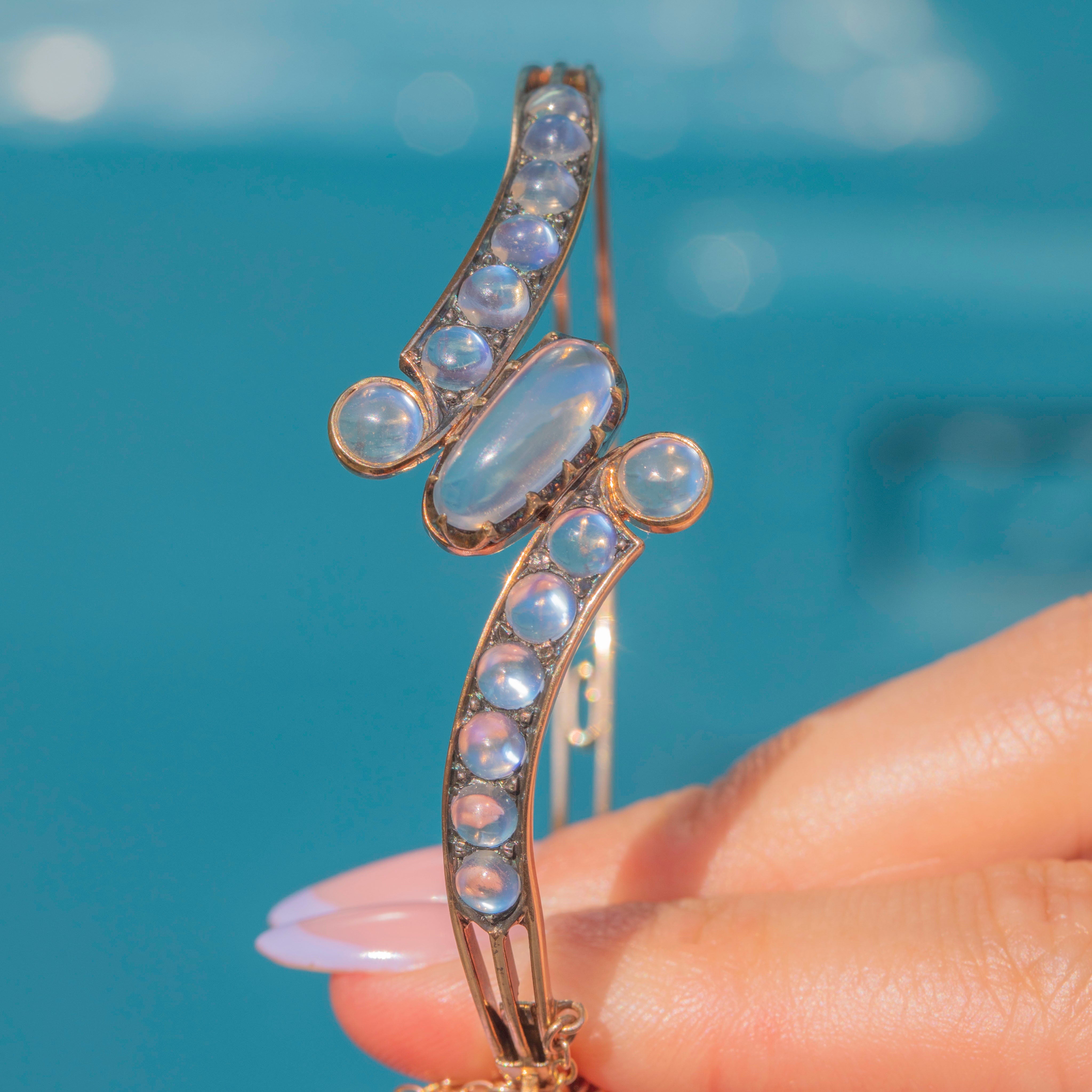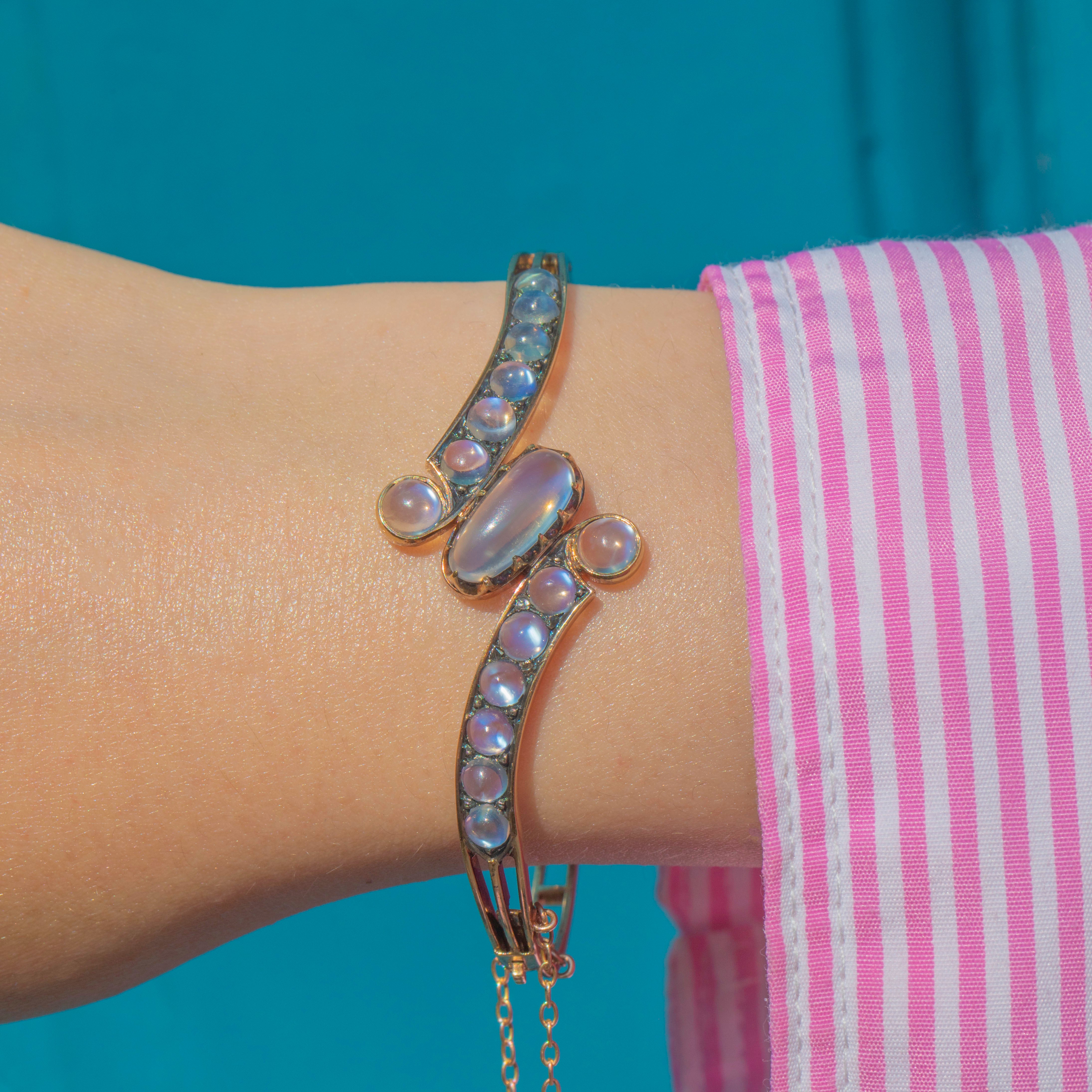 Designed in an elegant bypass style, the bangle wraps gracefully around the wrist, showcasing the Moonstones in a flowing, romantic twist. A rare and luxurious piece from the late 19th century, perfect for collectors of fine antique jewellery.