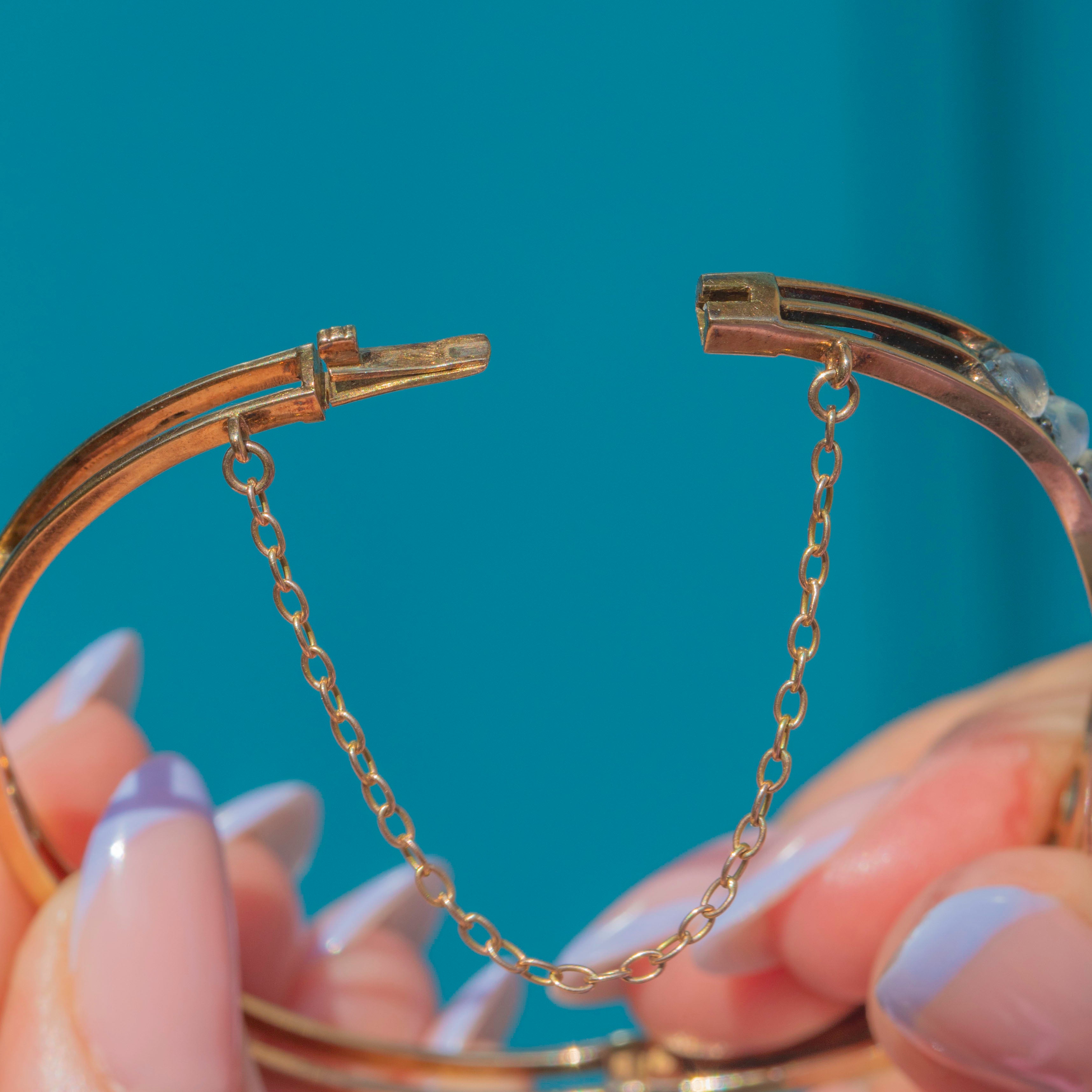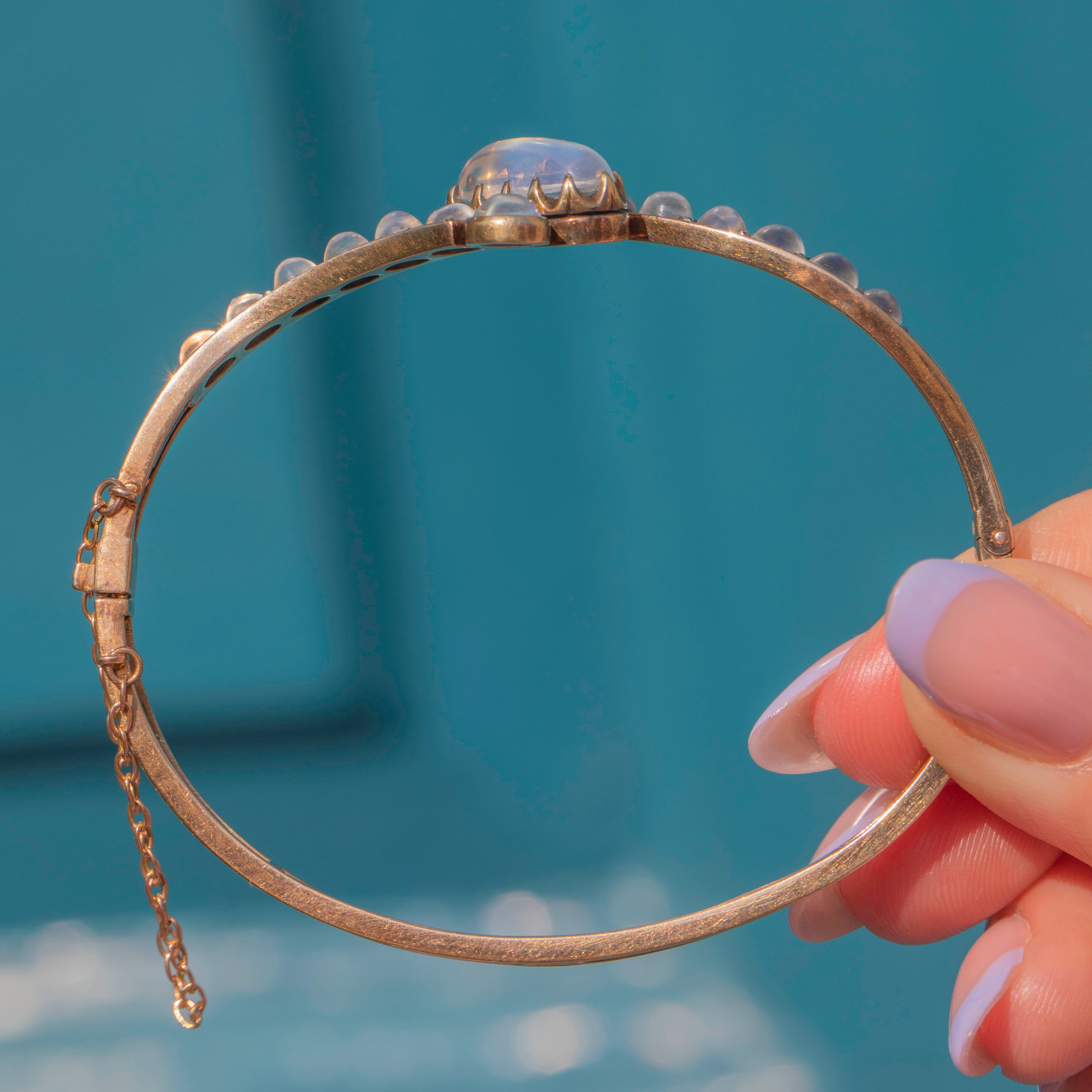 EXCELLENT: This antique Victorian bangle is in excellent overall condition for its age. The stones are beautifully matched and securely set, their mystical blue sheen capturing the light with every movement. The setting remains strong and the bypass design retains its original shape and integrity. There is some mild surface wear to the Gold, commensurate with age and gentle use, but nothing that detracts from the beauty or wearability of the piece.