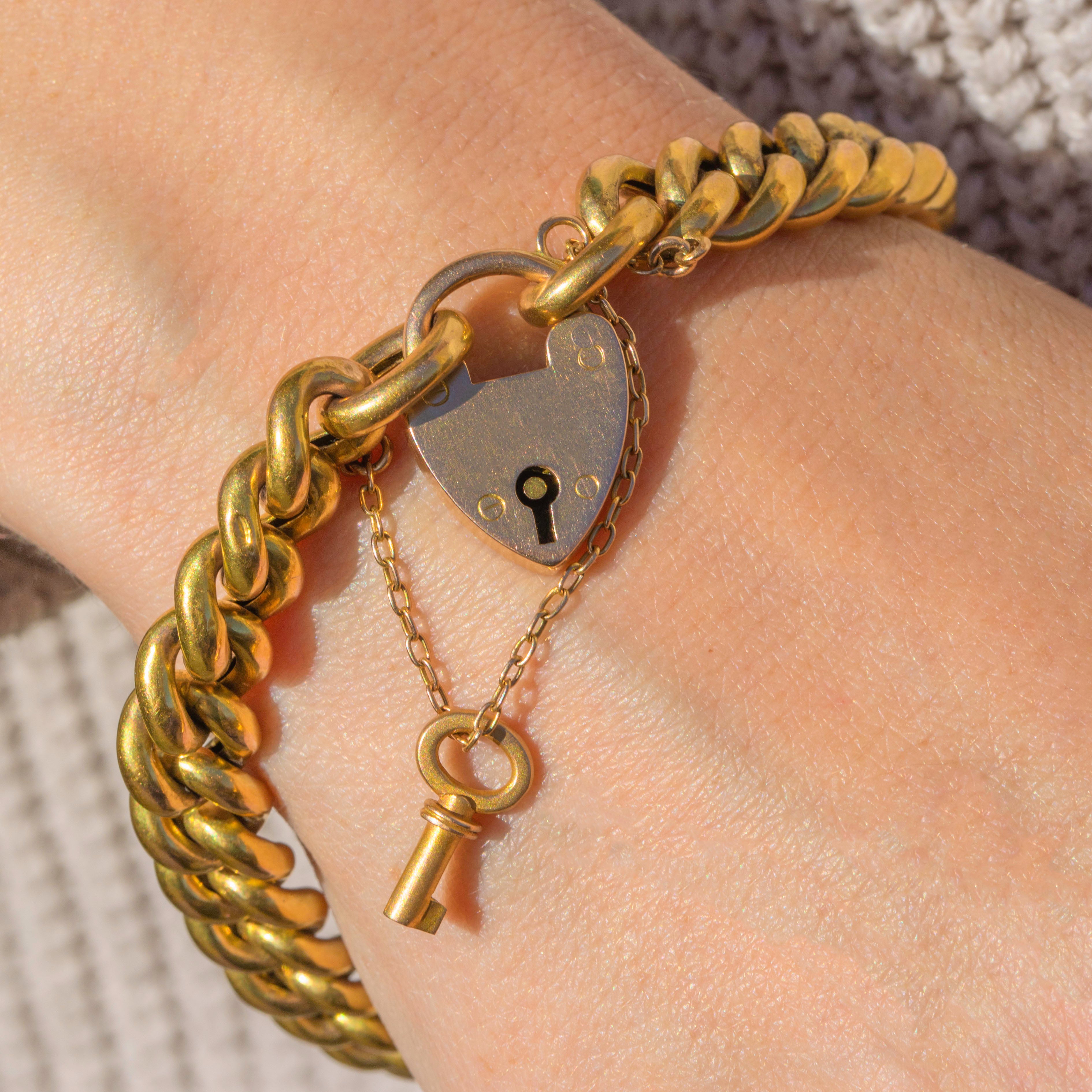 Unlock the key to your heart with this antique 15ct Gold curb bracelet! A rare and exciting find, this Victorian bracelet is complete with a heart padlock and its original key used to lock and unlock the padlock suspended from her safety chain, in perfect working condition!