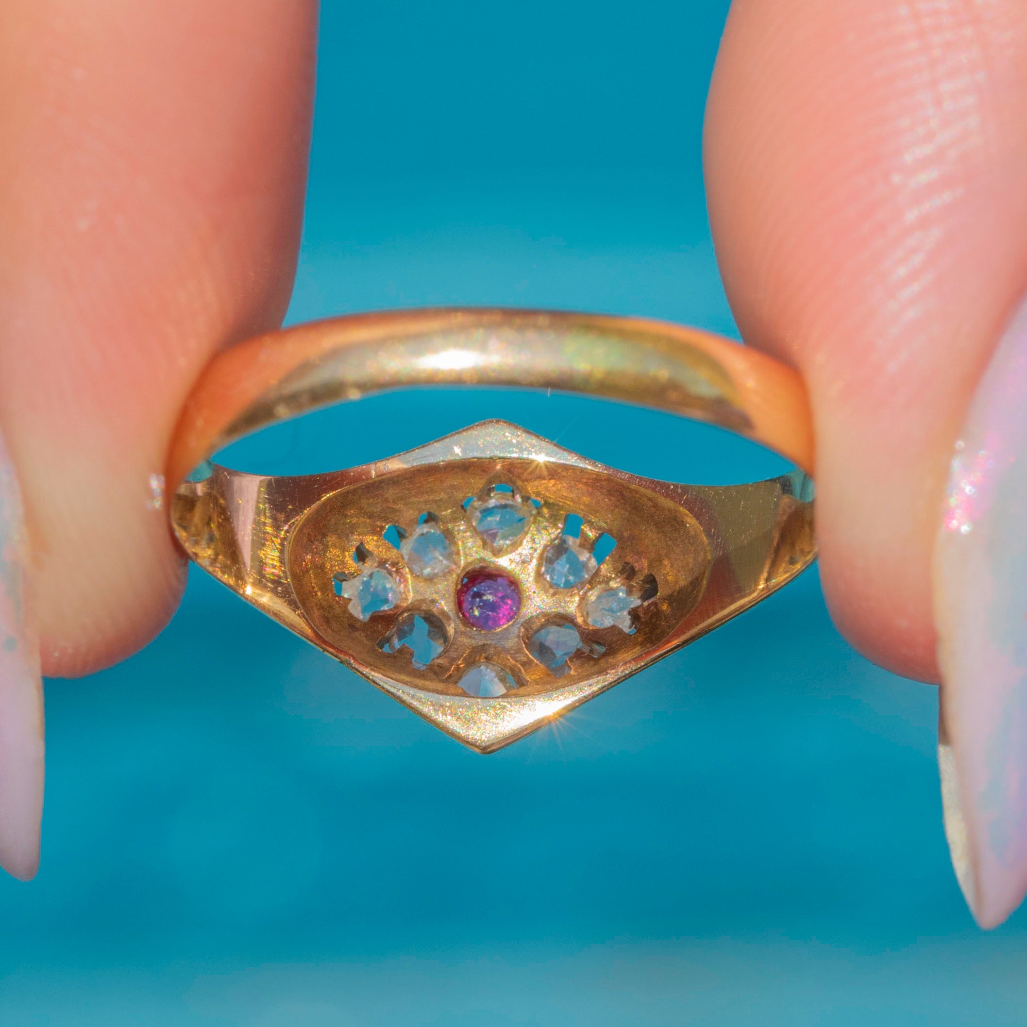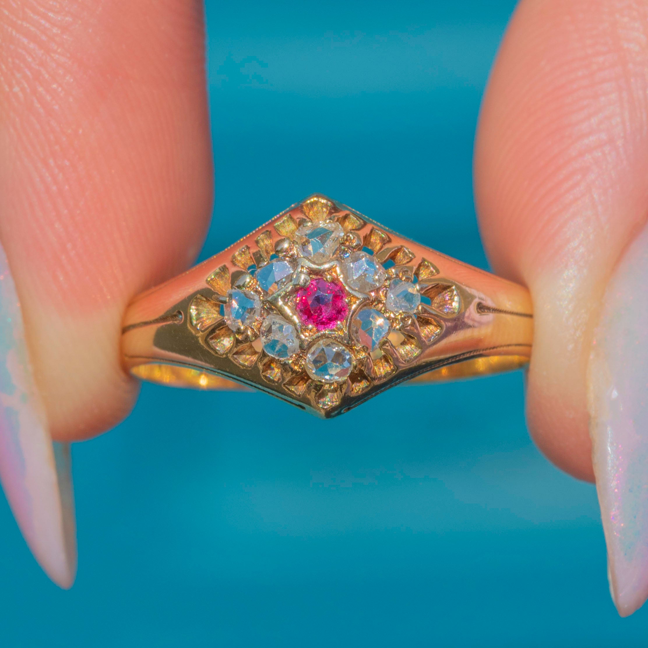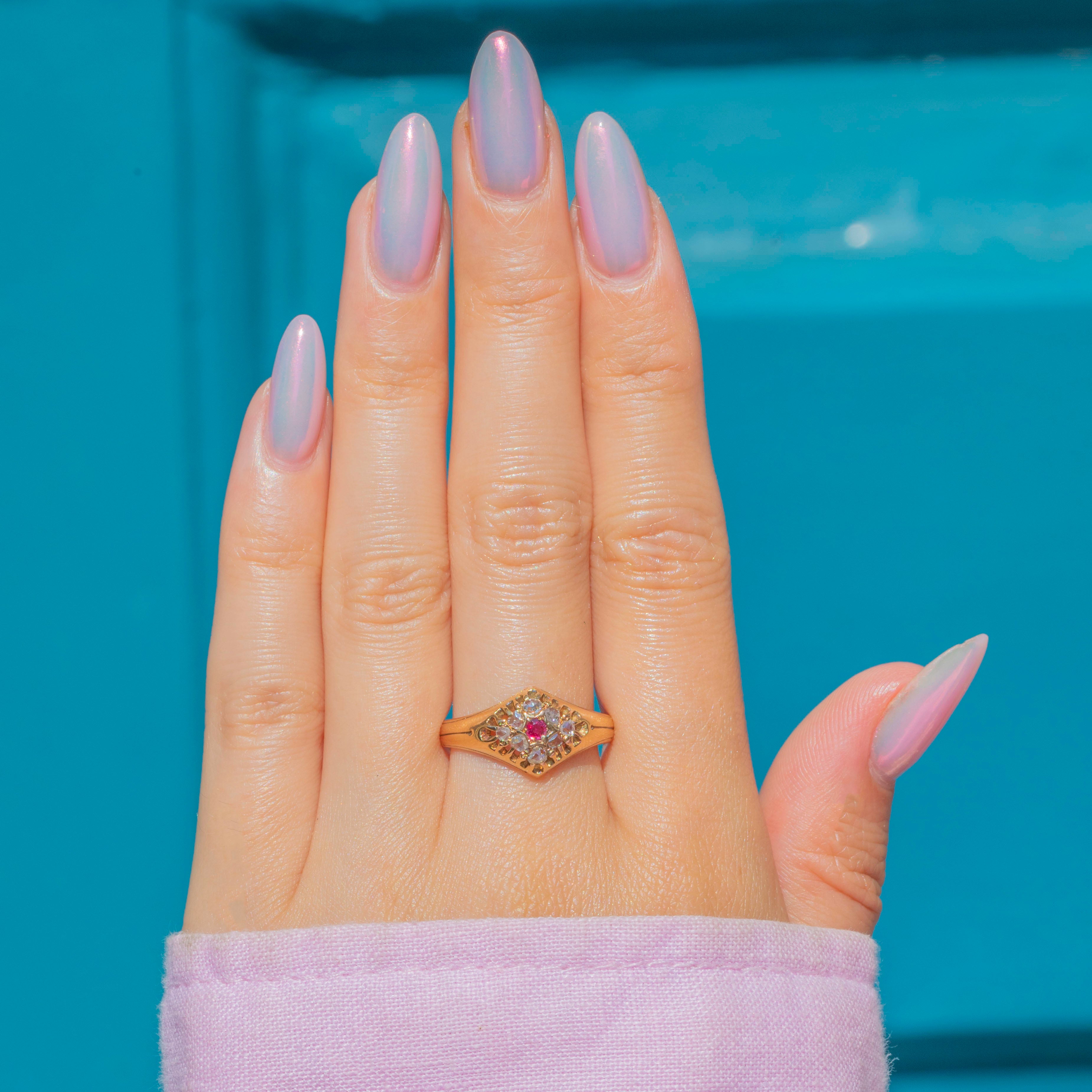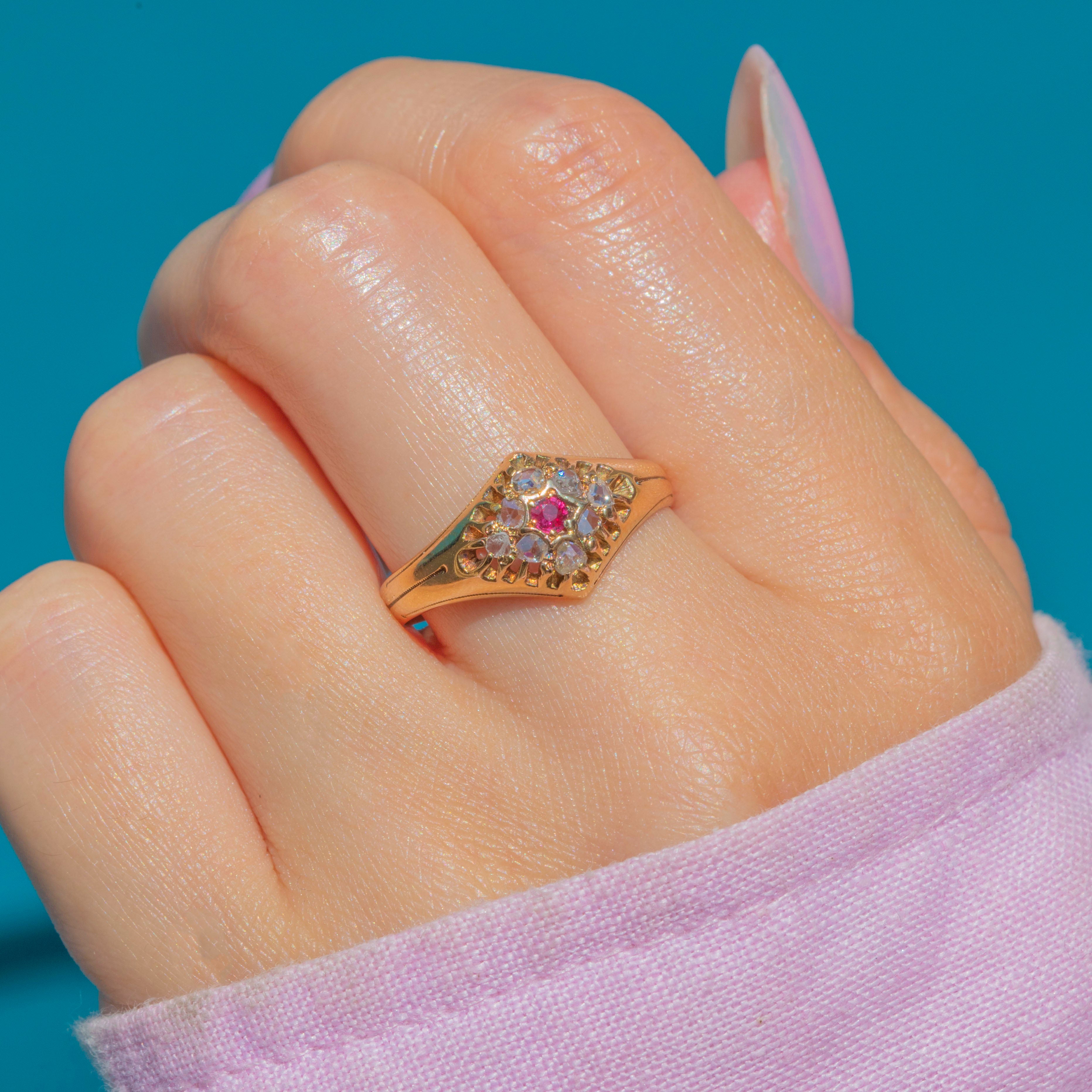 This luxurious antique Diamond Ruby ring impresses from every angle! The buttery 15ct Gold band displays a vibrant, raspberry-pink Ruby at her centre in a distinct star setting, adorned by a halo of Diamonds creating a sea of sparkle.
