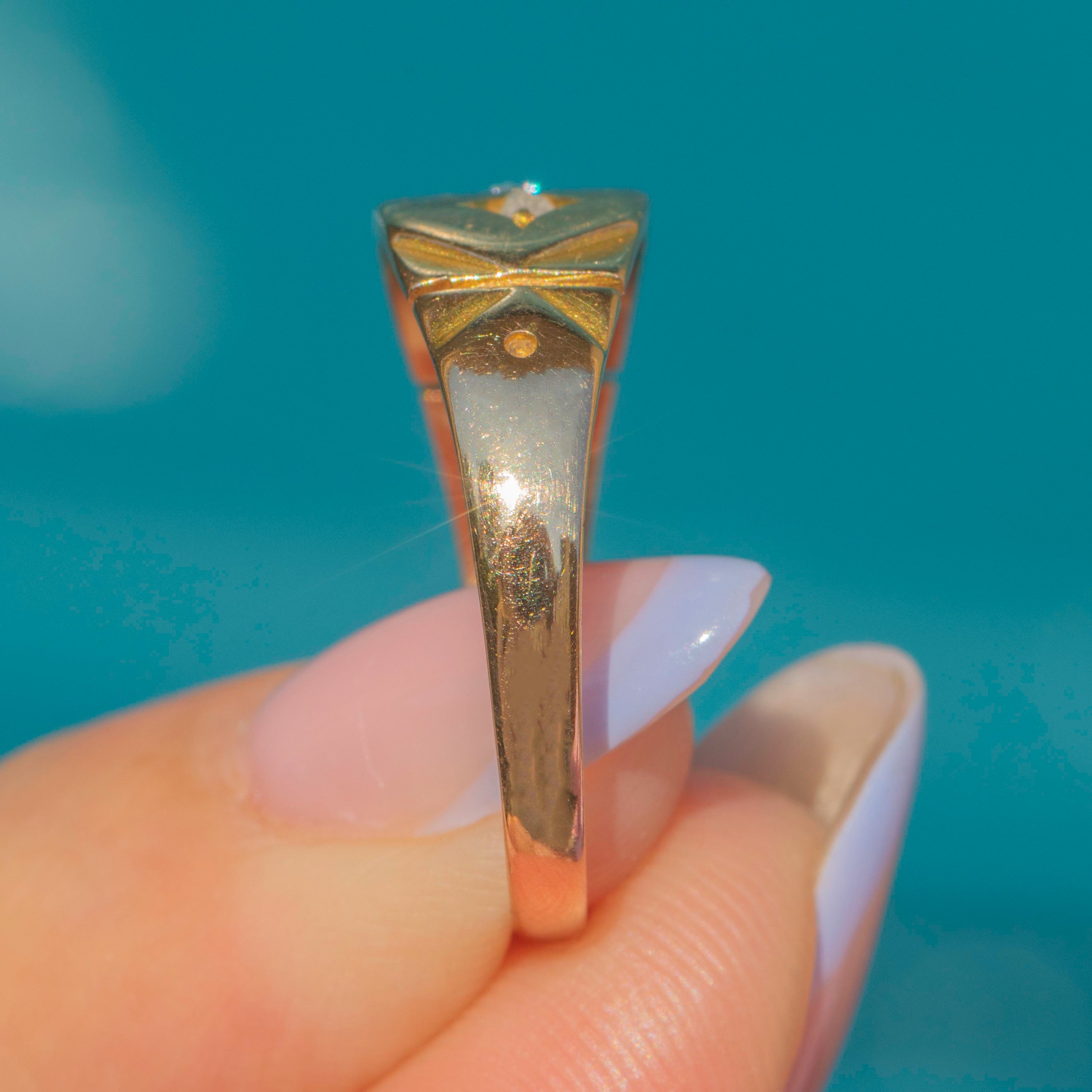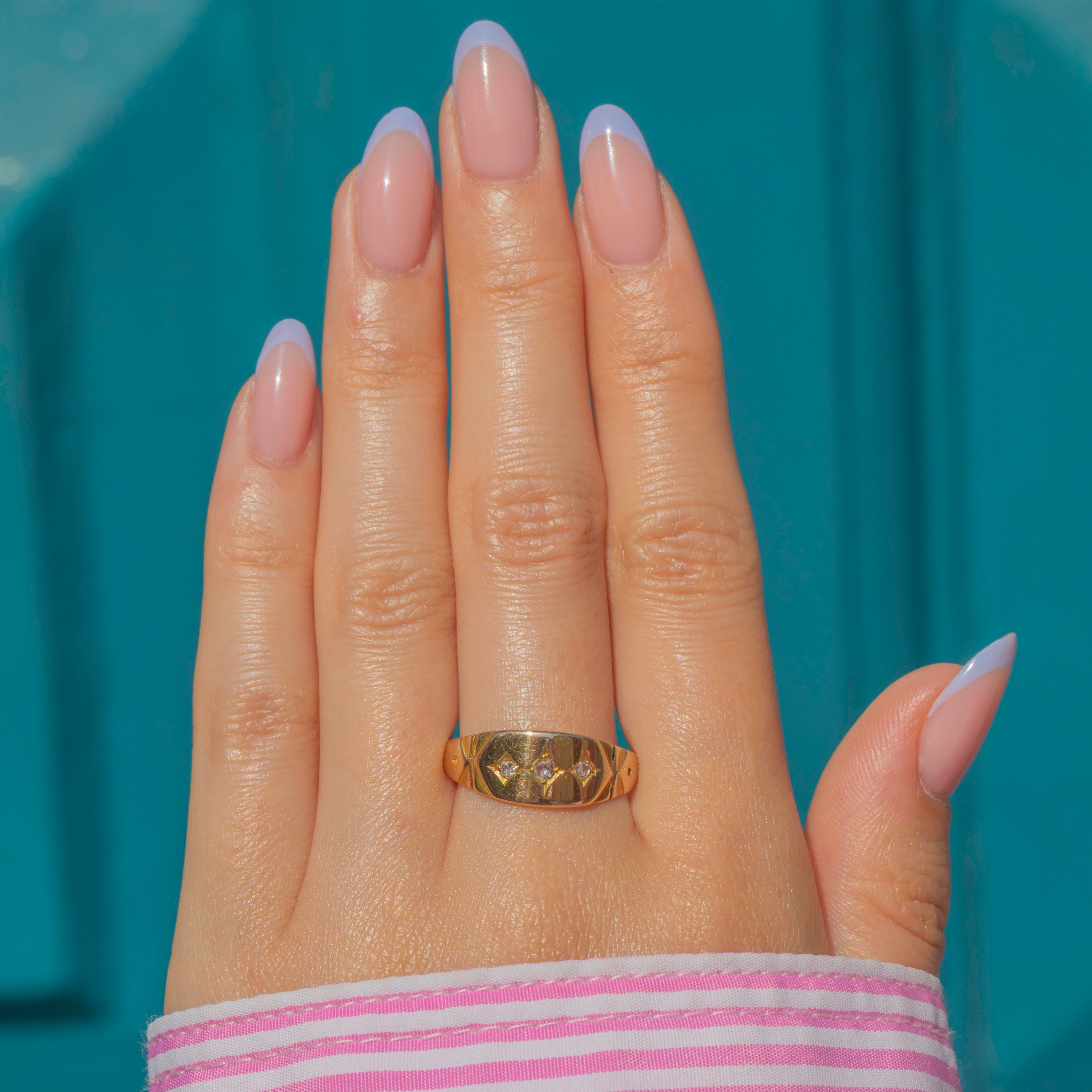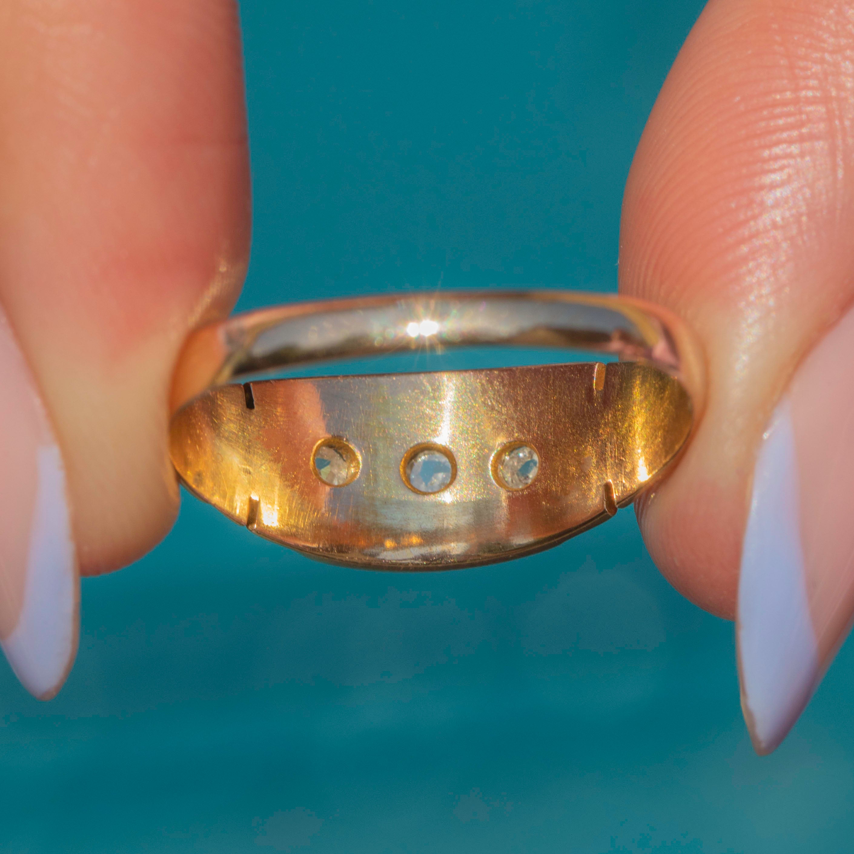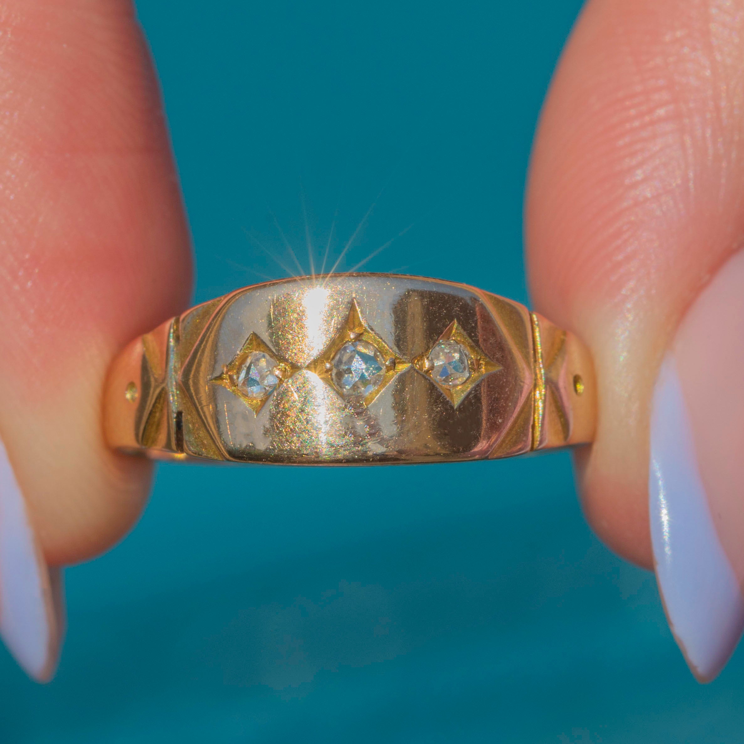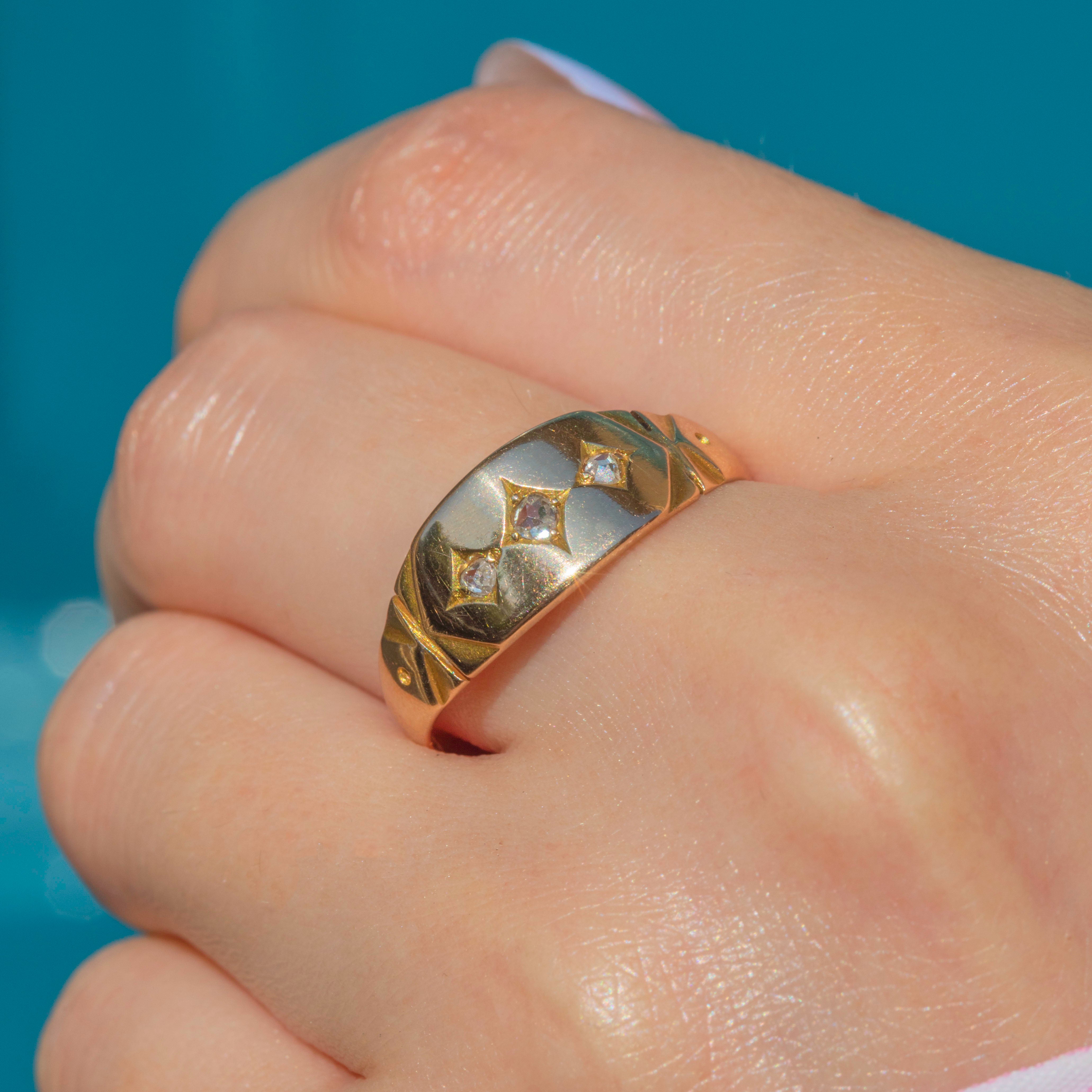 Crafted from buttery 15ct yellow Gold, this Victorian ring features three shimmering Diamonds, each scintillating as they catch the light. Her Diamonds sit within star settings, giving this antique gypsy ring a lovely celestial charm.