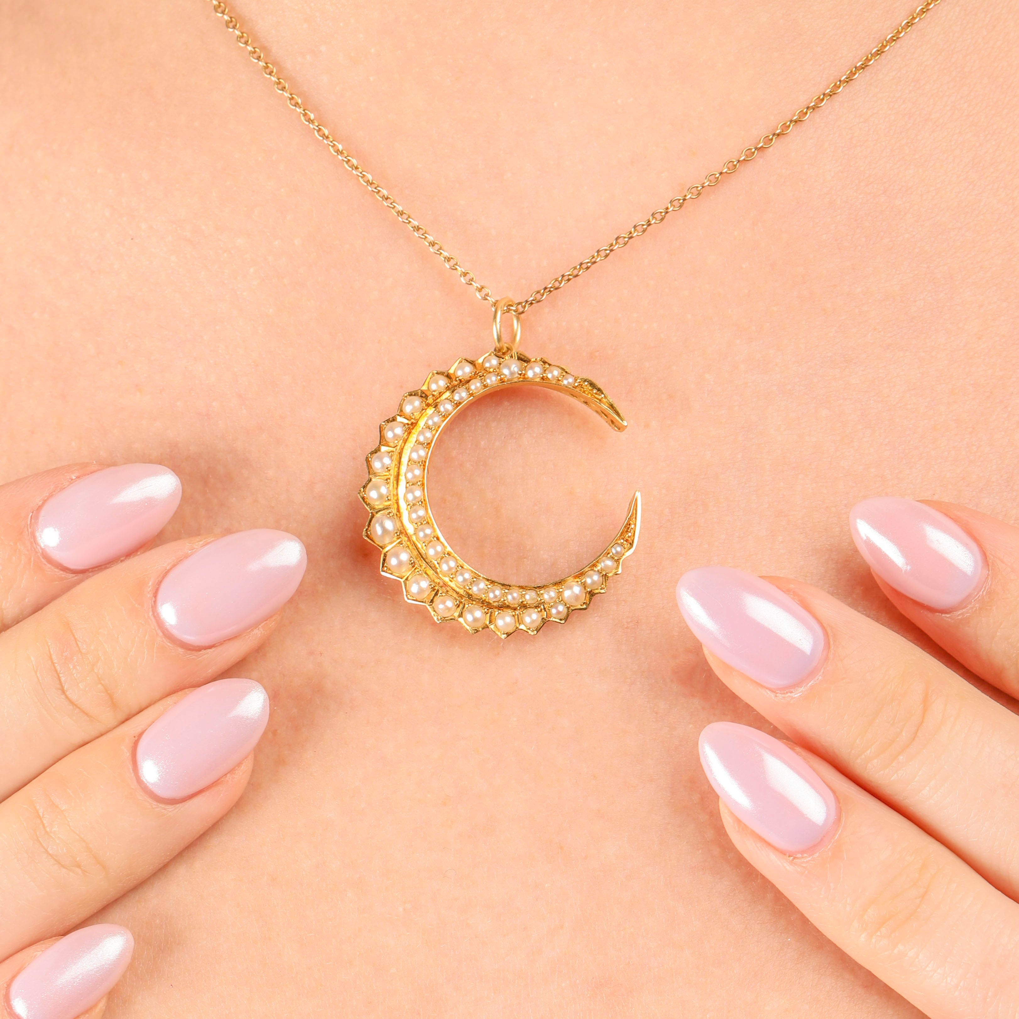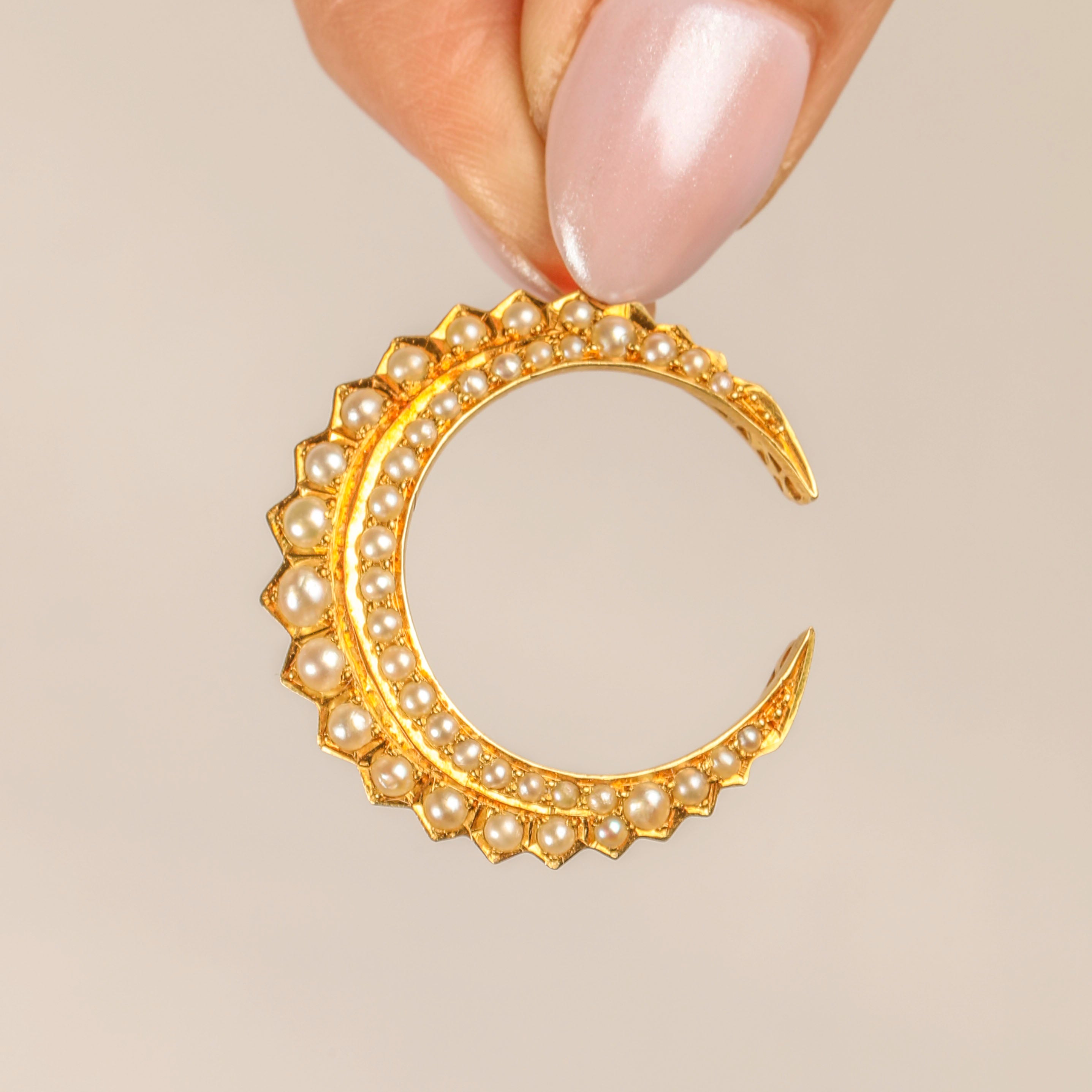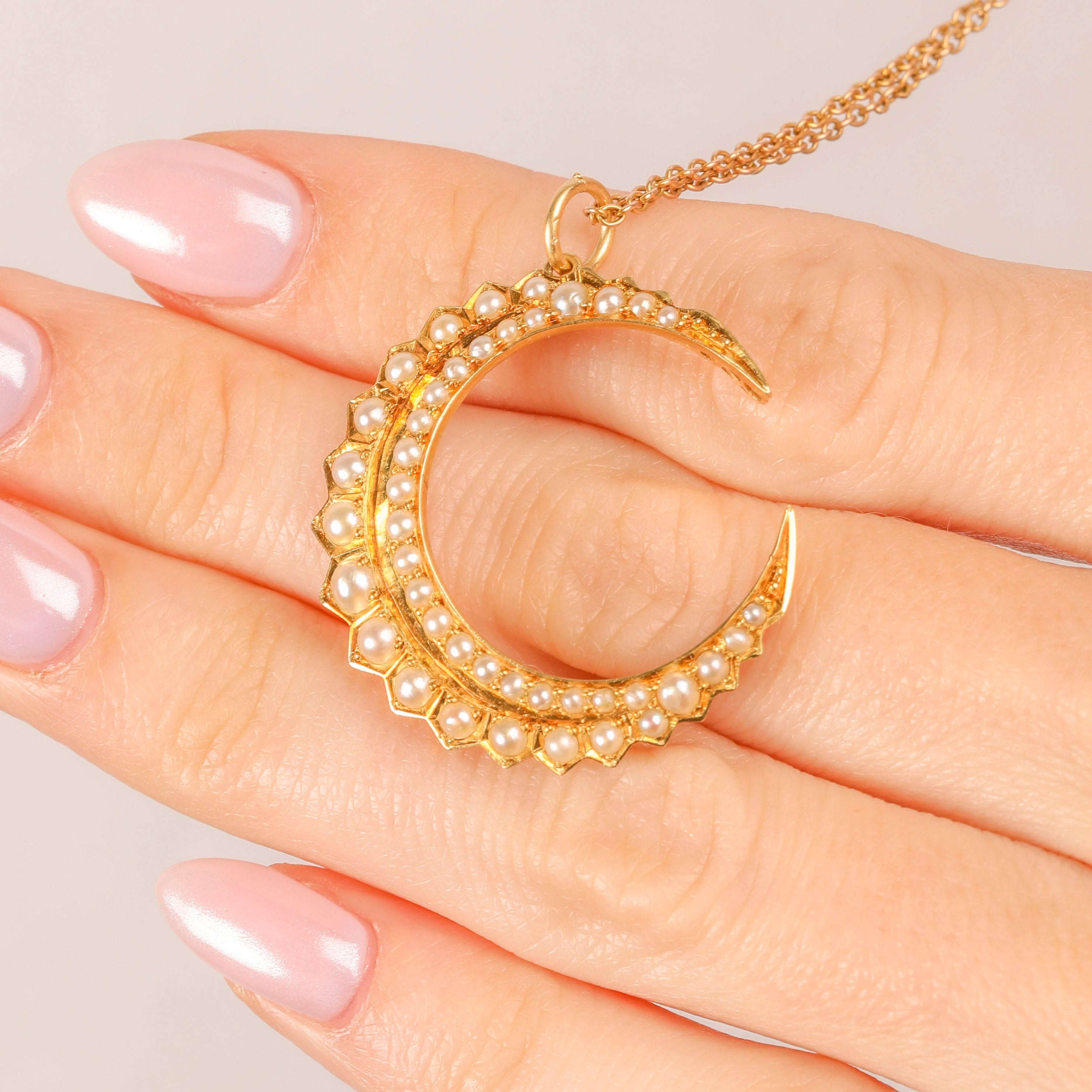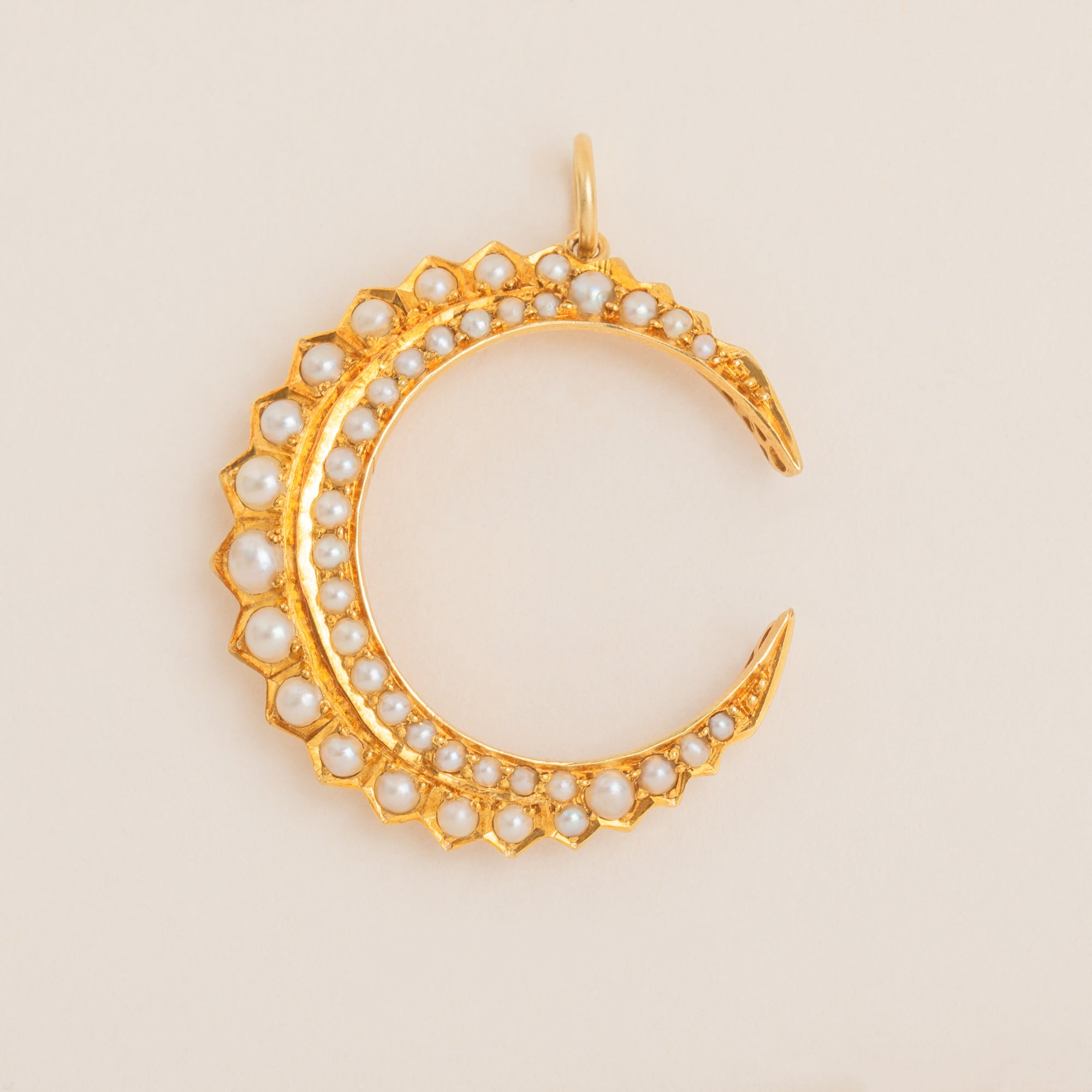 EXCELLENT. This antique 15ct Gold double row Pearl crescent moon pendant is in excellent condition! All Pearls are present, possessing a lovely luminosity and shimmer. They graduate in size, and sit securely within saturated 15ct Gold. She is an authentic Victorian find deserving of a home where she'll be cherished!
