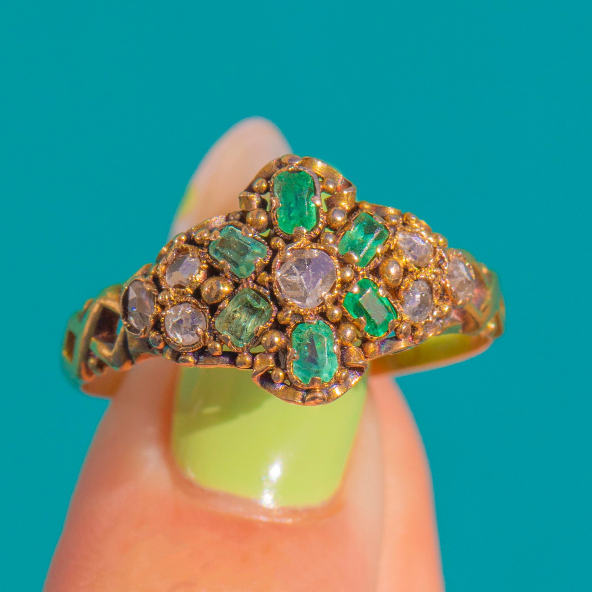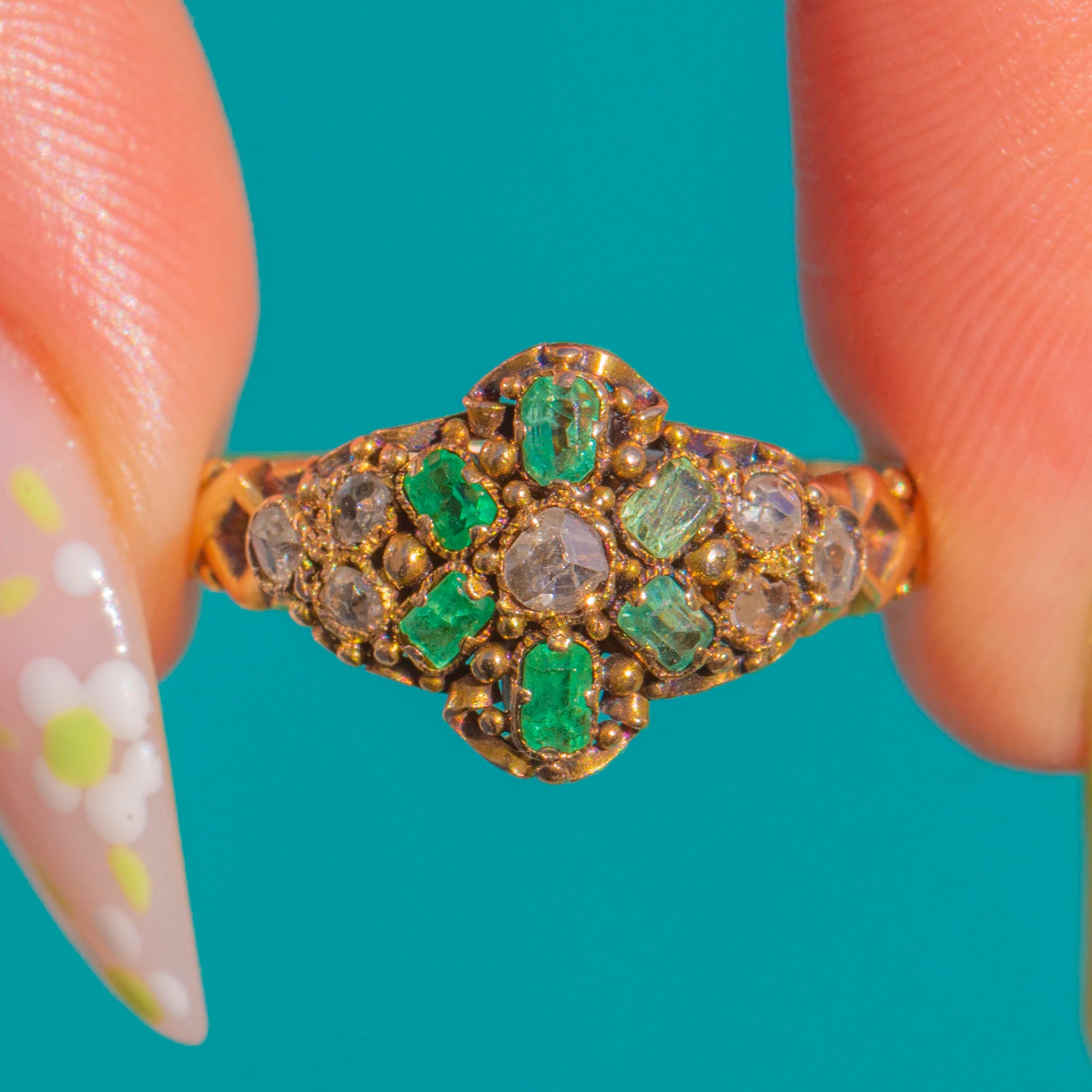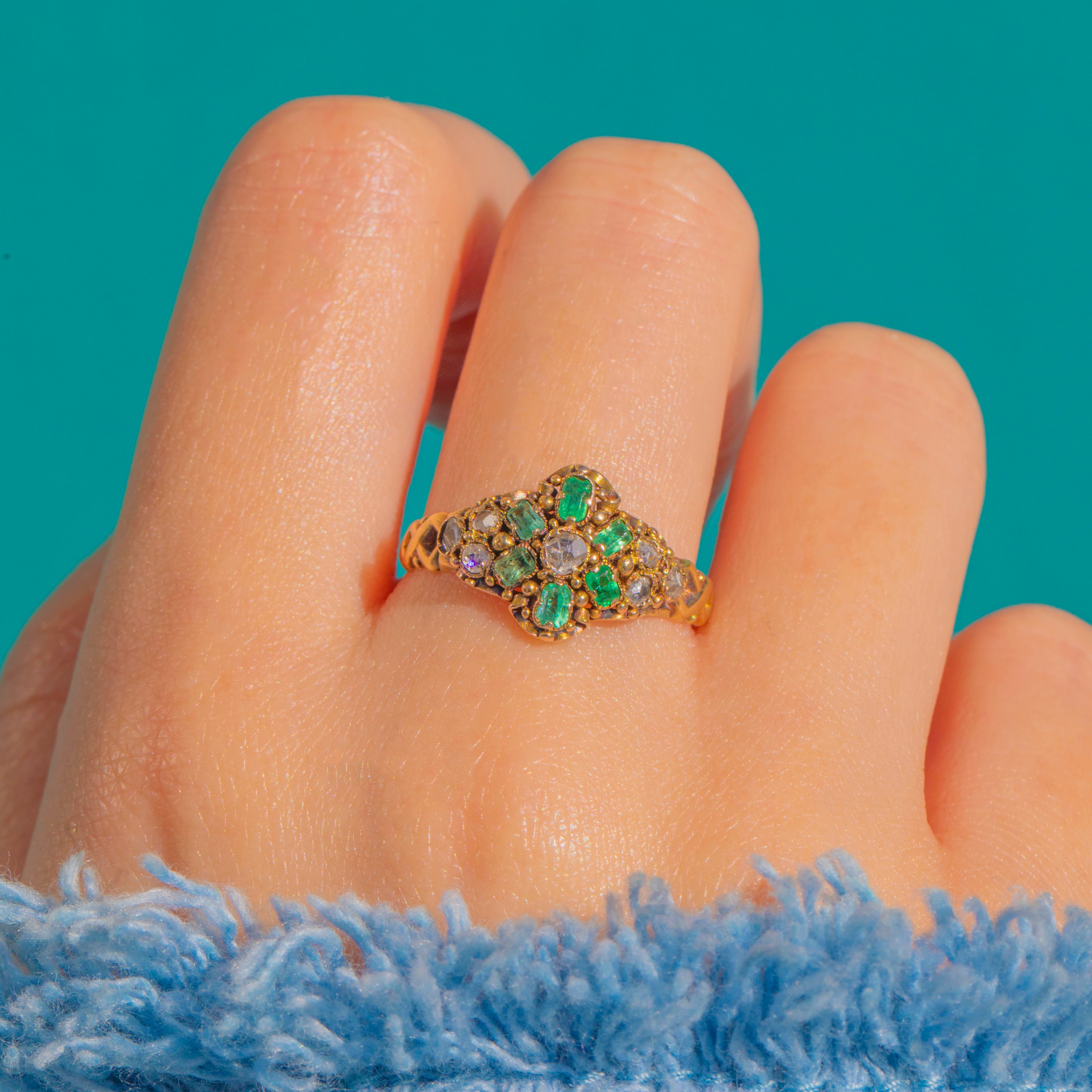 A poetic jewel from the cusp of the Georgian and Victorian eras, this hand-crafted 15ct Gold ring marries vivid natural Emeralds with glittering antique rose-cut Diamonds for an irresistibly romantic glow. The raised, navette-style cluster is richly detailed with granulation and a softly domed profile that catches the light beautifully, just as these charming antique cuts were made to scintillate by candlelight.