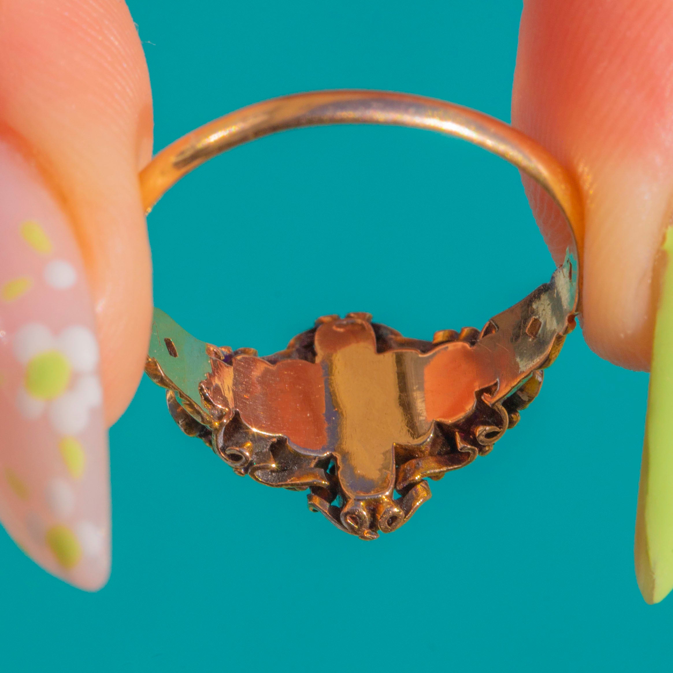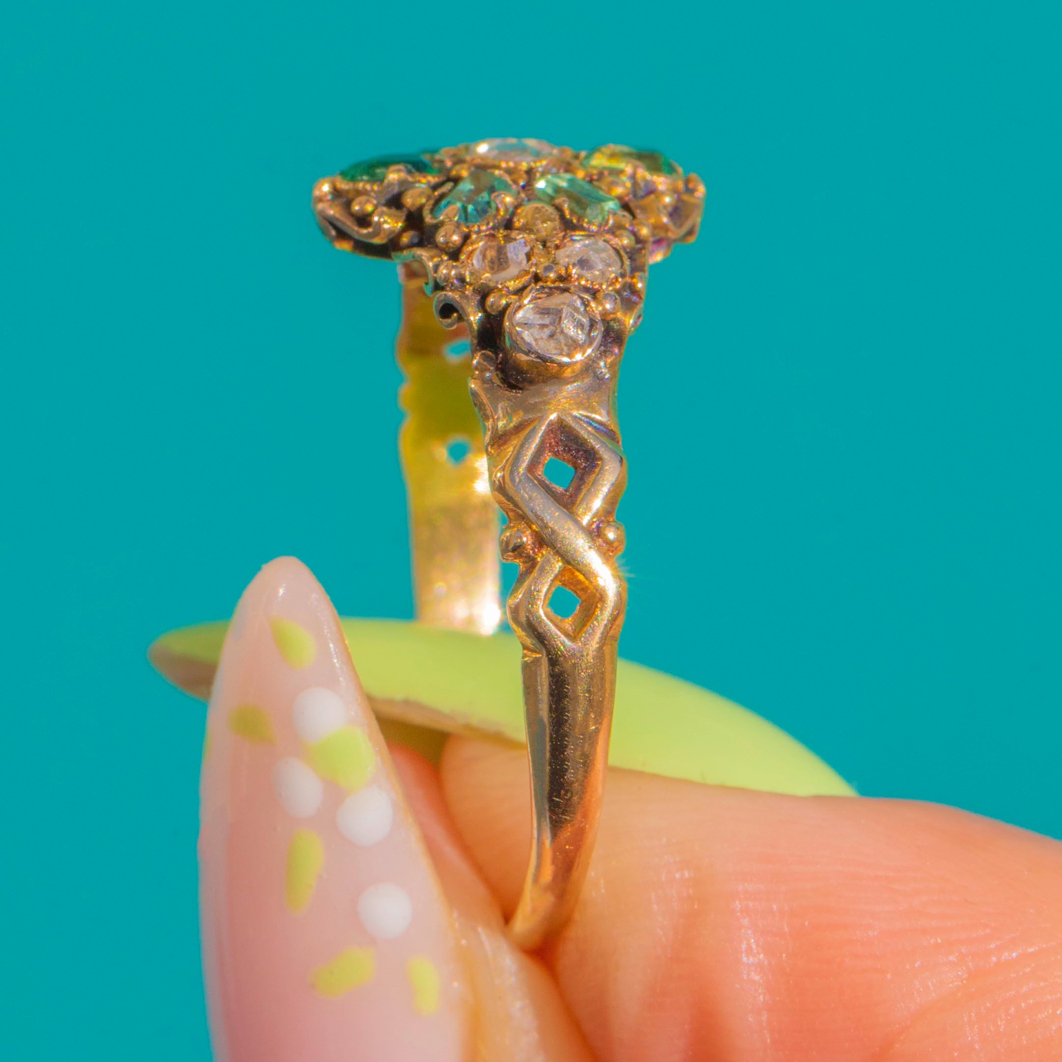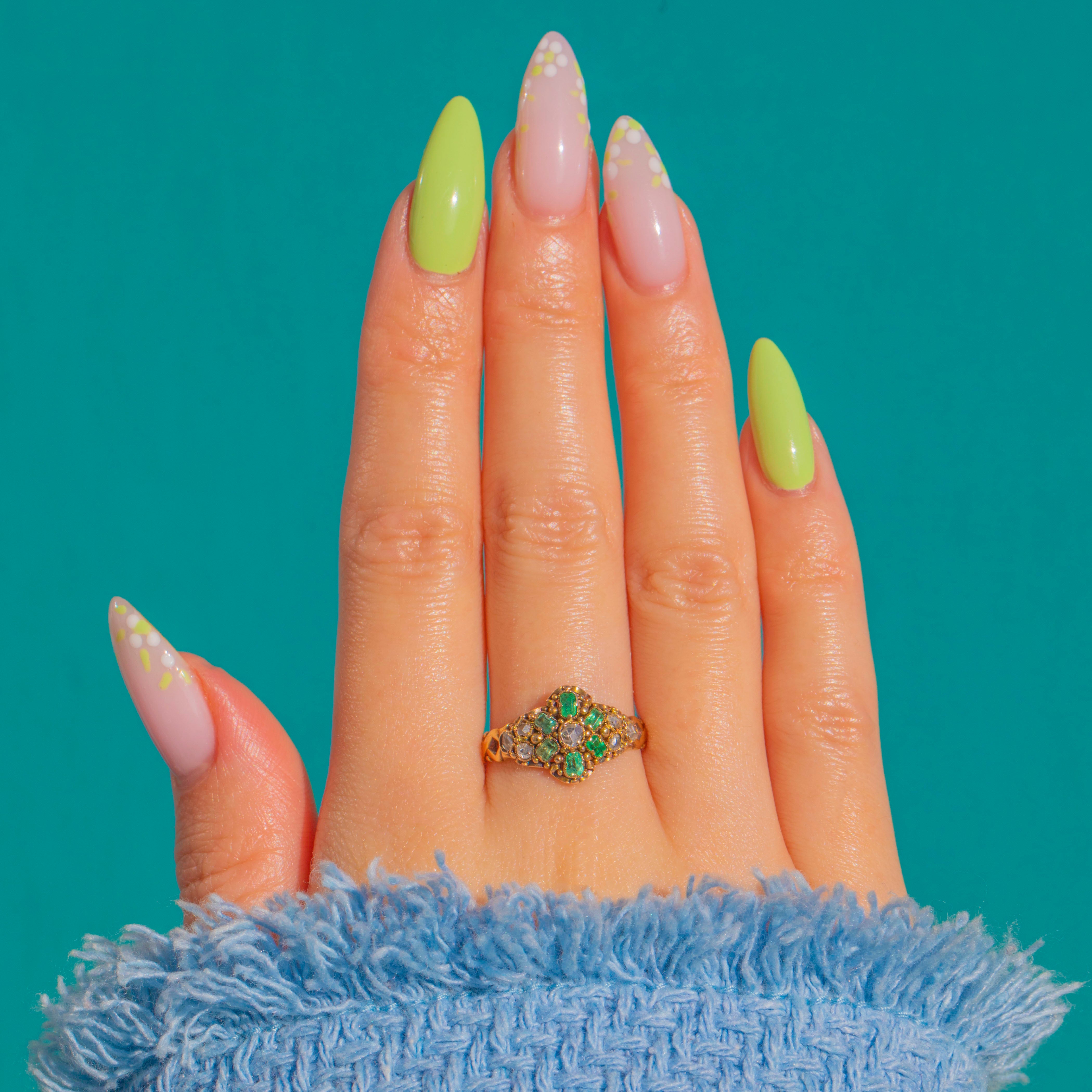 A poetic jewel from the cusp of the Georgian and Victorian eras, this hand-crafted 15ct Gold ring marries vivid natural Emeralds with glittering antique rose-cut Diamonds for an irresistibly romantic glow. The raised, navette-style cluster is richly detailed with granulation and a softly domed profile that catches the light beautifully, just as these charming antique cuts were made to scintillate by candlelight.