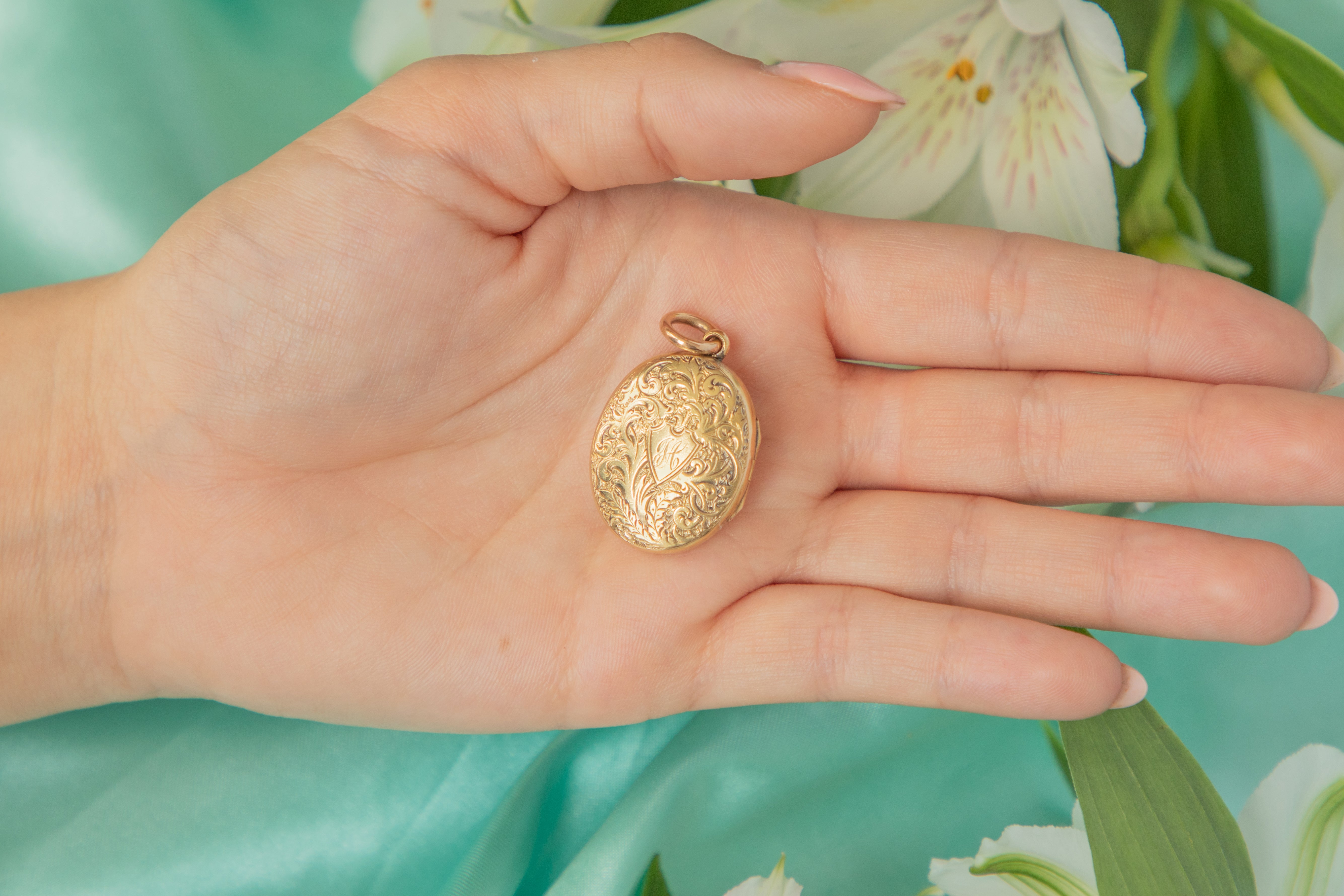 This antique 15ct Gold engraved buckle locket is bursting with character. Classically Victorian, a chunky buckle detail adorns her front with intricate swirl engravings and an initialed shield cartouche on her back.