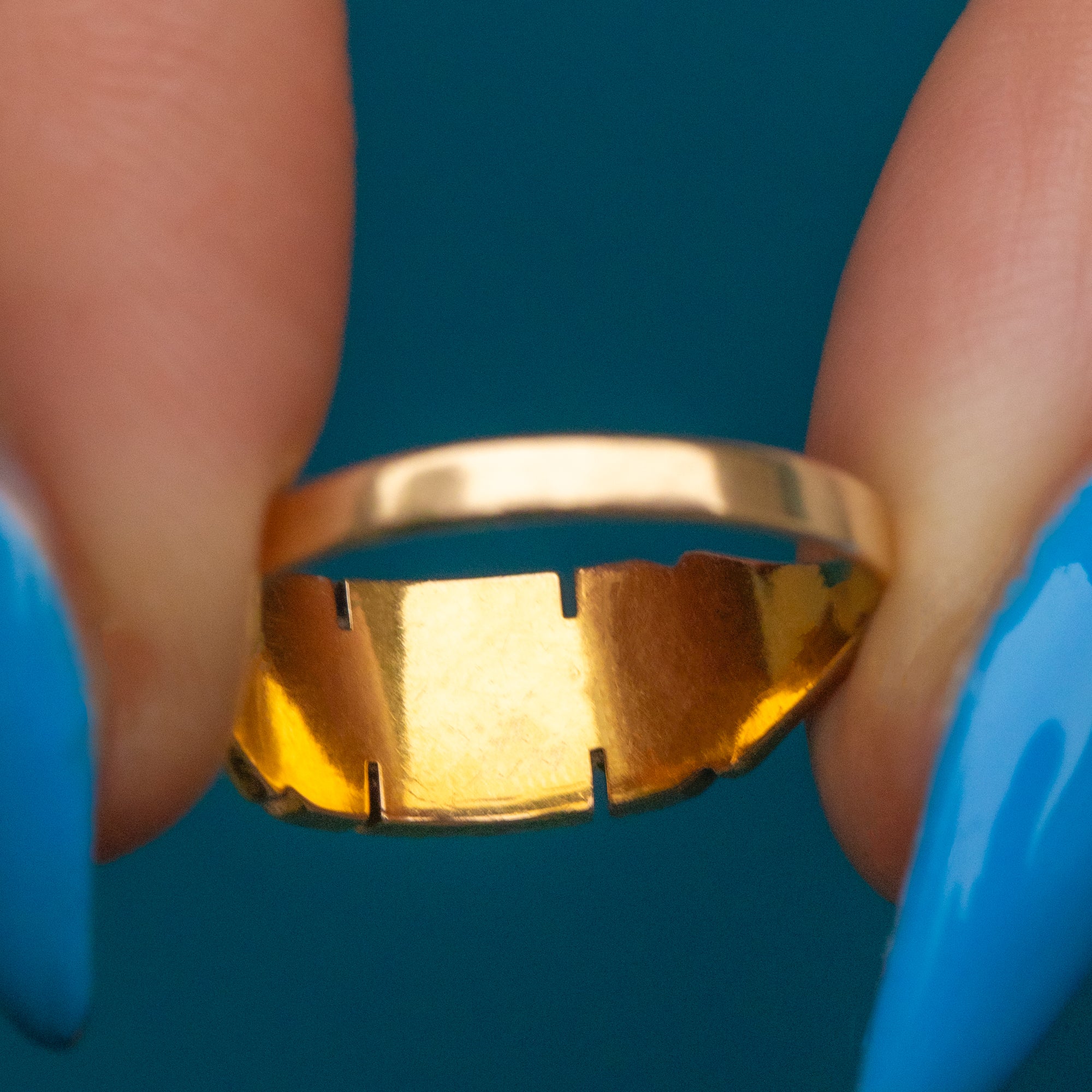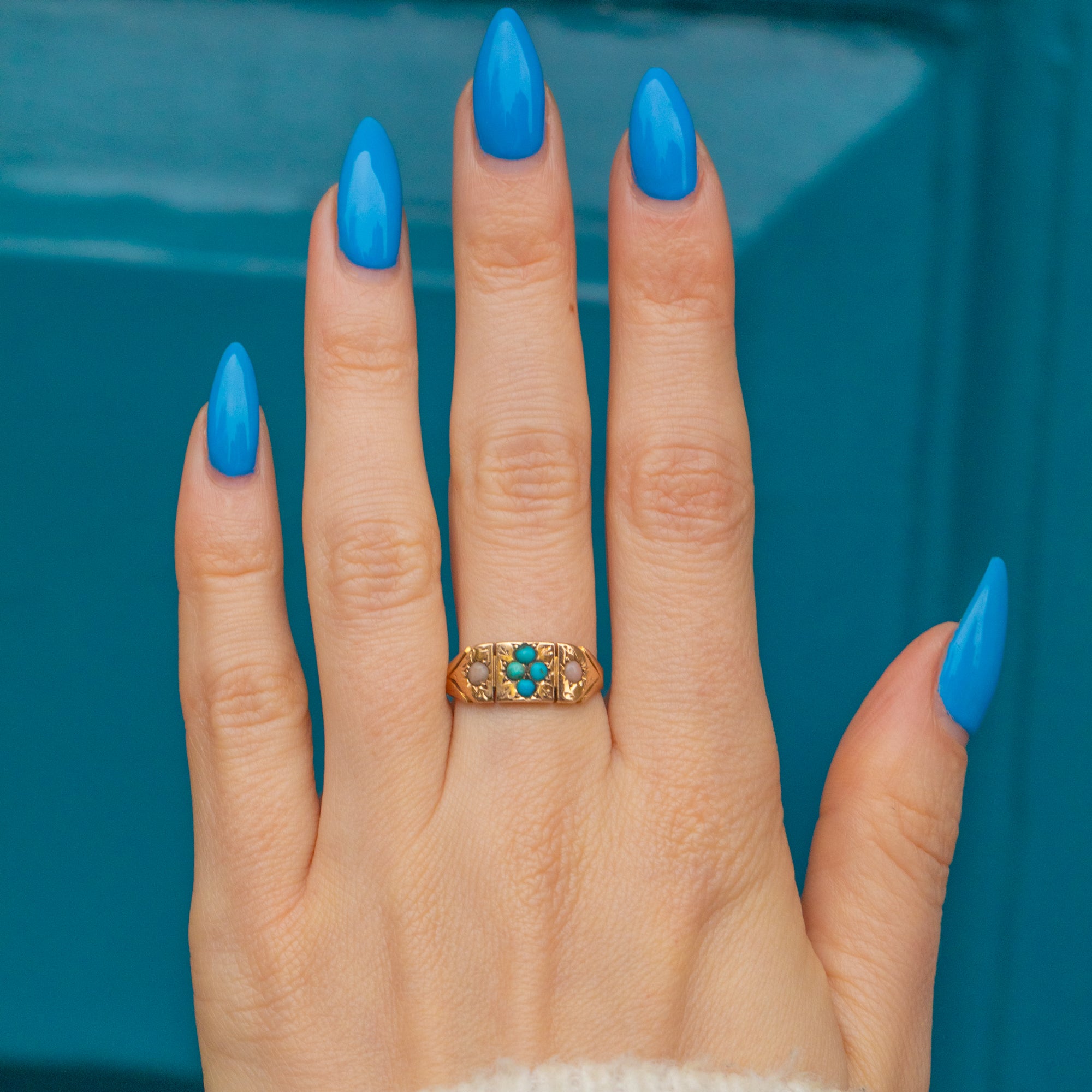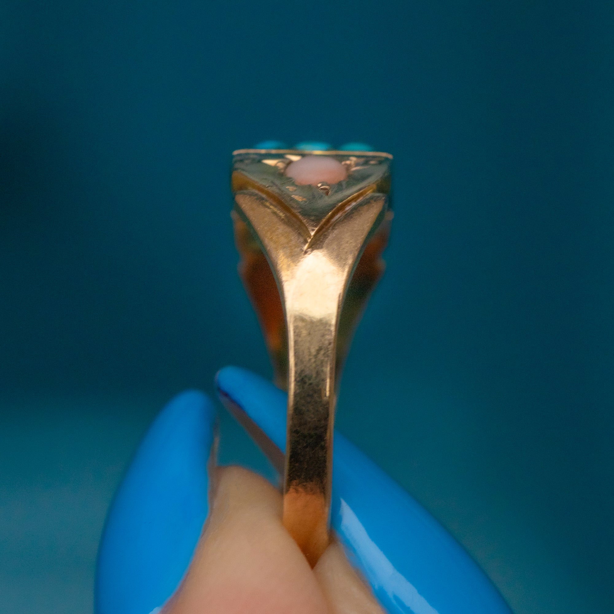 This antique 15ct Gold engraved Turquoise Coral gypsy ring will make an enchanting addition to your curated ring stack! Crafted entirely from richly saturated, rare 15ct Gold, this Victorian gypsy ring is studded with vibrant sky-blue Turquoise cabochons and pale Coral framed by bold geometric settings and delicate engravings, creating a striking piece.