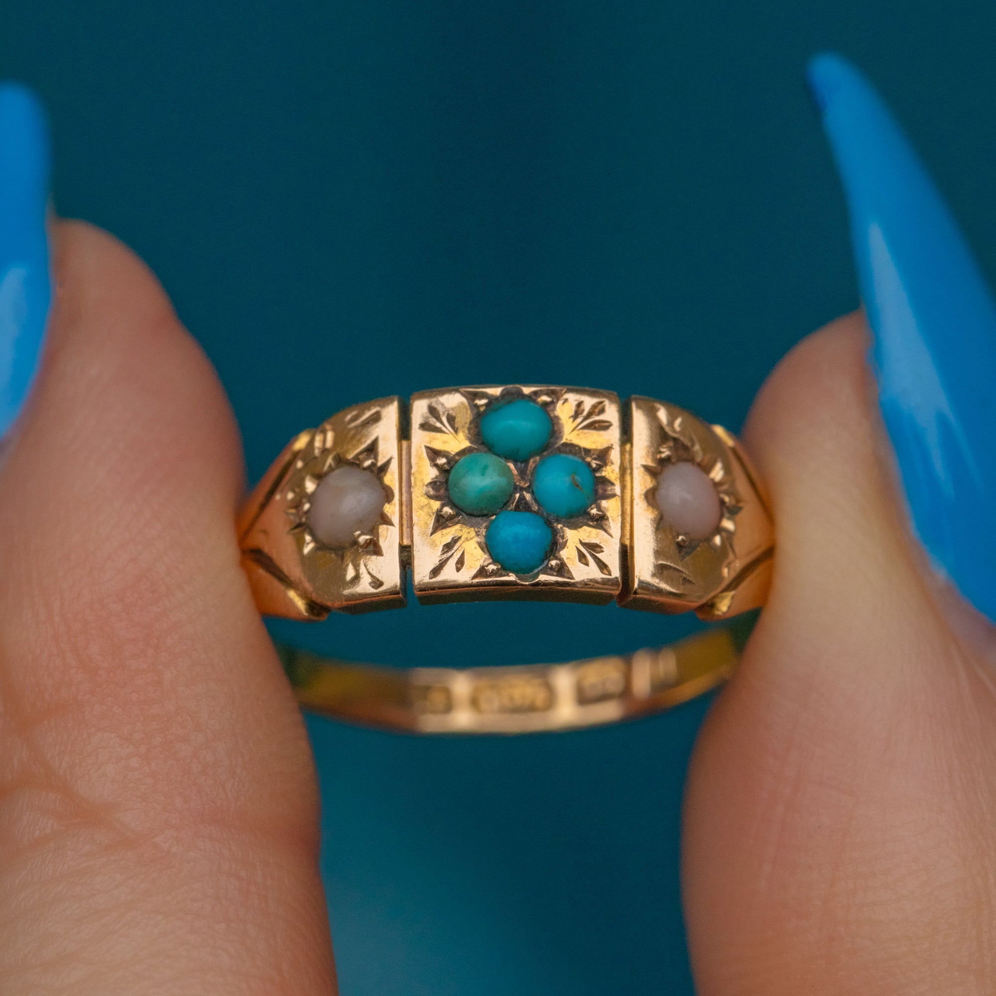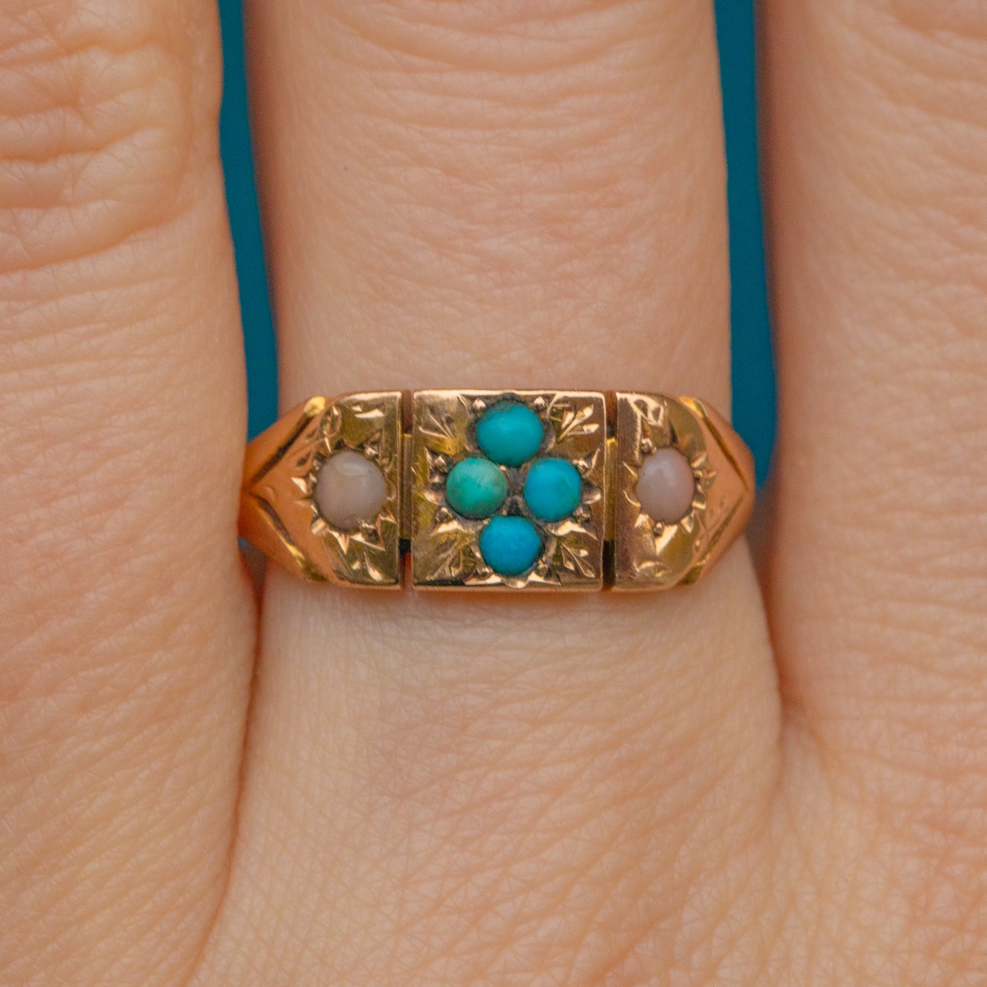 Antique 15ct Gold Engraved Turquoise Coral Gypsy Ring, c.1888
